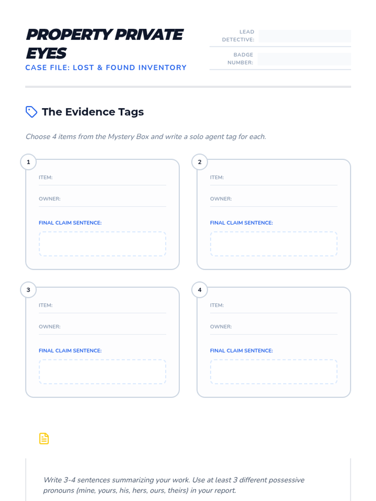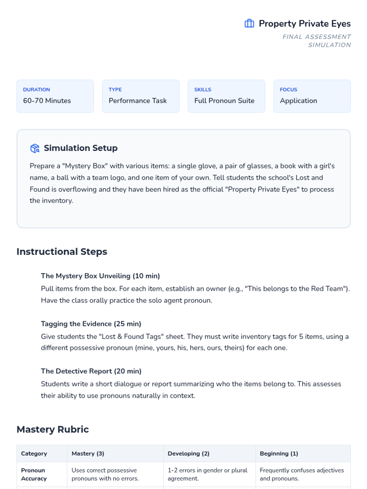 The cumulative project where students act as detectives to return items from a mystery box. They write tags and dialogue using a variety of possessive pronouns to demonstrate mastery.