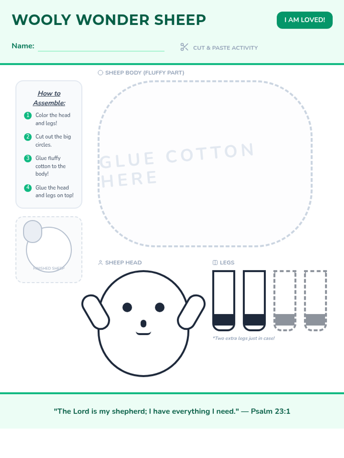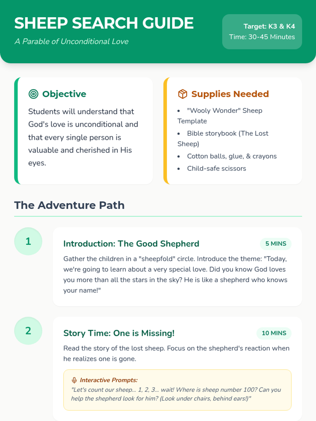 A gentle introduction to God's unconditional love through the parable of the Lost Sheep, designed specifically for K3 and K4 students with interactive storytelling and a hands-on craft.