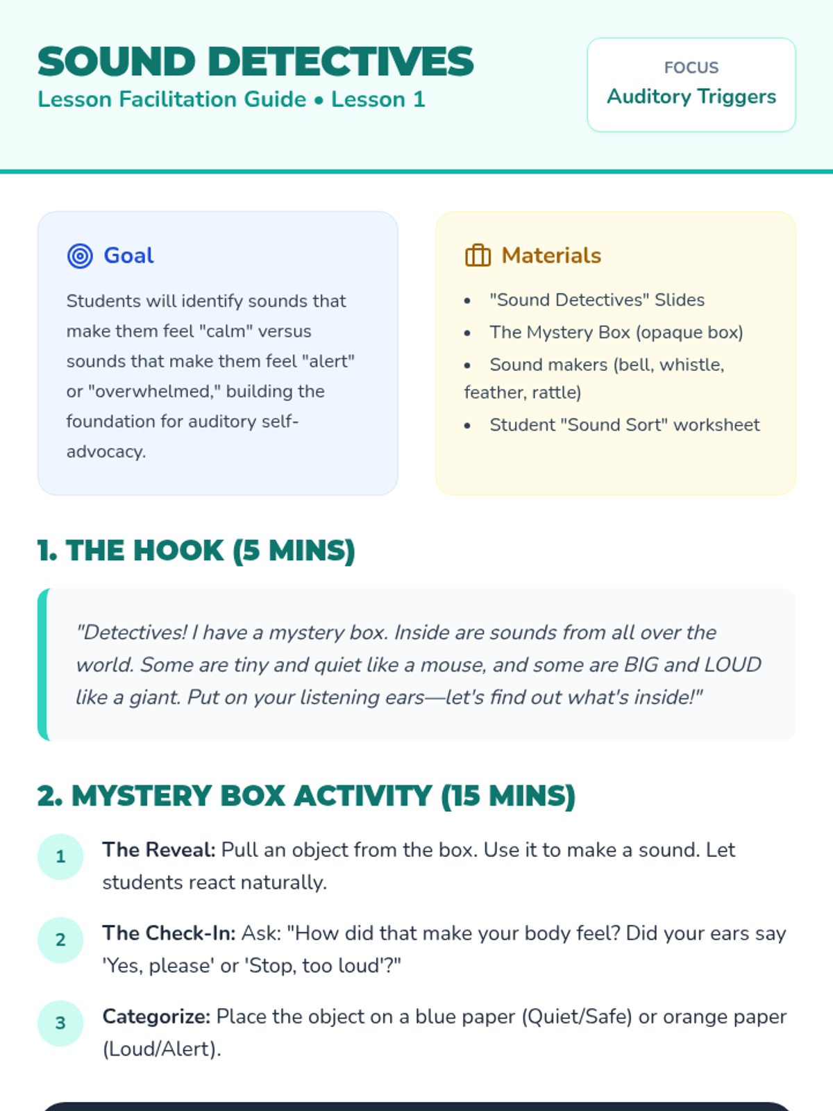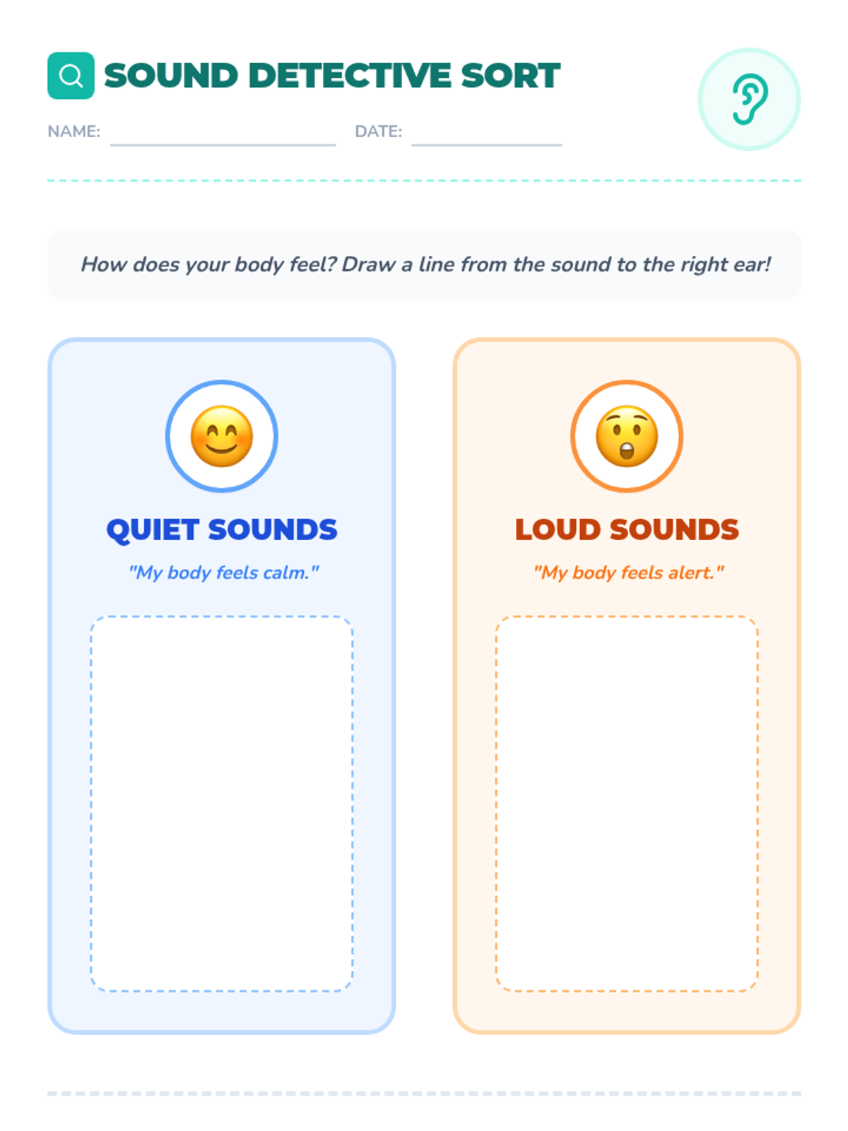 Students explore auditory triggers by categorizing sounds as 'soft/safe' or 'loud/alert,' learning how noise levels affect their bodies.
