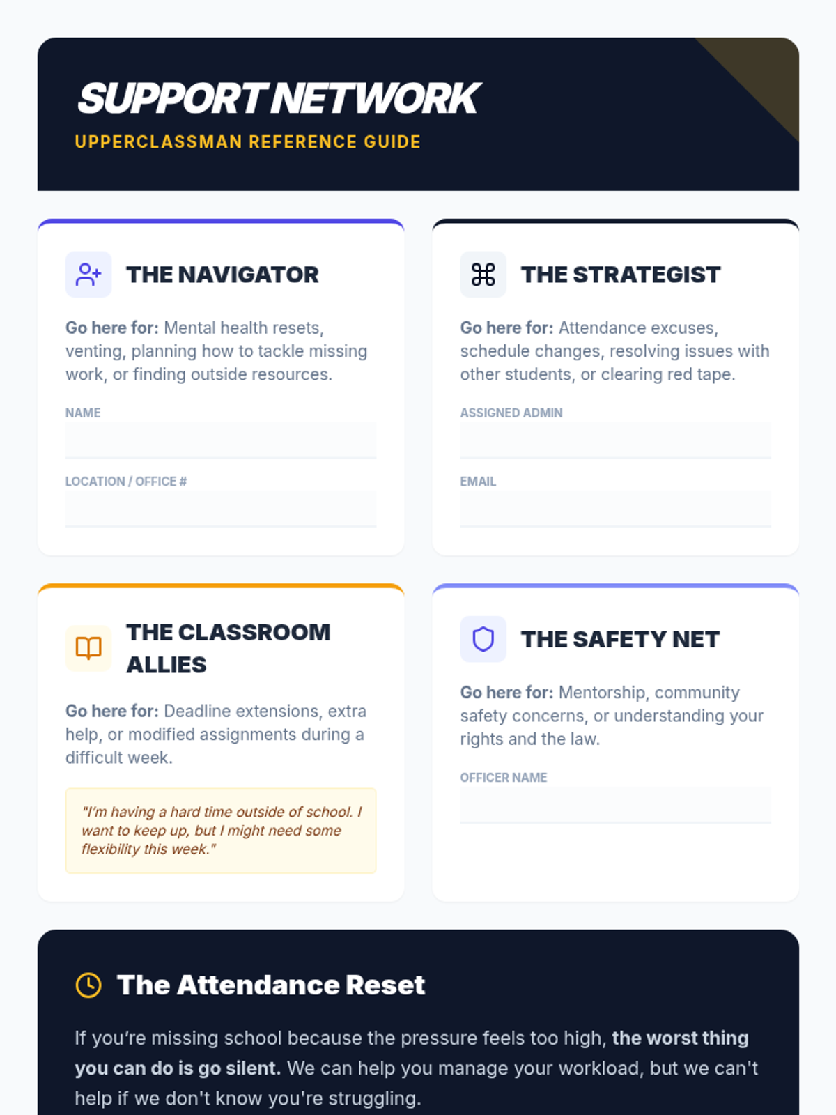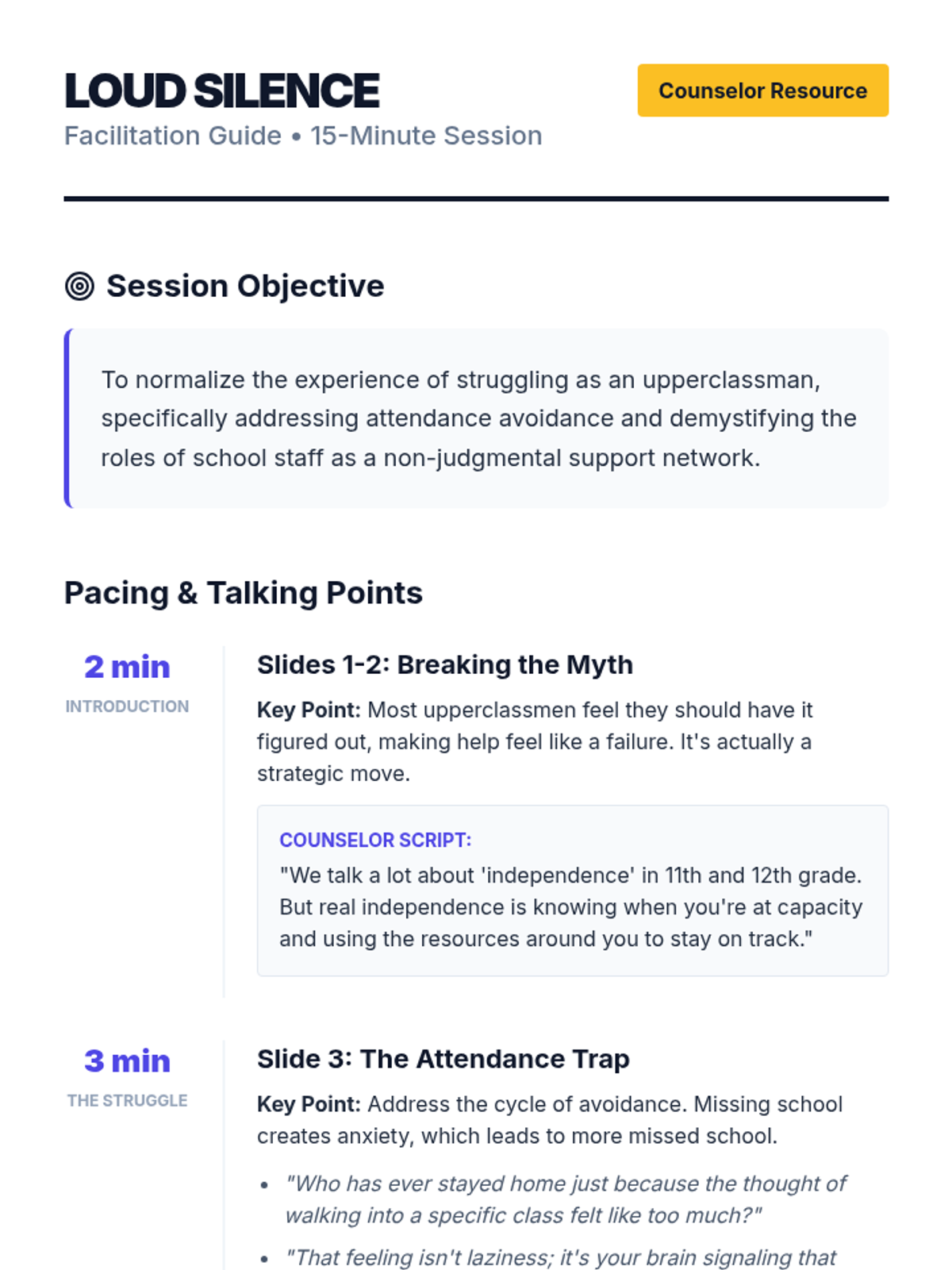A lesson designed for upperclassmen to demystify school support systems, addressing attendance issues and the stigma of seeking help.