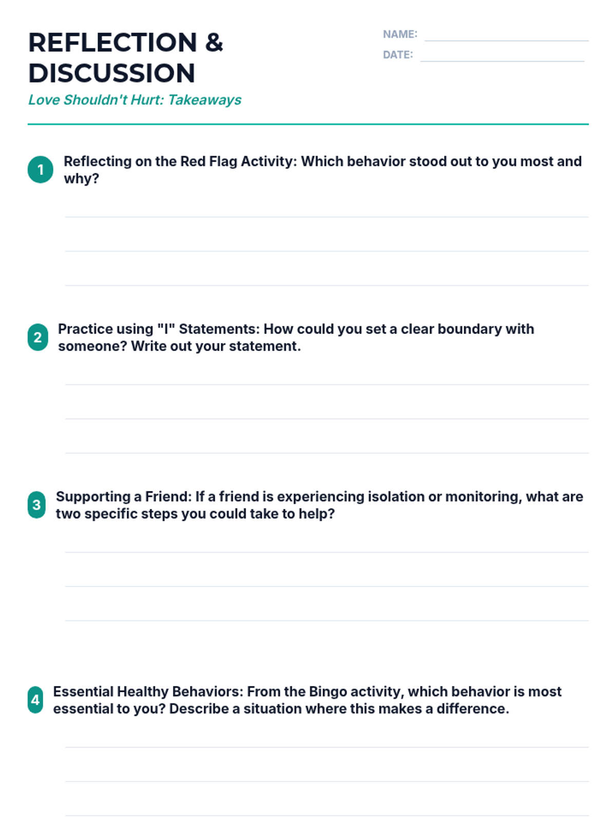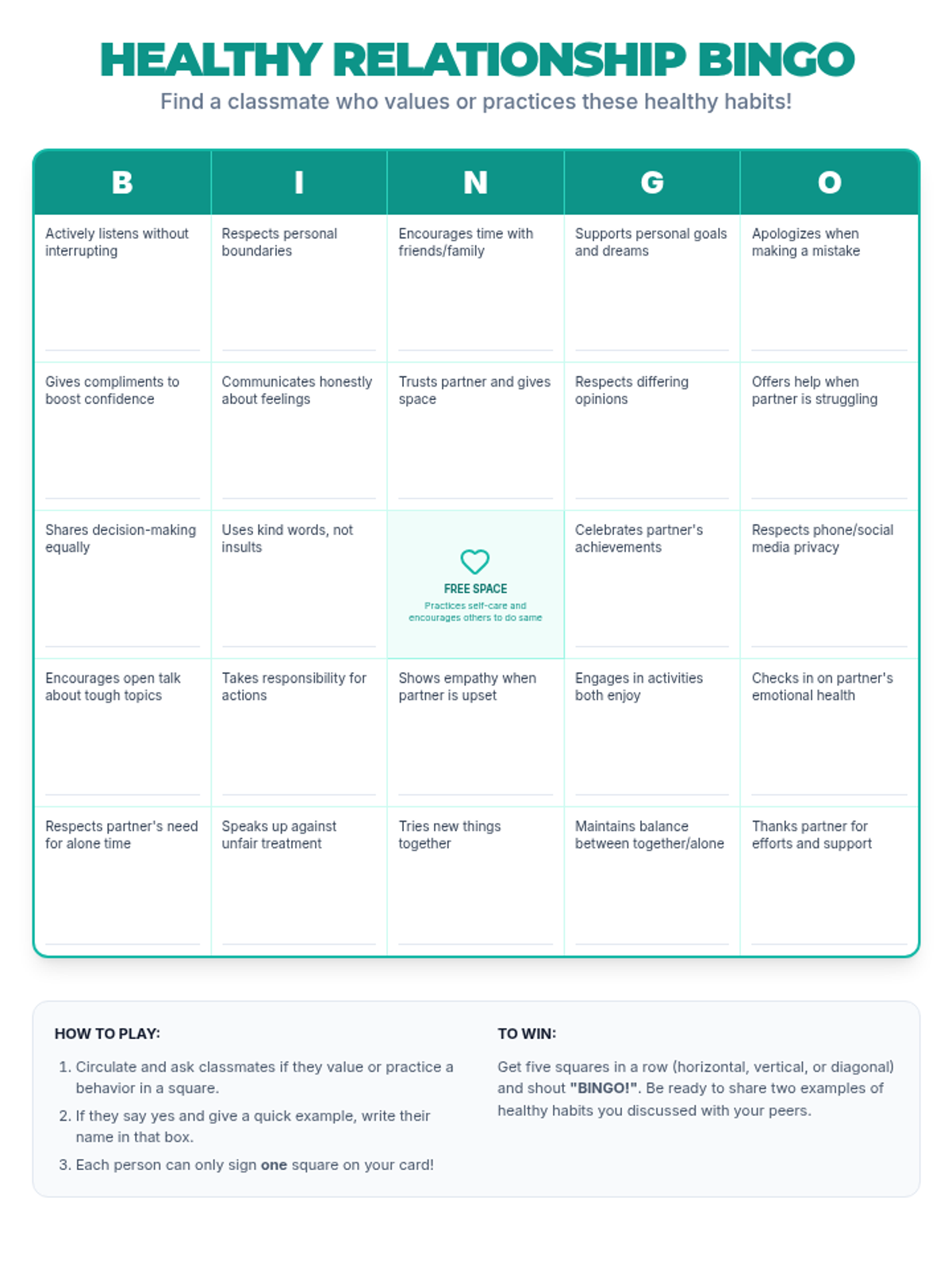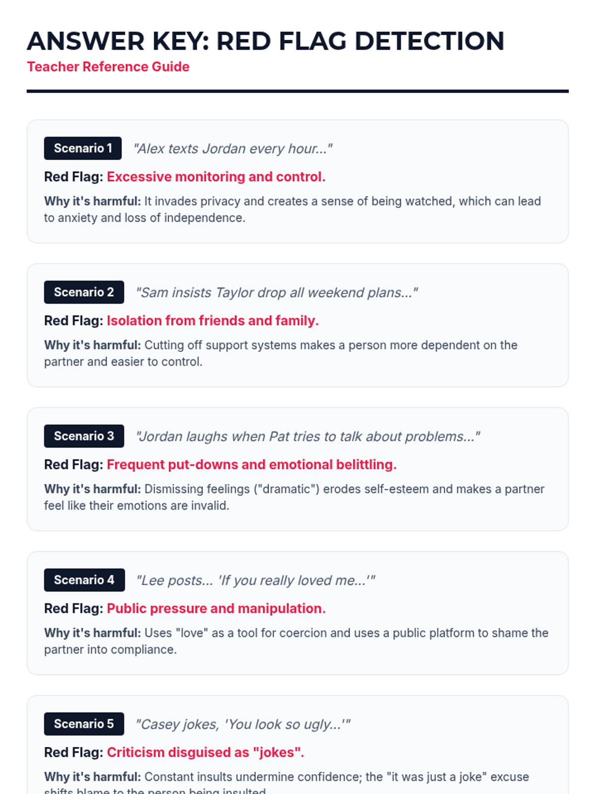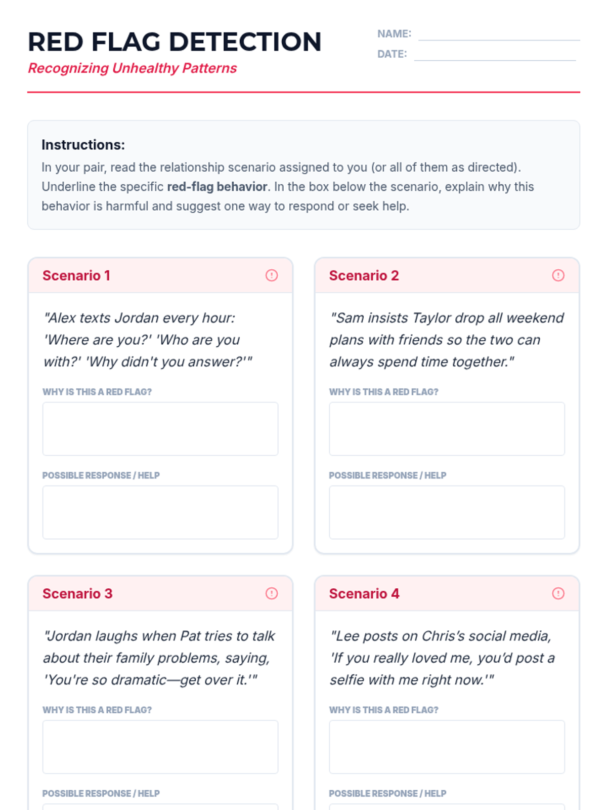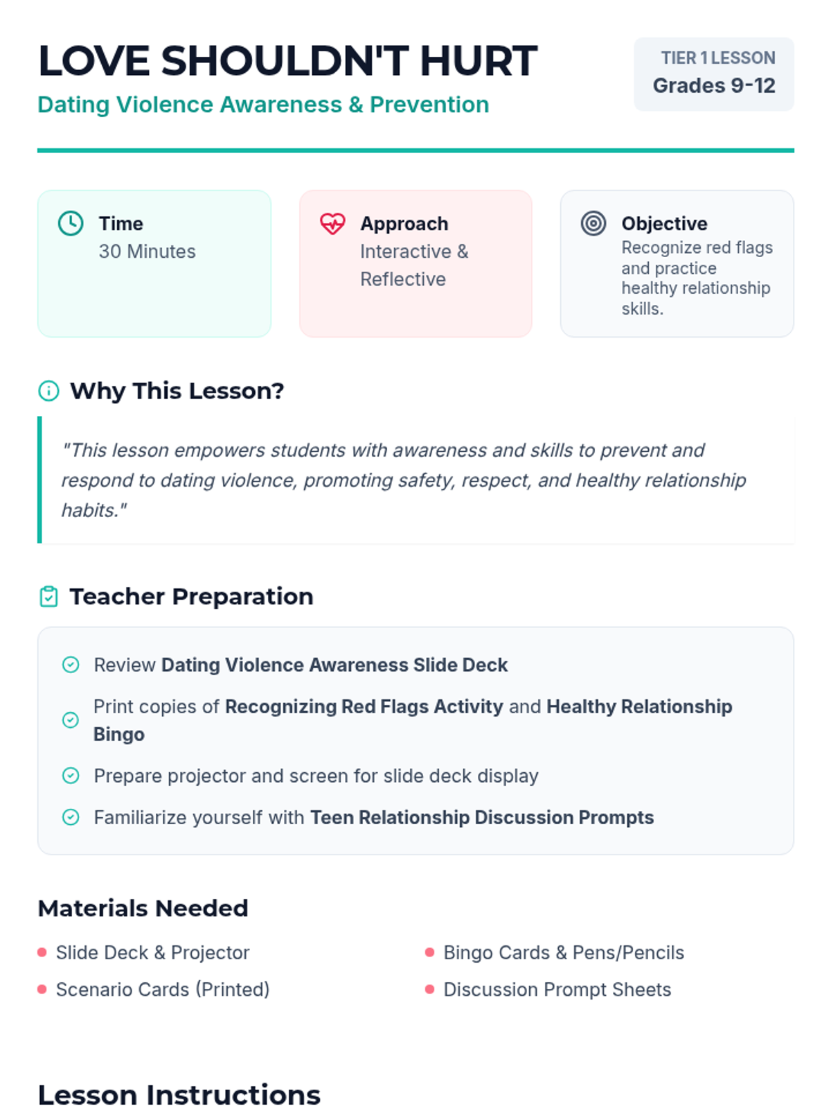 A 30-minute Tier 1 lesson for grades 9-12 focusing on recognizing teen dating violence red flags, fostering healthy relationship habits, and practicing real-life responses to unhealthy behaviors.