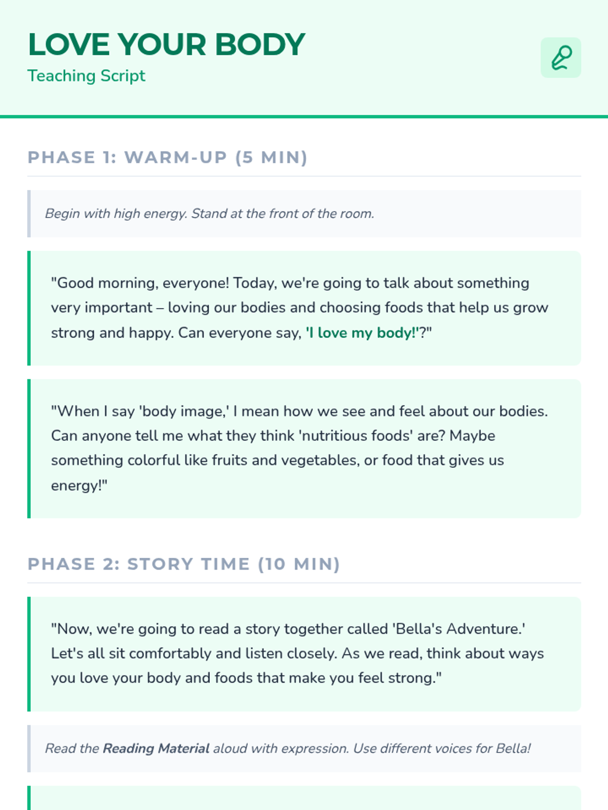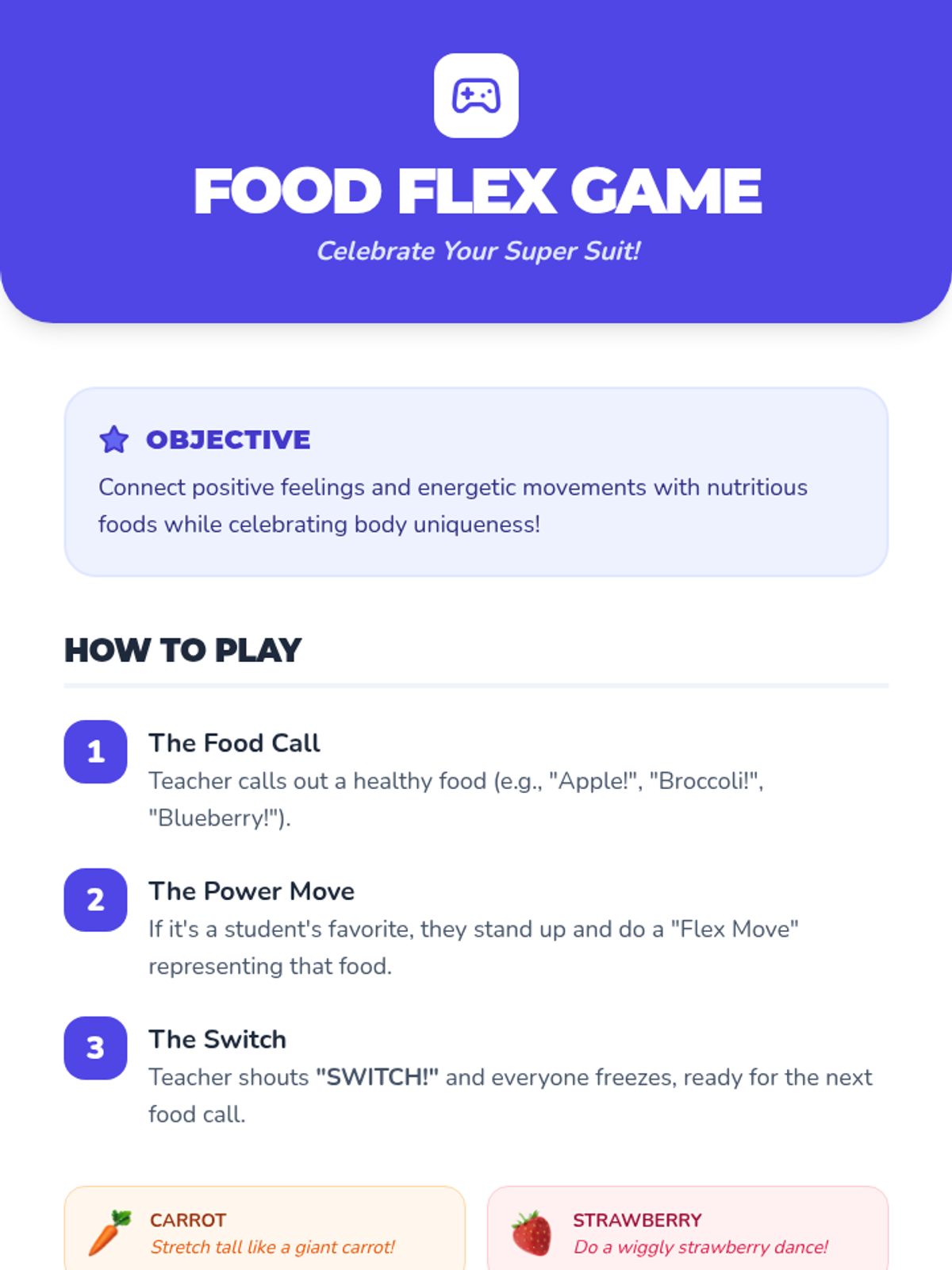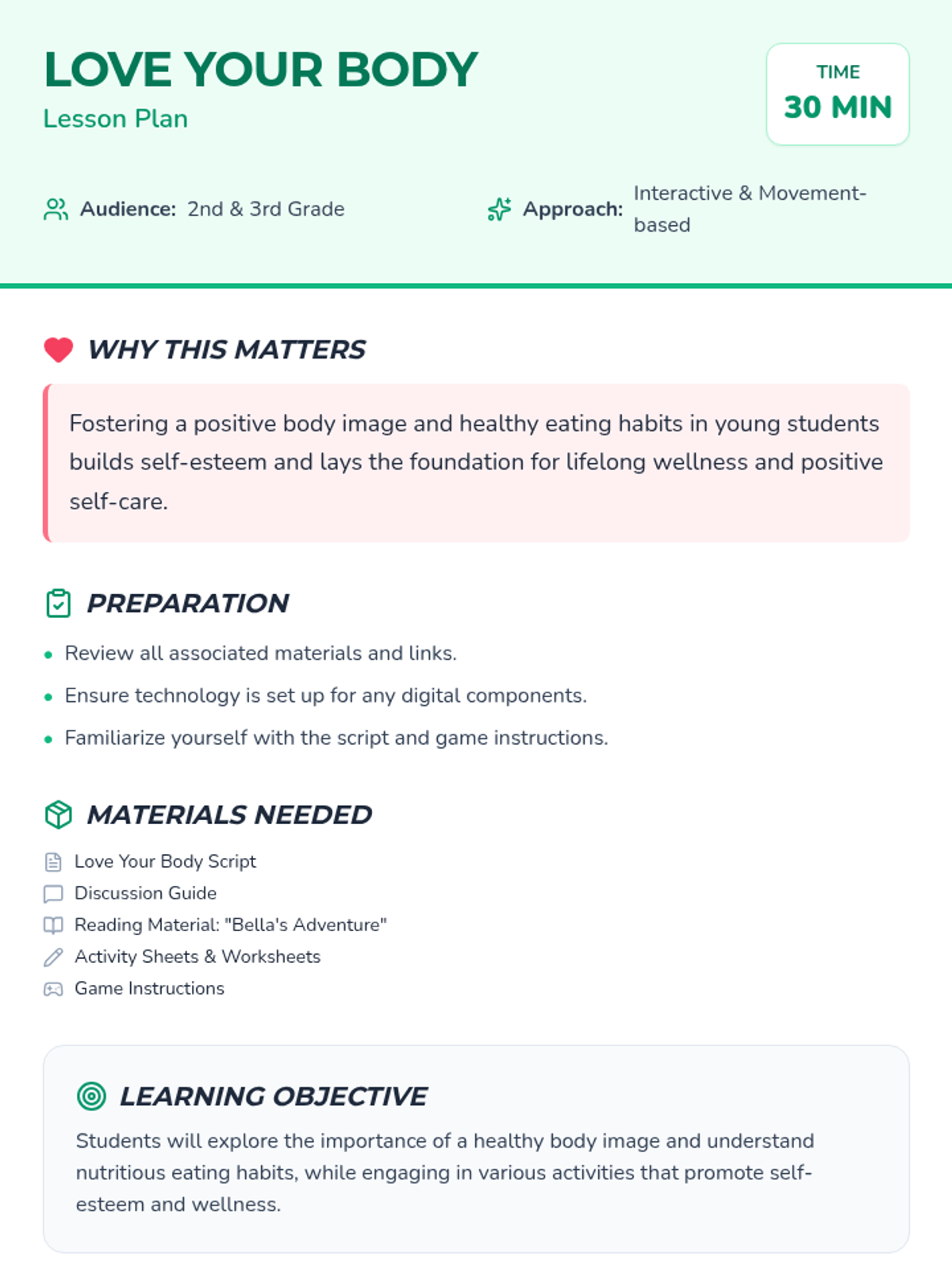 A 30-minute lesson for 2nd and 3rd graders to foster a positive body image and understand nutritious eating habits through stories, discussion, and movement.