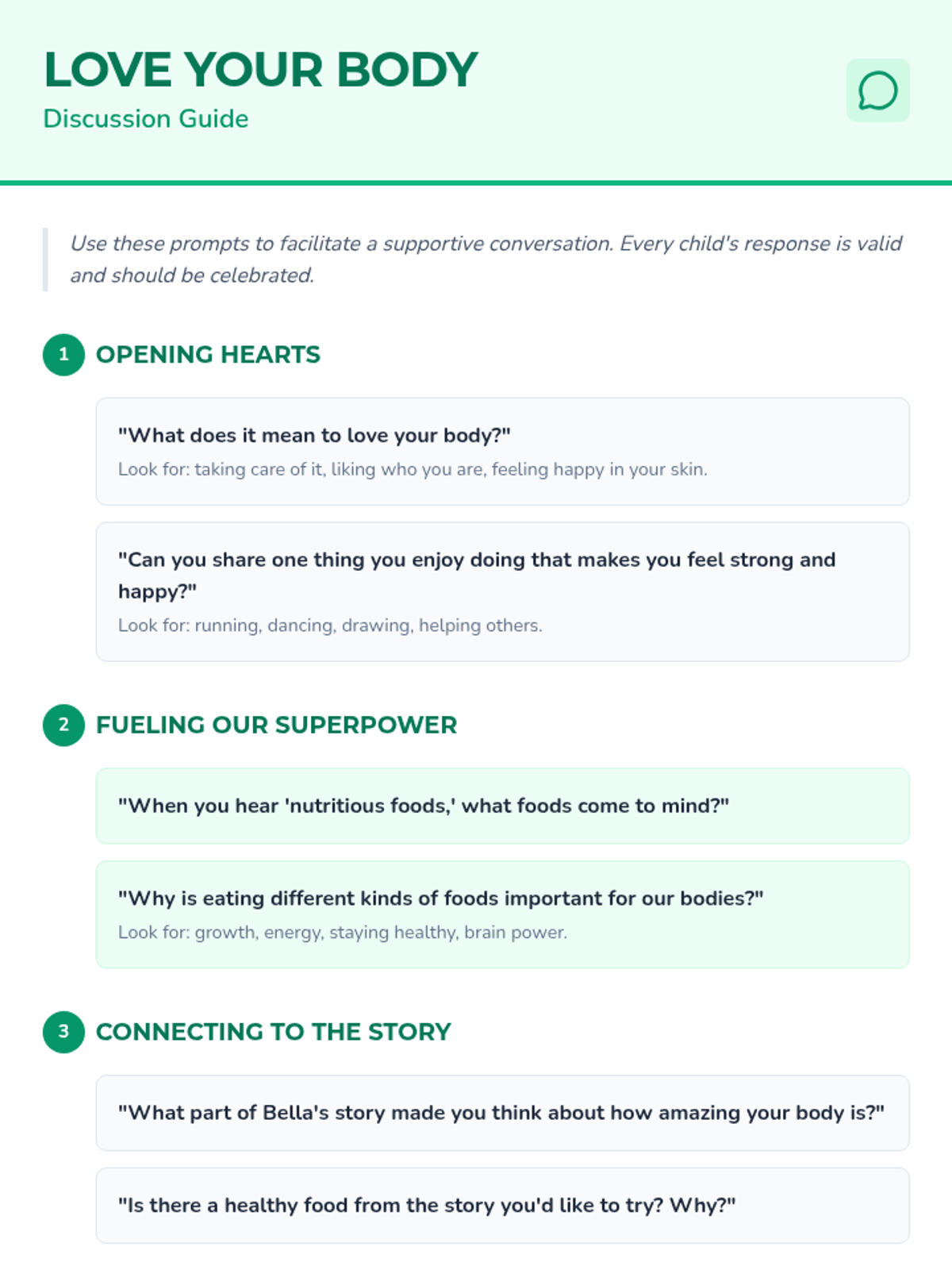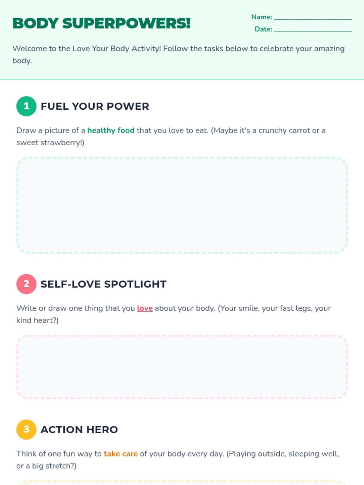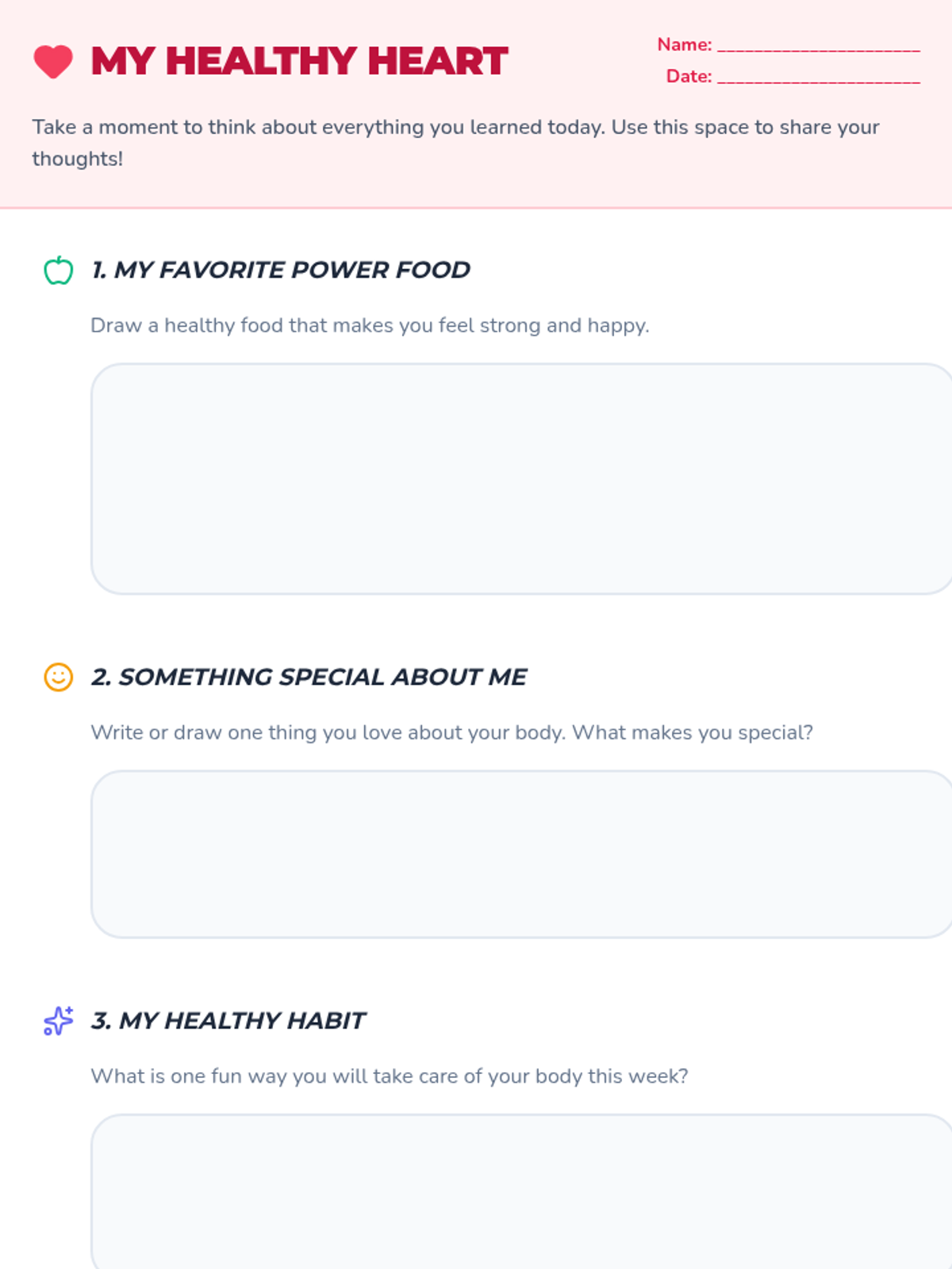 A 30-minute lesson for 2nd and 3rd graders to foster a positive body image and understand nutritious eating habits through stories, discussion, and movement.