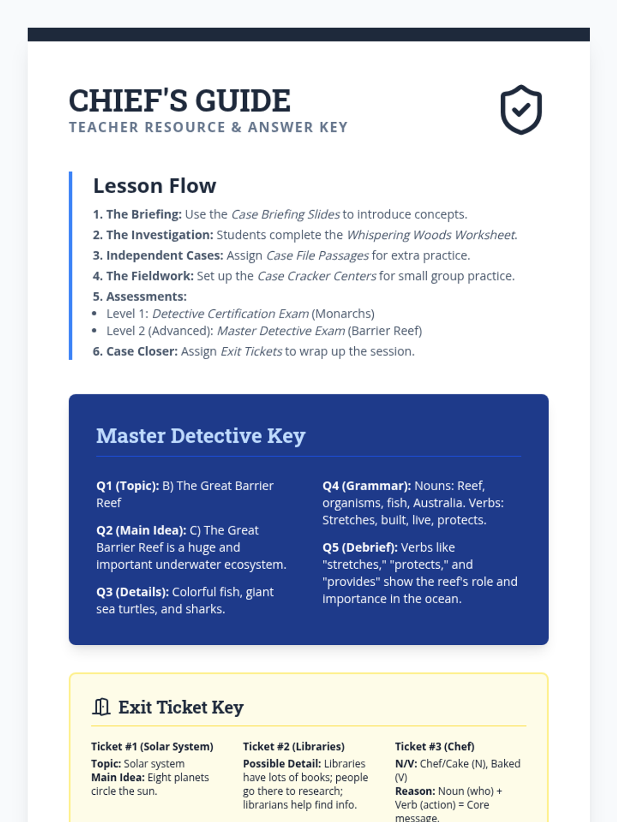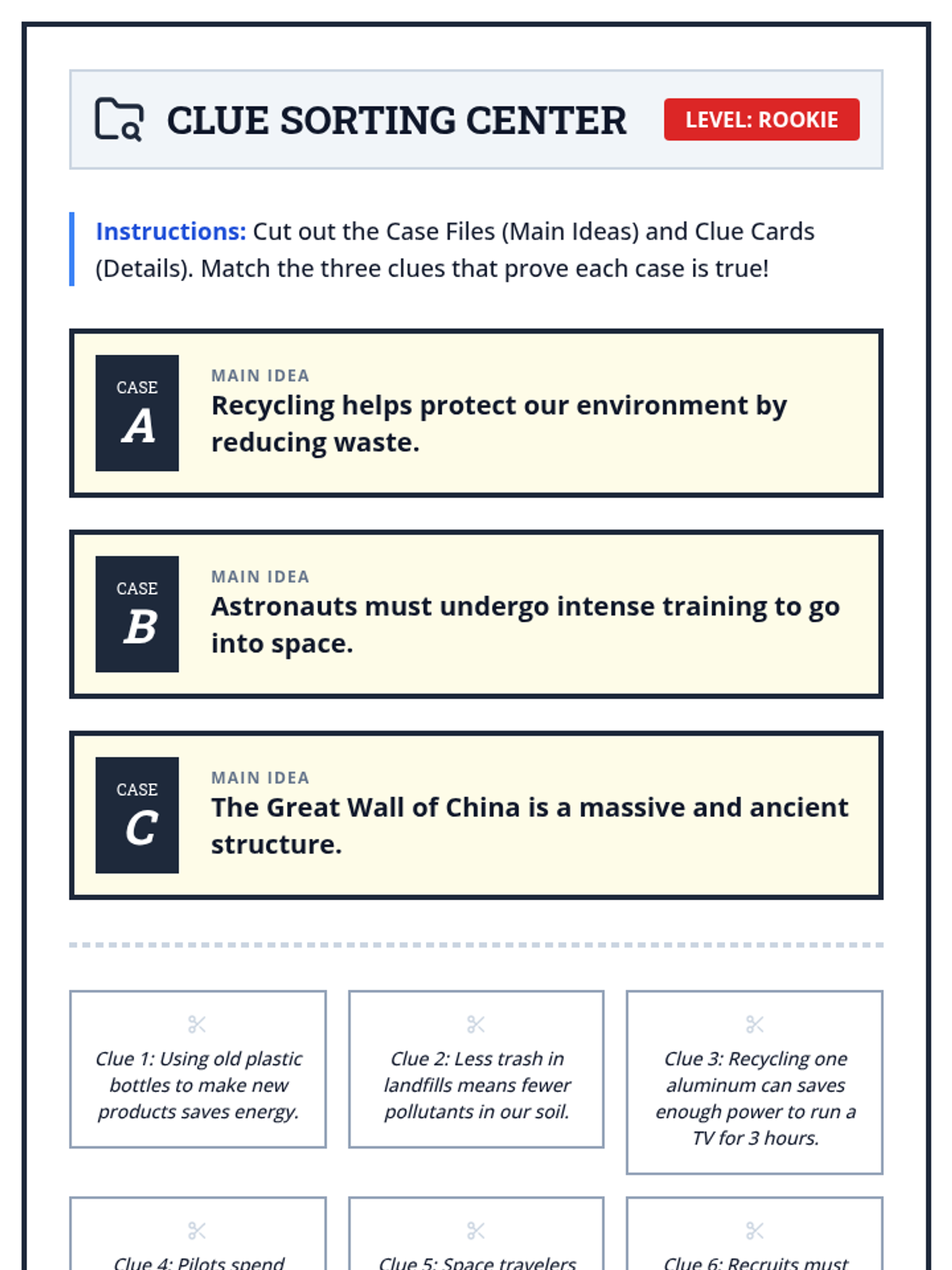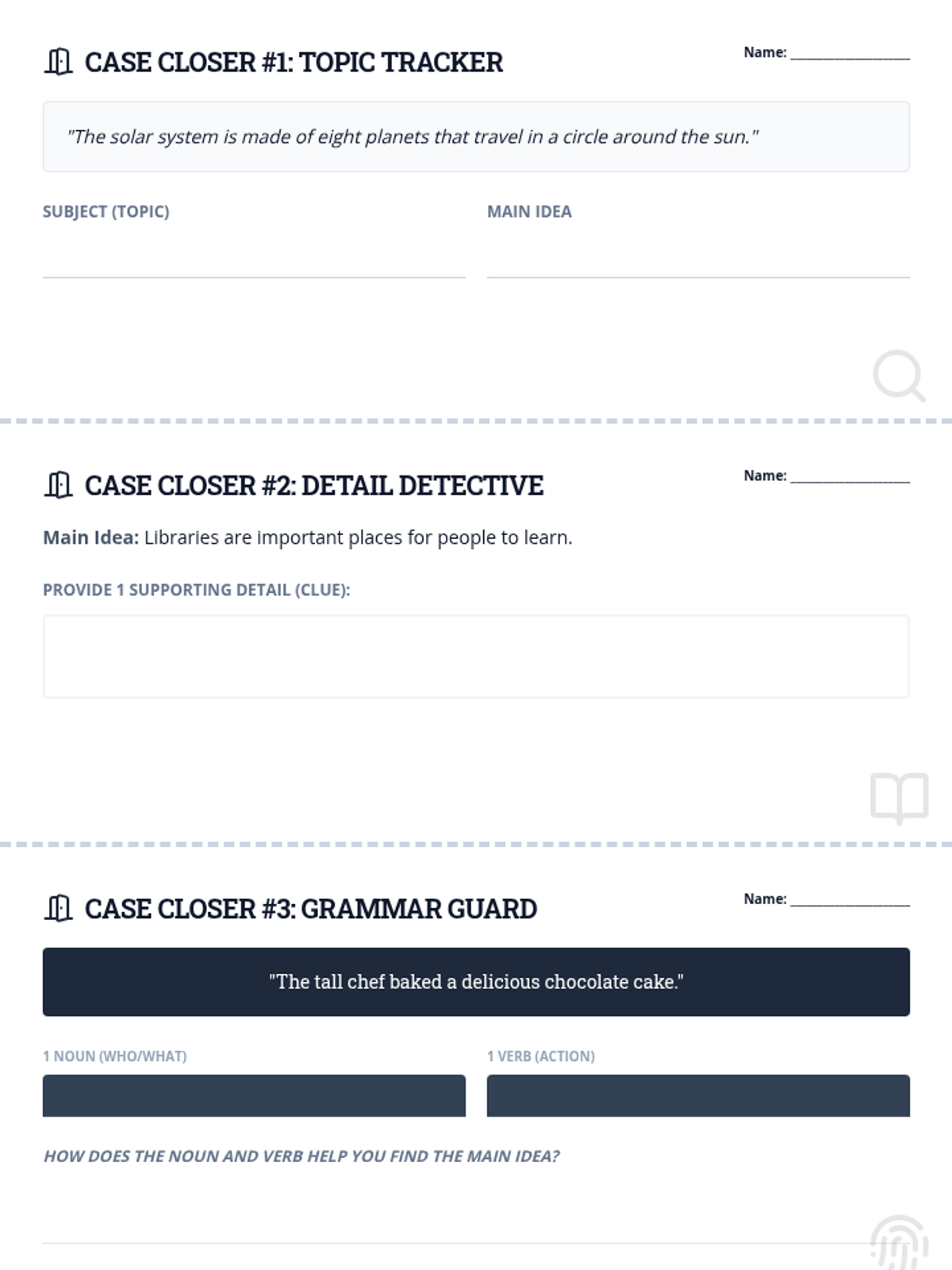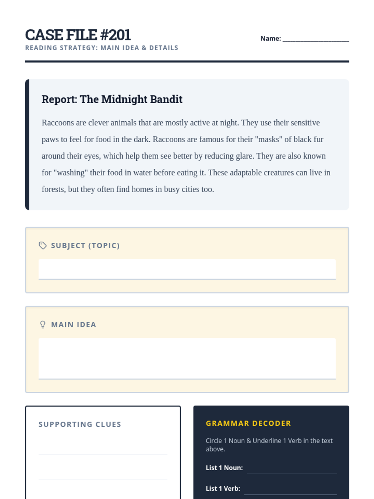 A detective-themed lesson where students learn to distinguish between topics, main ideas, and supporting details while using grammar clues to decode texts.