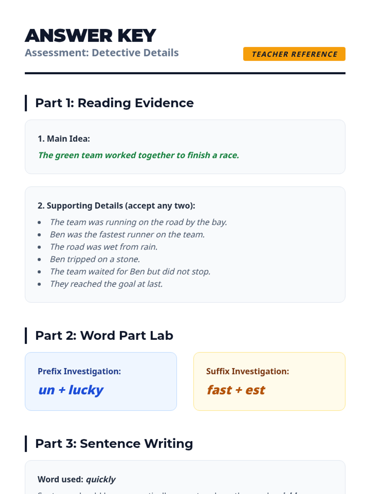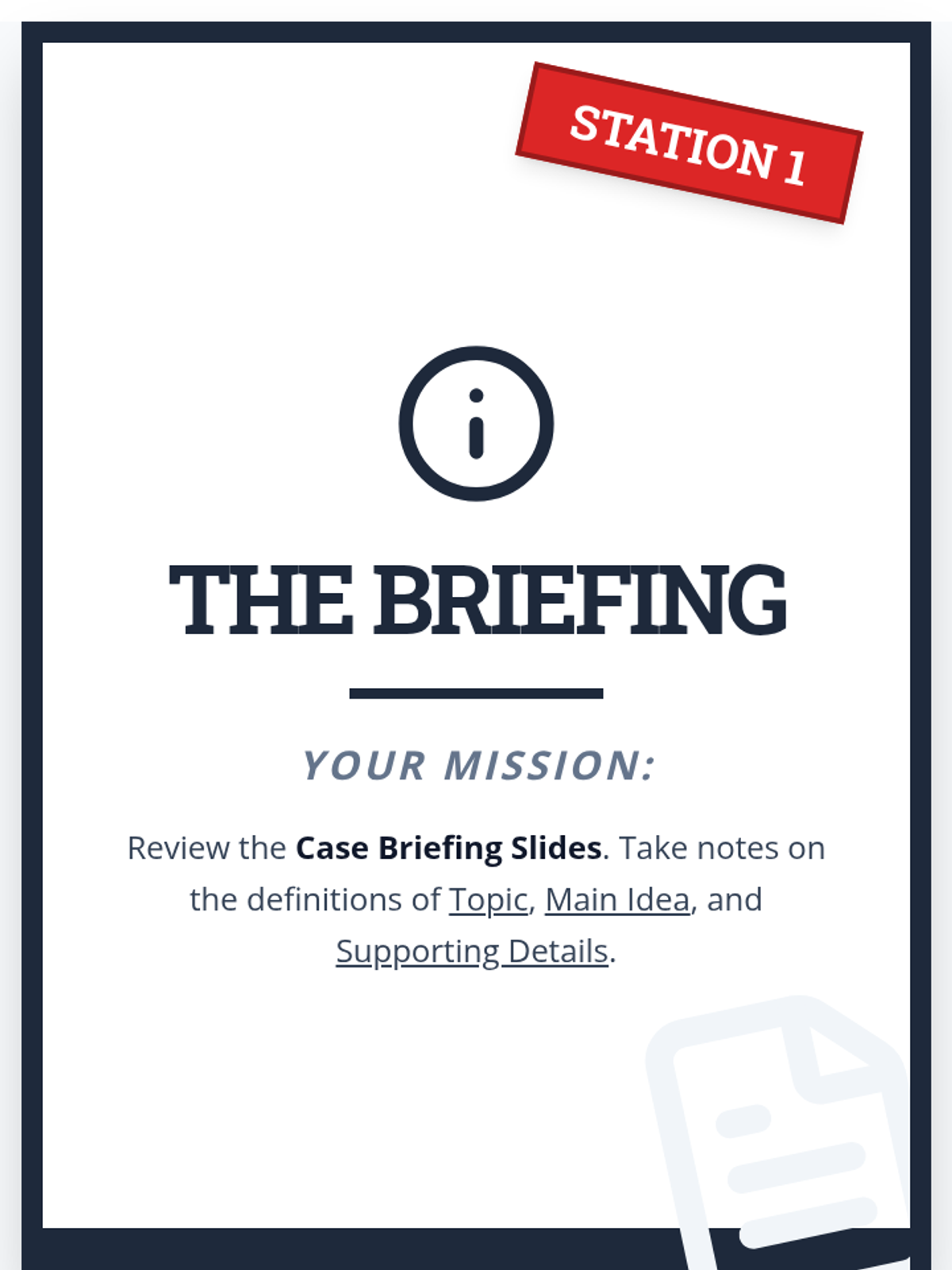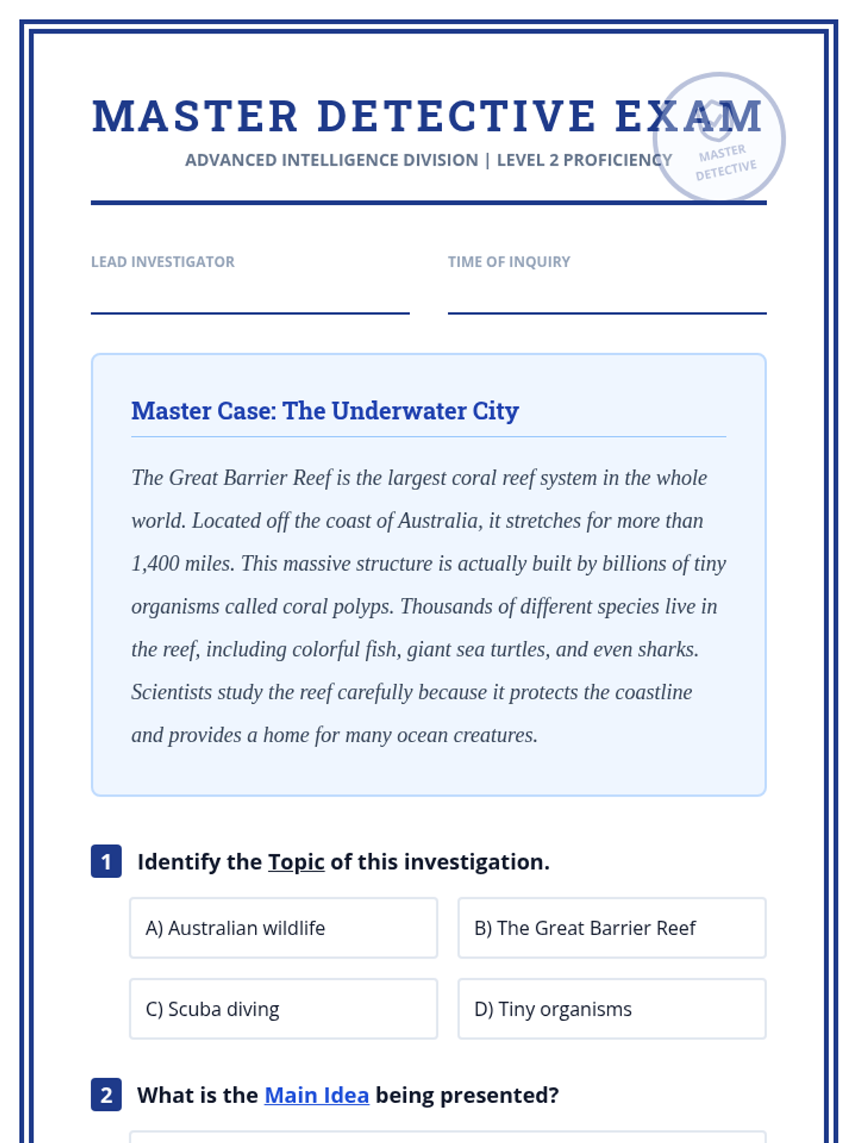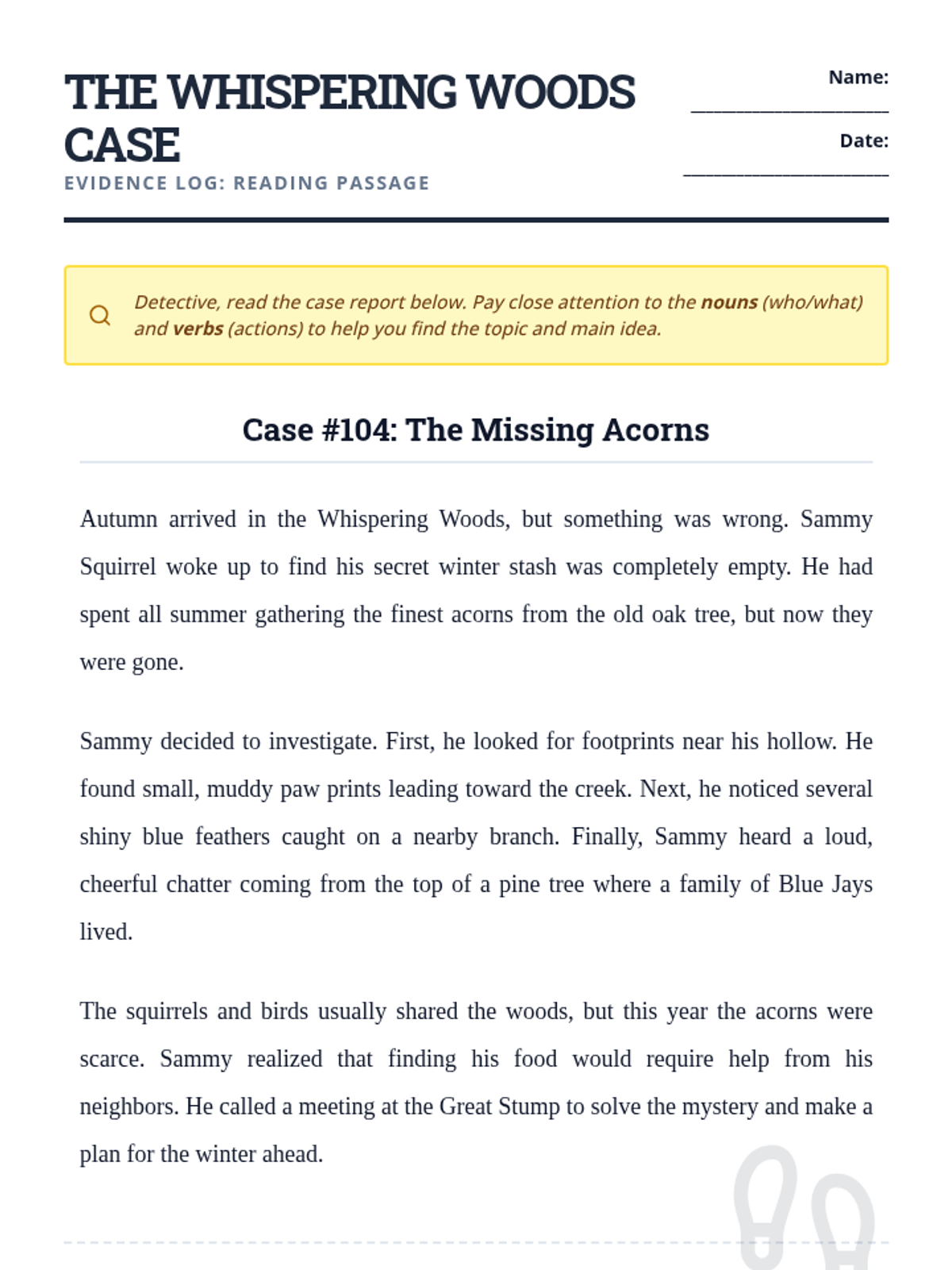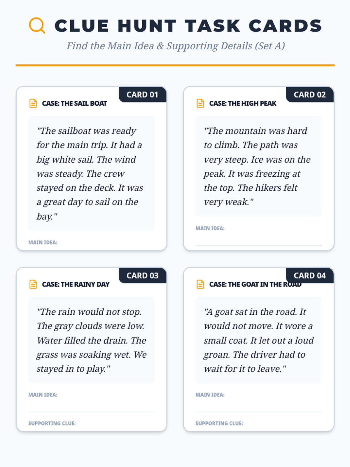 A detective-themed lesson where students learn to distinguish between topics, main ideas, and supporting details while using grammar clues to decode texts.