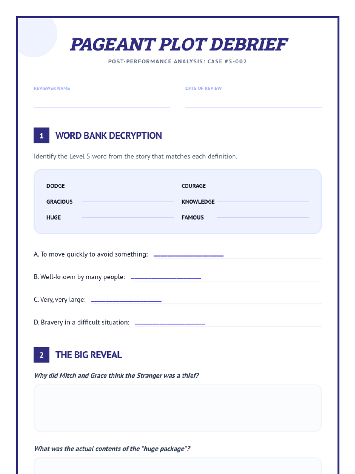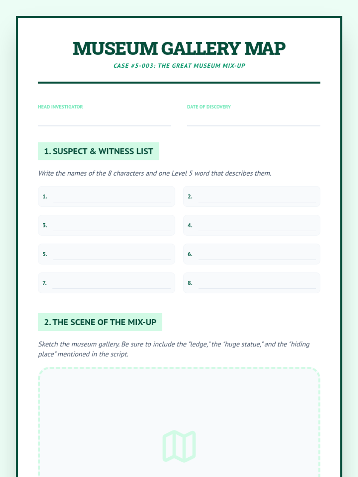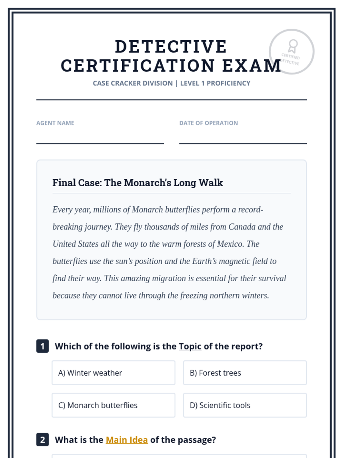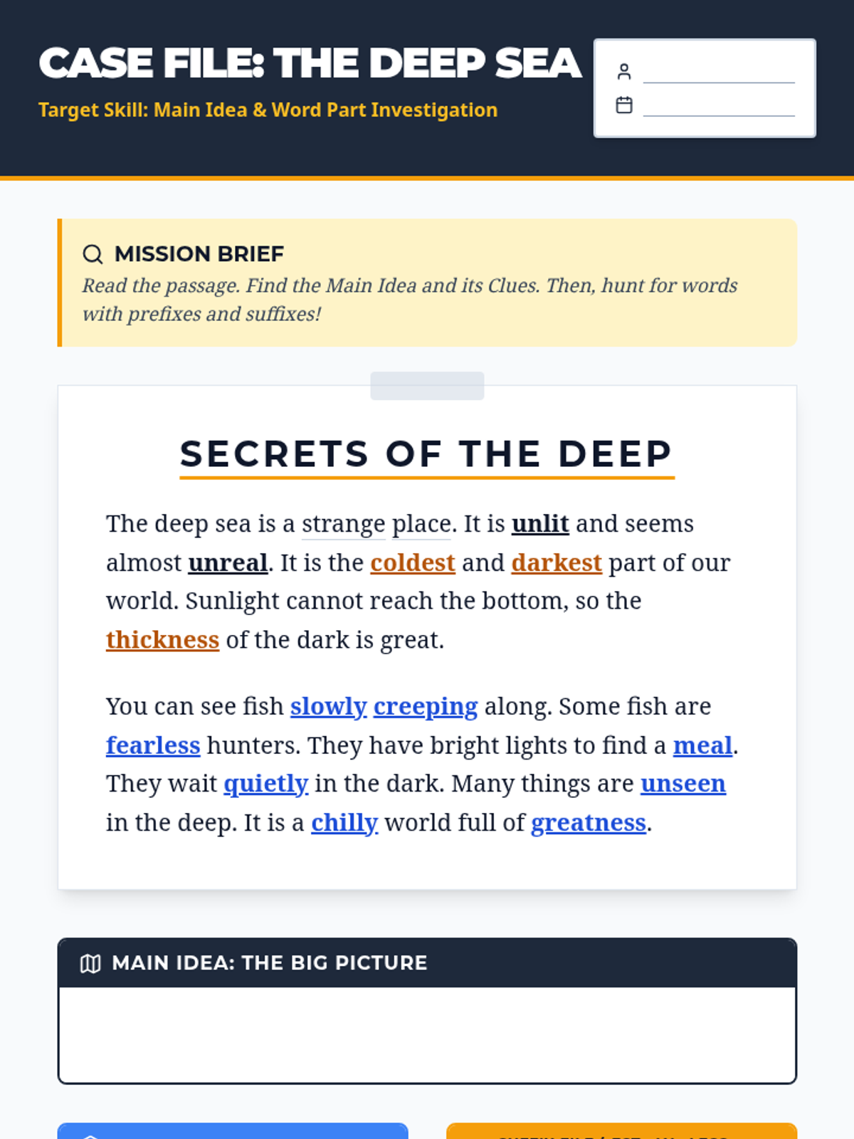 A detective-themed lesson where students learn to distinguish between topics, main ideas, and supporting details while using grammar clues to decode texts.