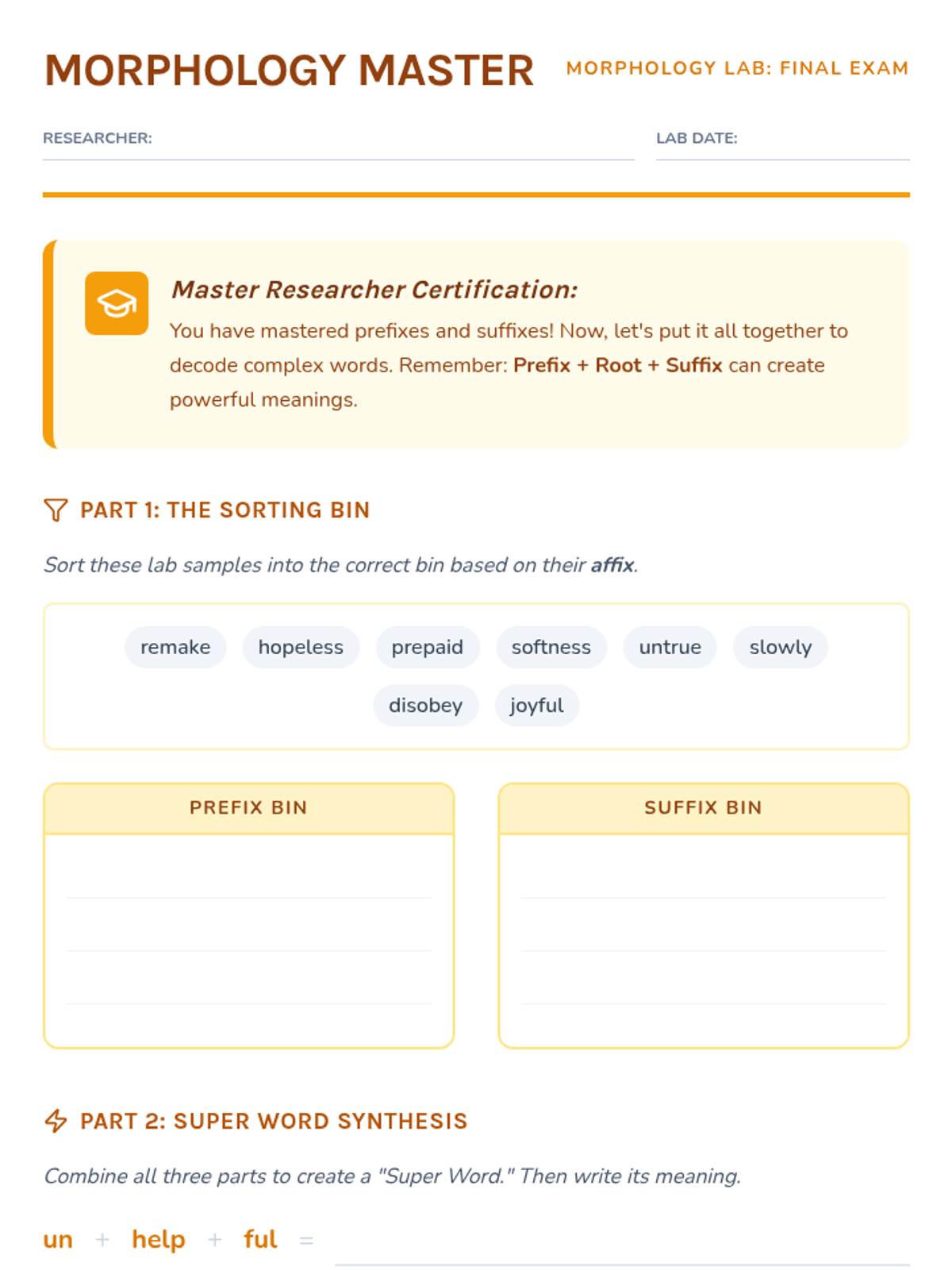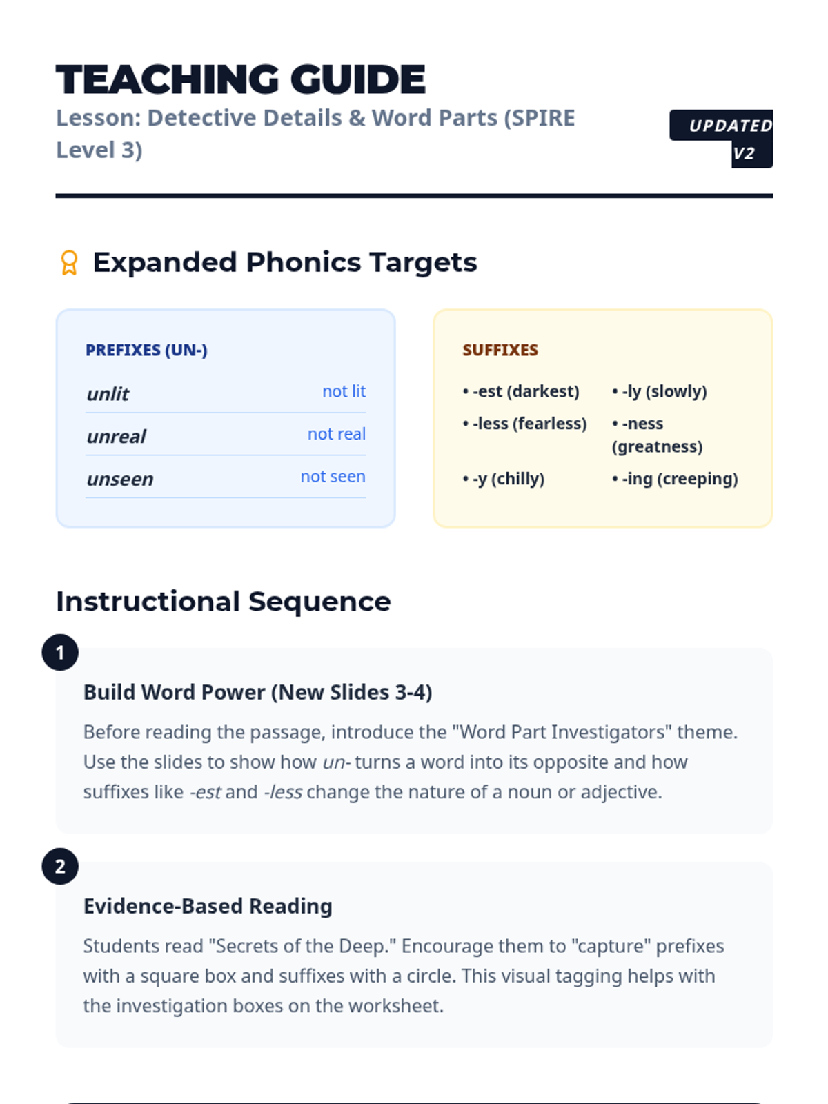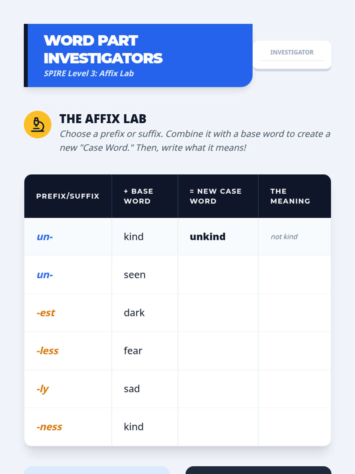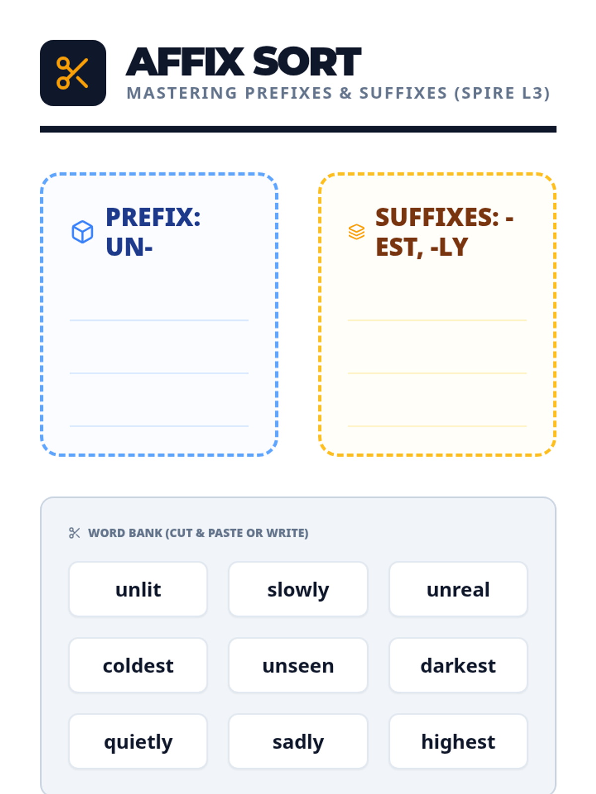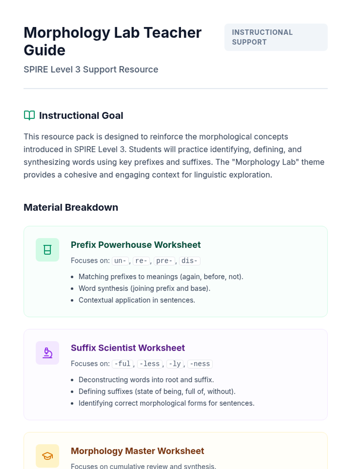 A comprehensive set of practice activities focusing on the prefixes and suffixes introduced in SPIRE Level 3, designed to build vocabulary and morphological awareness.
