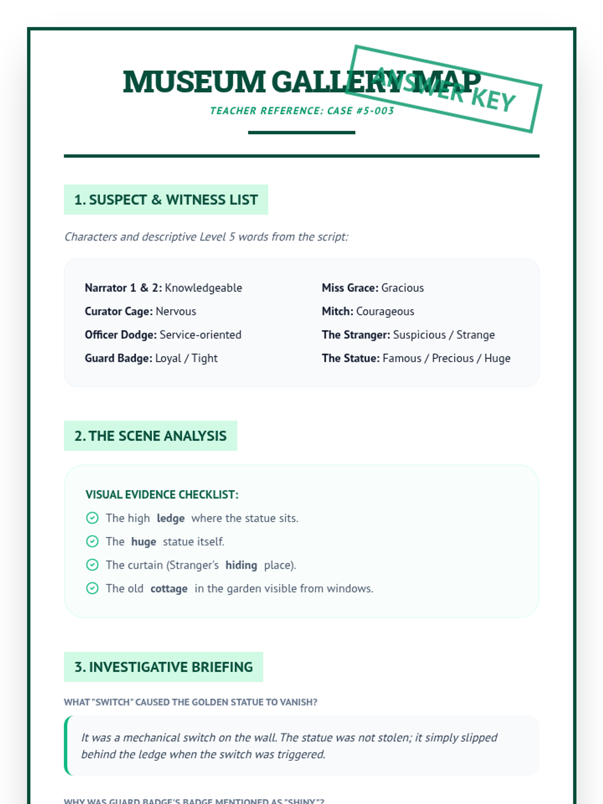 A large-cast Reader's Theater lesson featuring 8+ characters, focused on S.P.I.R.E. Level 5 patterns in a museum heist mystery.