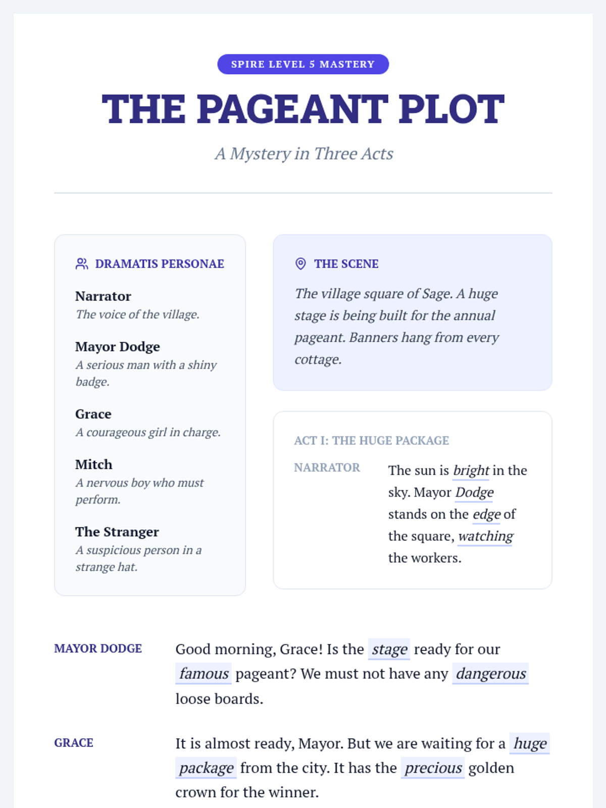 A second Reader's Theater lesson focused on S.P.I.R.E. Level 5 patterns, featuring a longer script about a mysterious package and a village pageant.