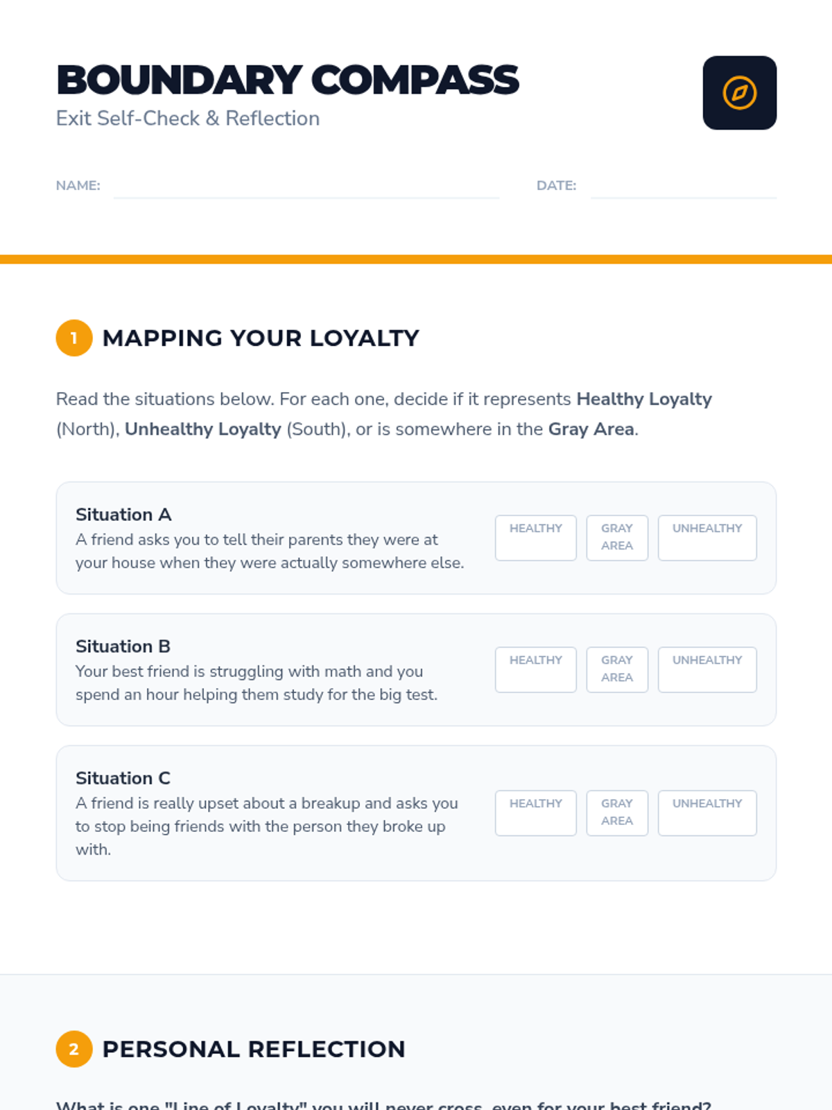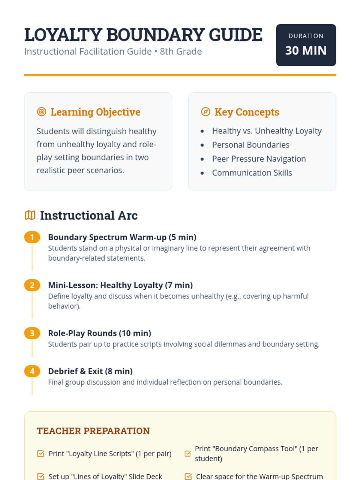 This lesson helps 8th-grade students distinguish between healthy and unhealthy loyalty while practicing the essential skill of setting personal boundaries through role-play.
