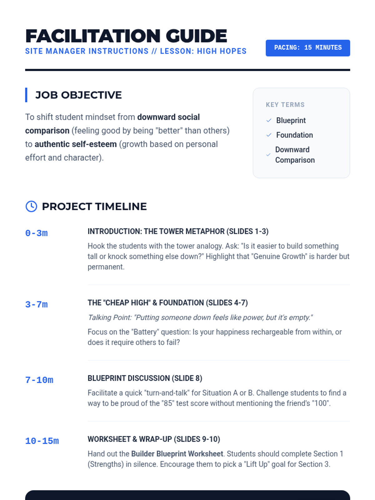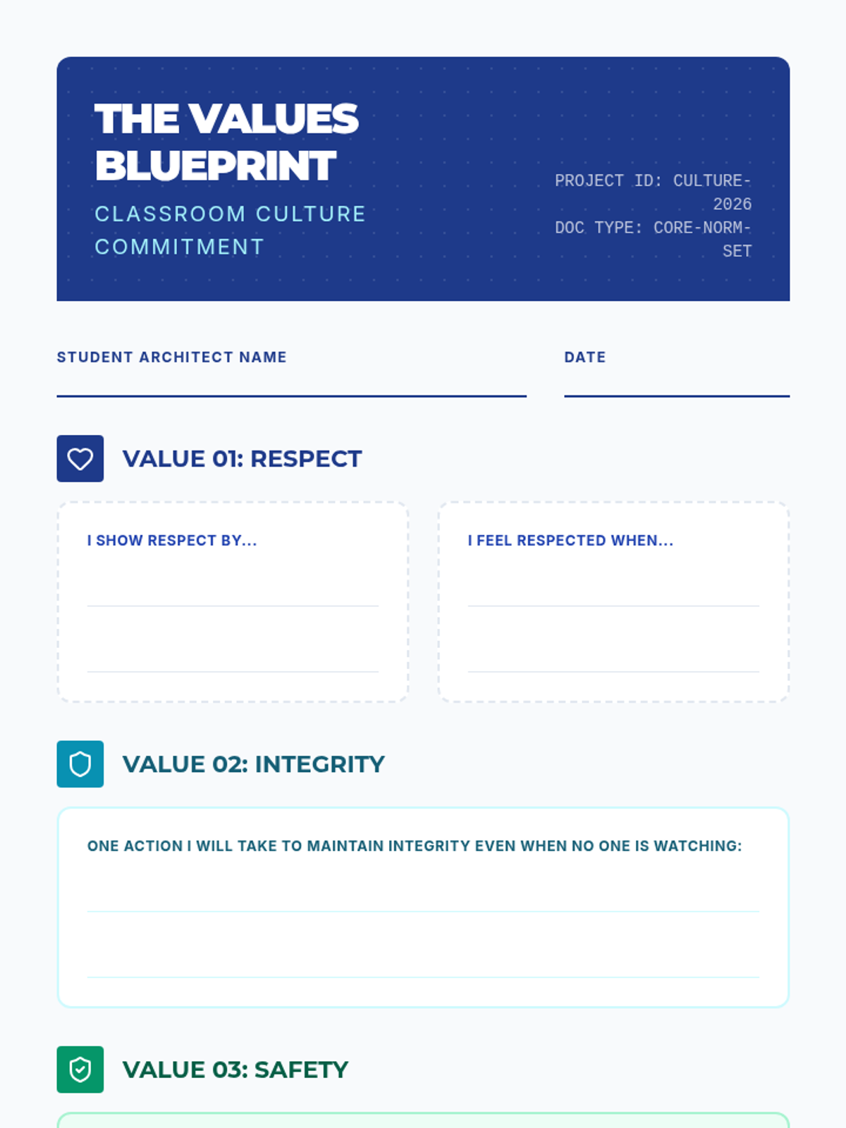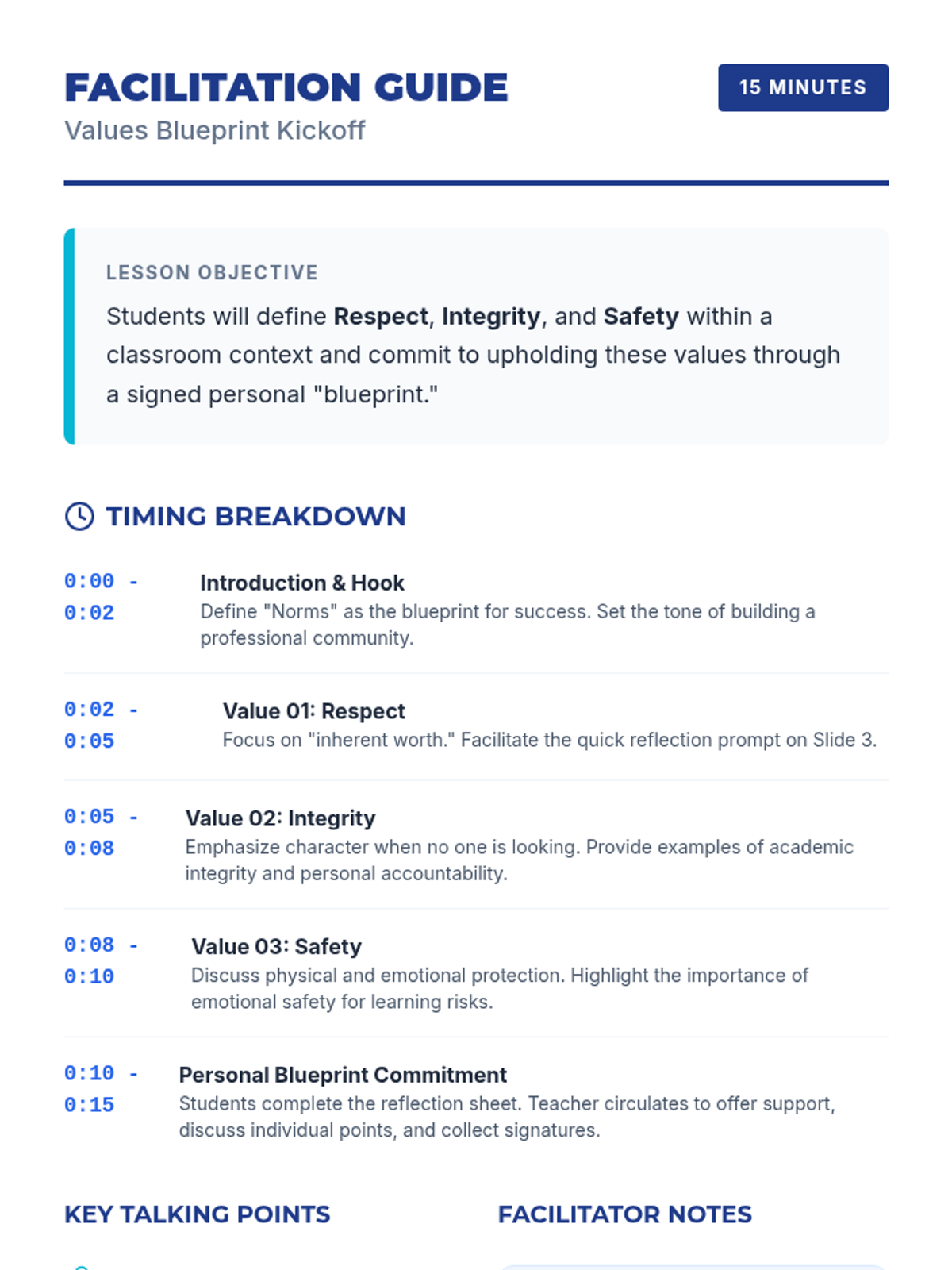 A concise 15-minute introduction to classroom norms centered on the core values of Respect, Integrity, and Safety. Students will define these values and commit to a shared culture of success.