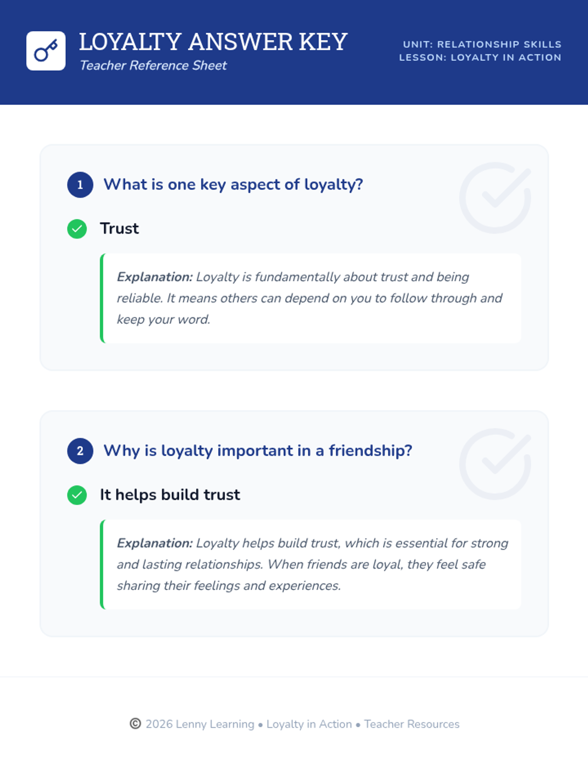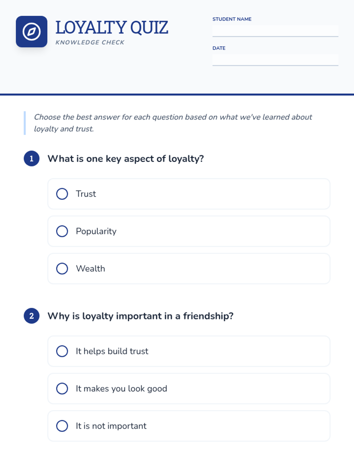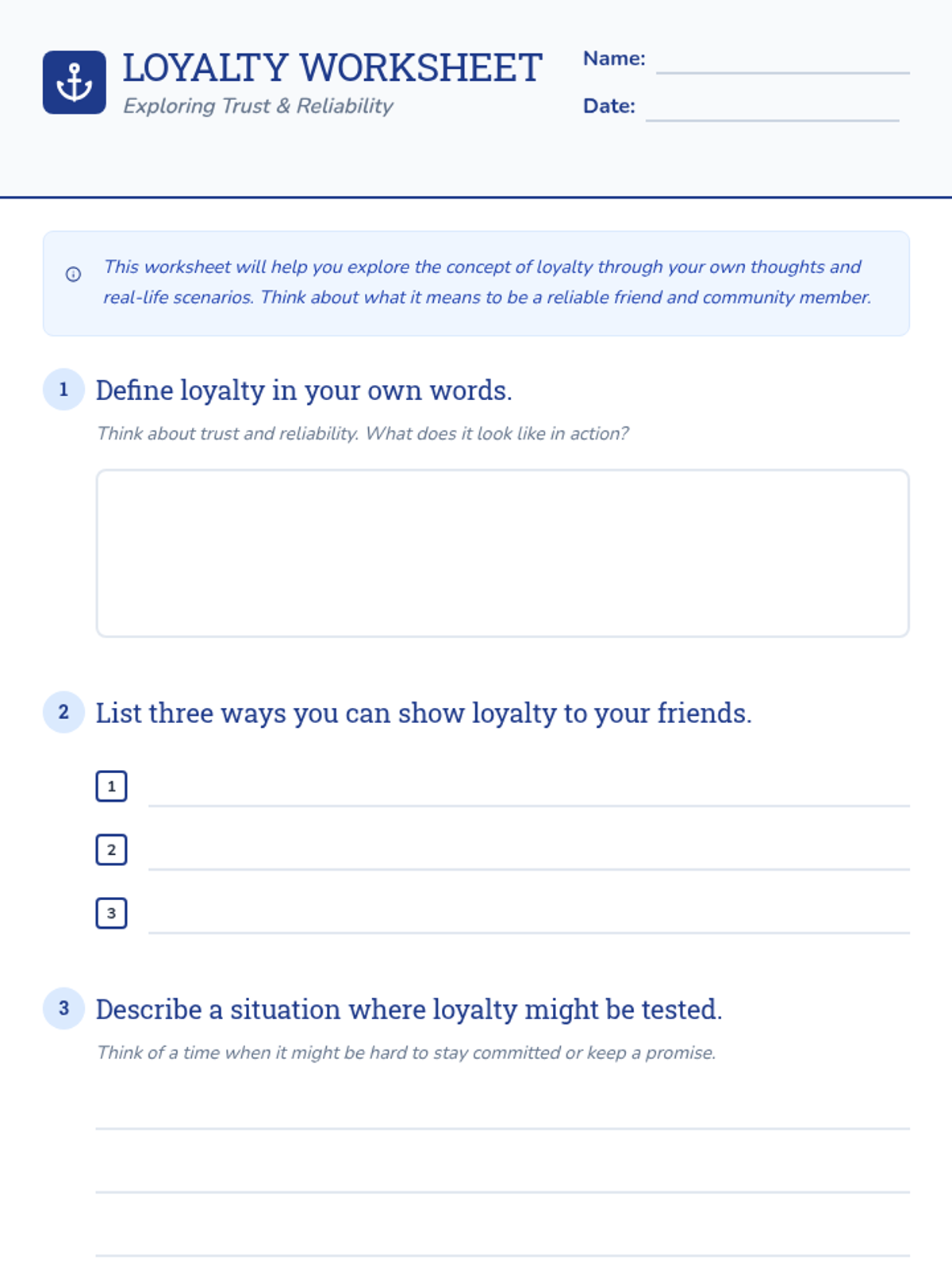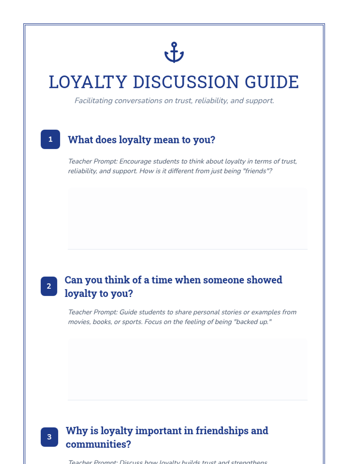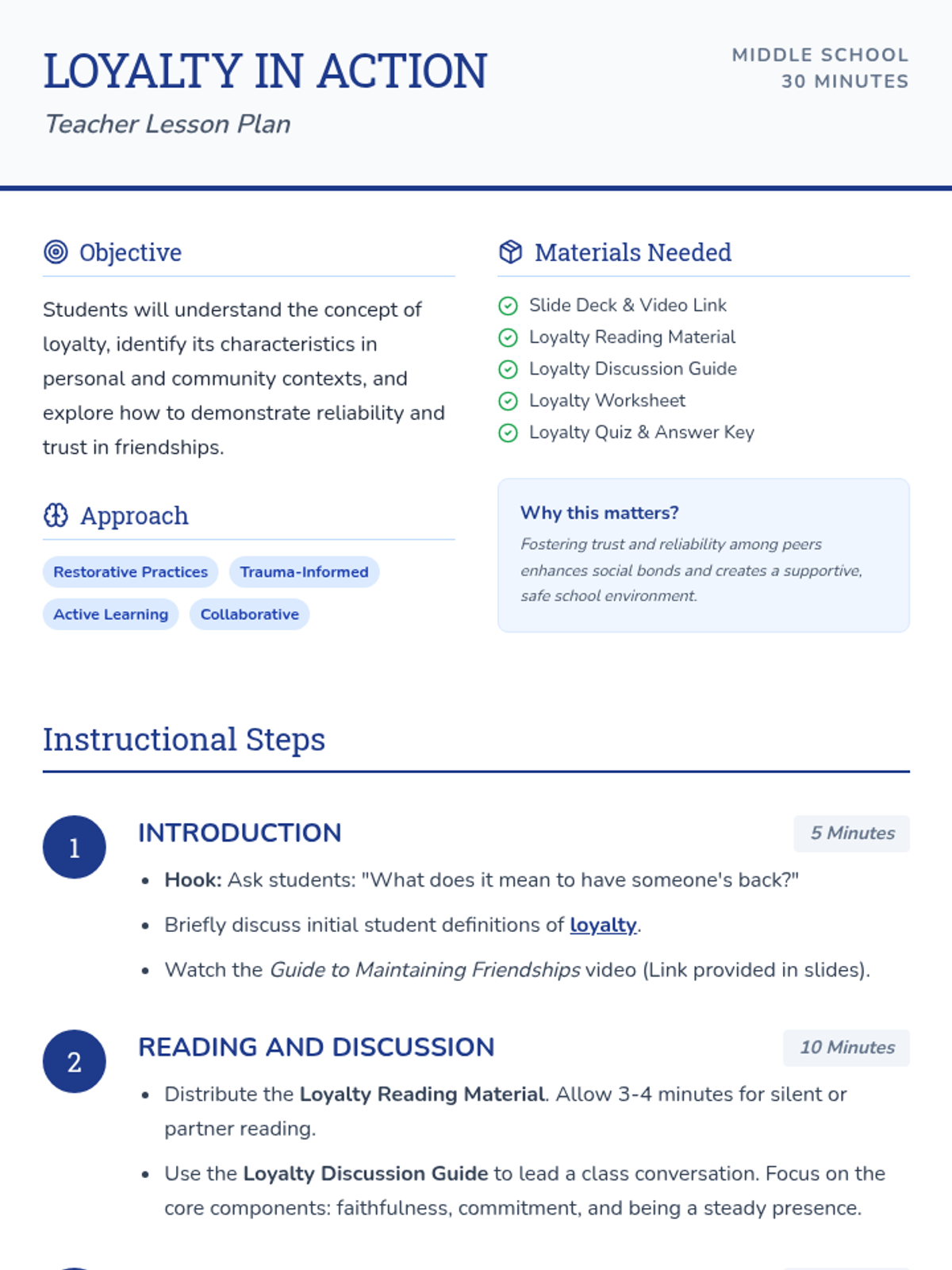 A middle school lesson exploring the concept of loyalty, trust, and reliability in personal relationships and the wider community through video, discussion, and reflective activities.