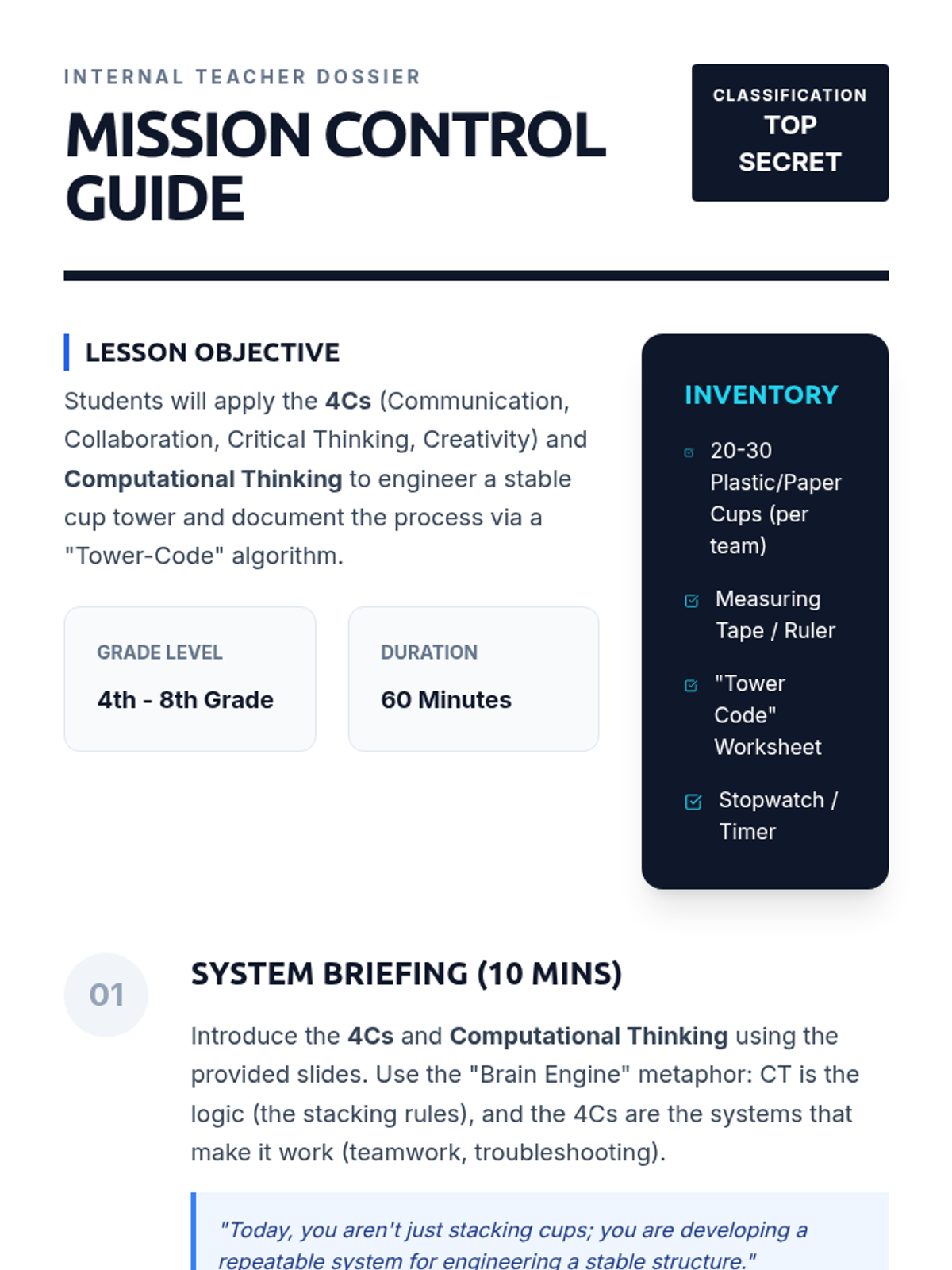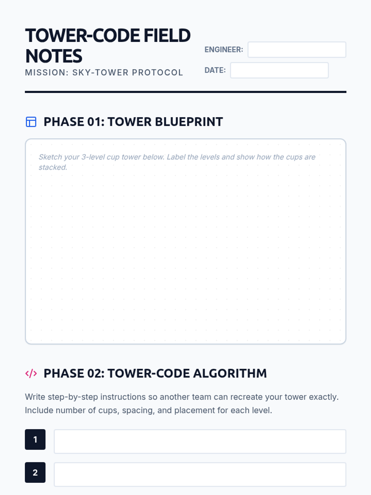 A high-stakes engineering challenge where students use the 4Cs and Computational Thinking to design, build, and document the ultimate cup tower structure.
