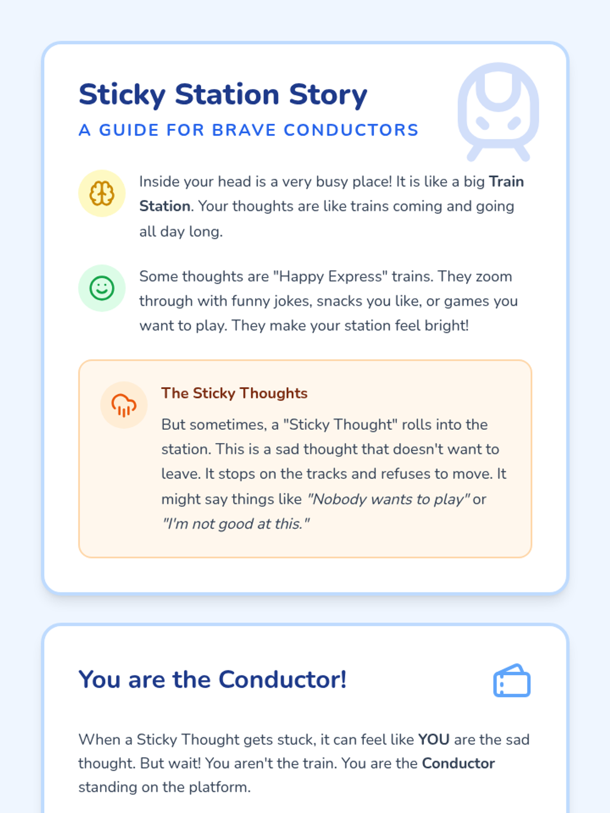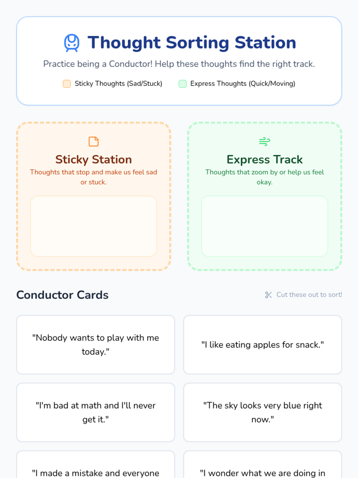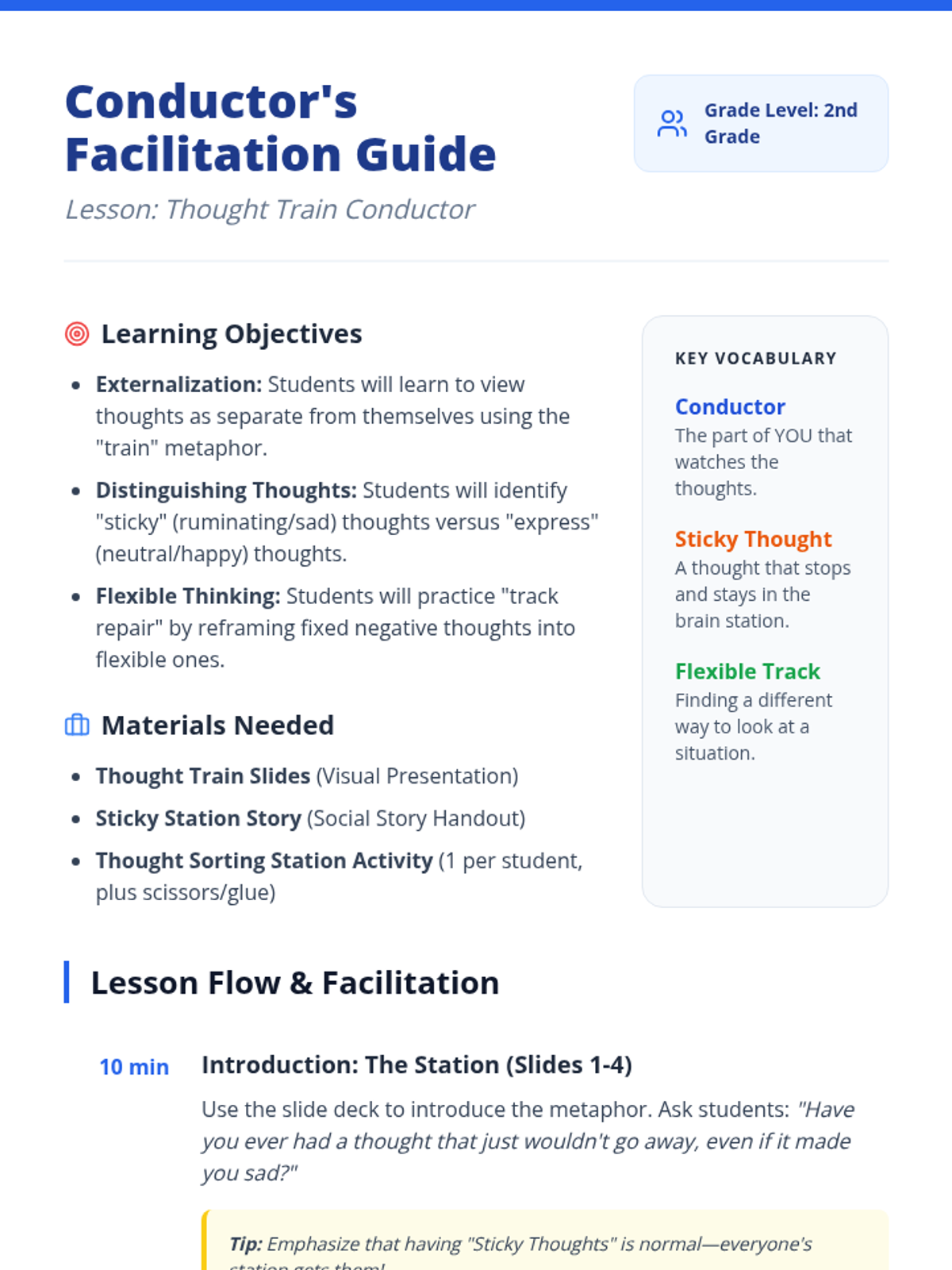 A lesson designed for 2nd graders to manage ruminating sad thoughts using externalization (thought distancing) and flexible thinking through the metaphor of a 'Thought Train'.