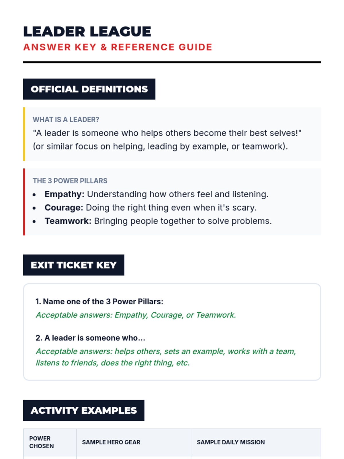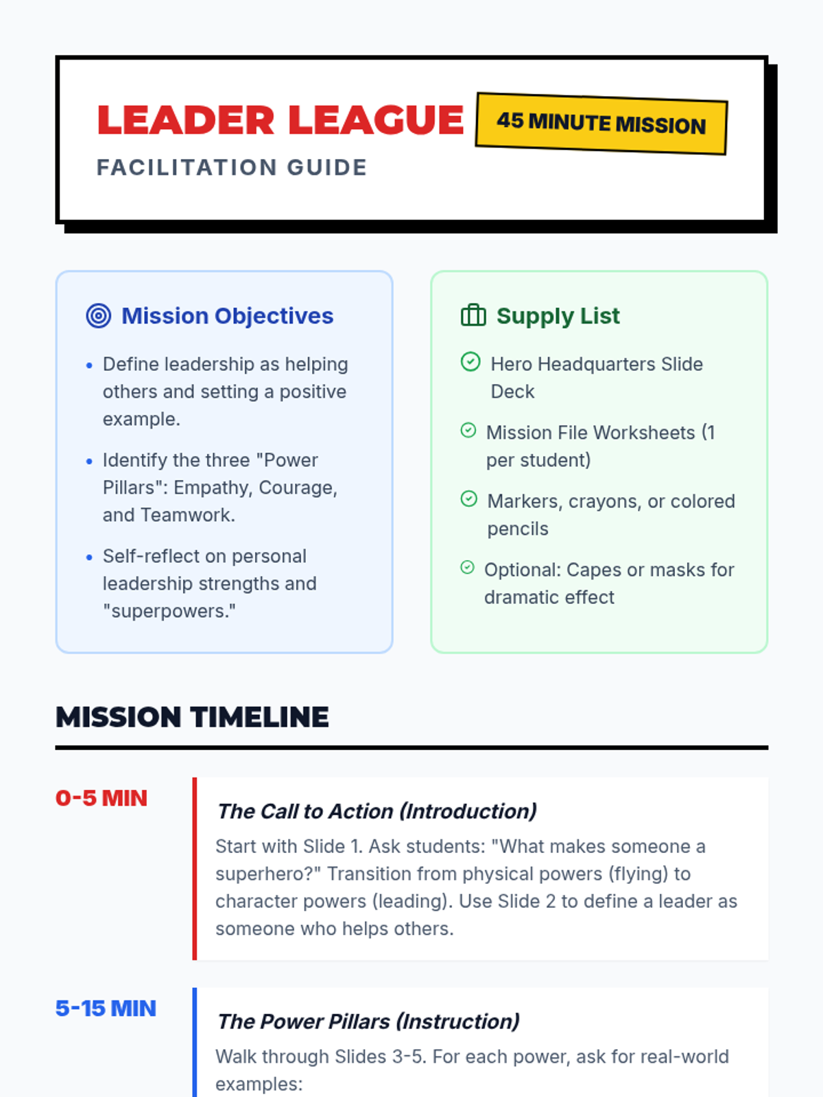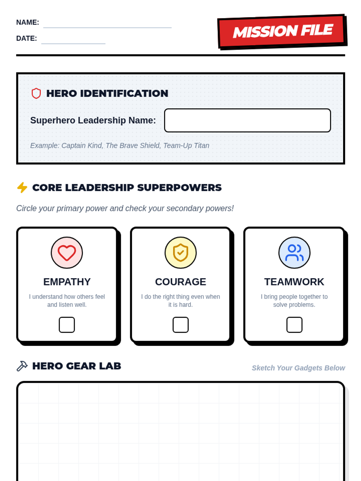 Students explore core leadership qualities through the lens of superheroes, identifying their own unique leadership 'superpowers' and learning how to lead with empathy, courage, and teamwork.
