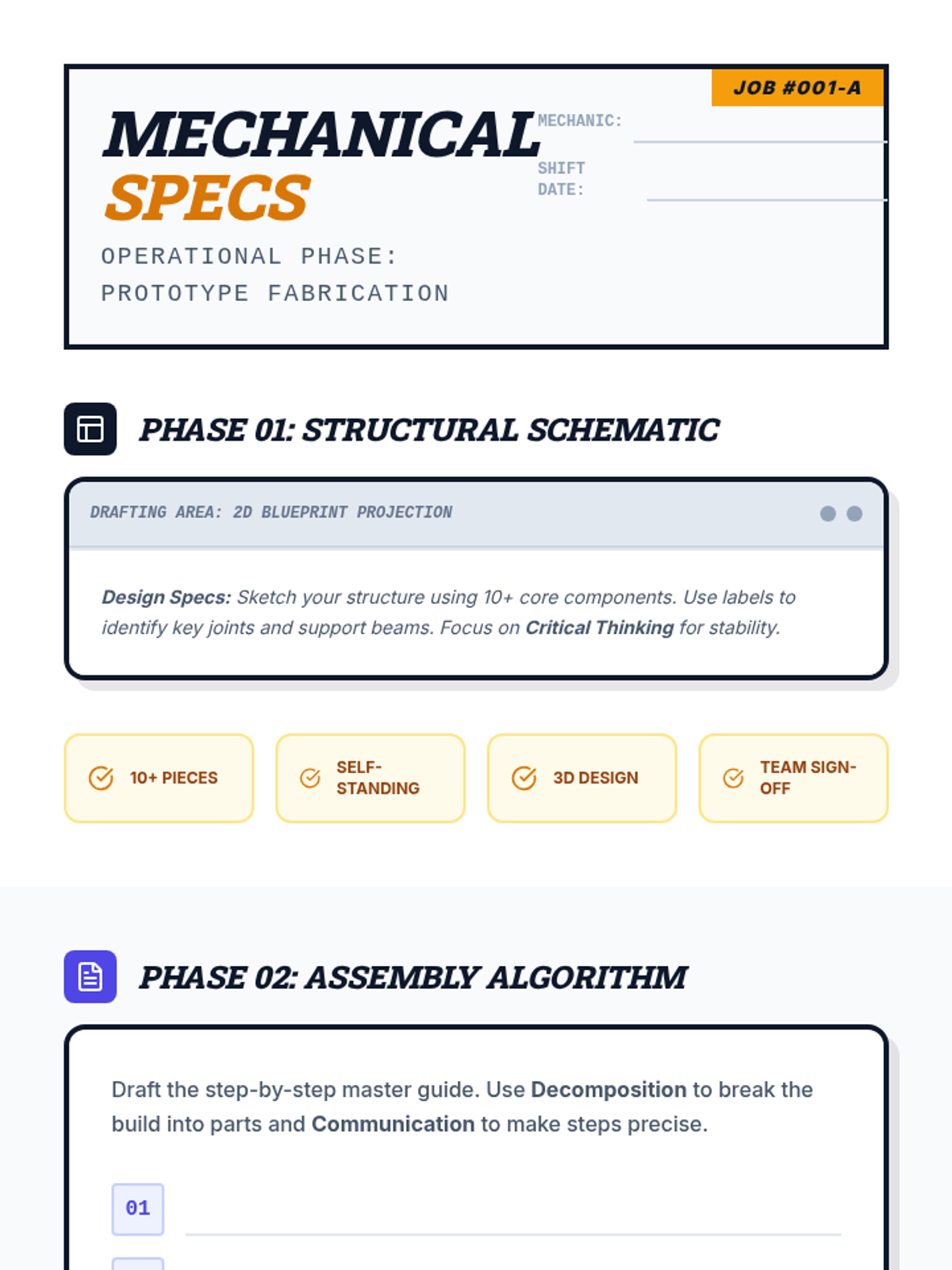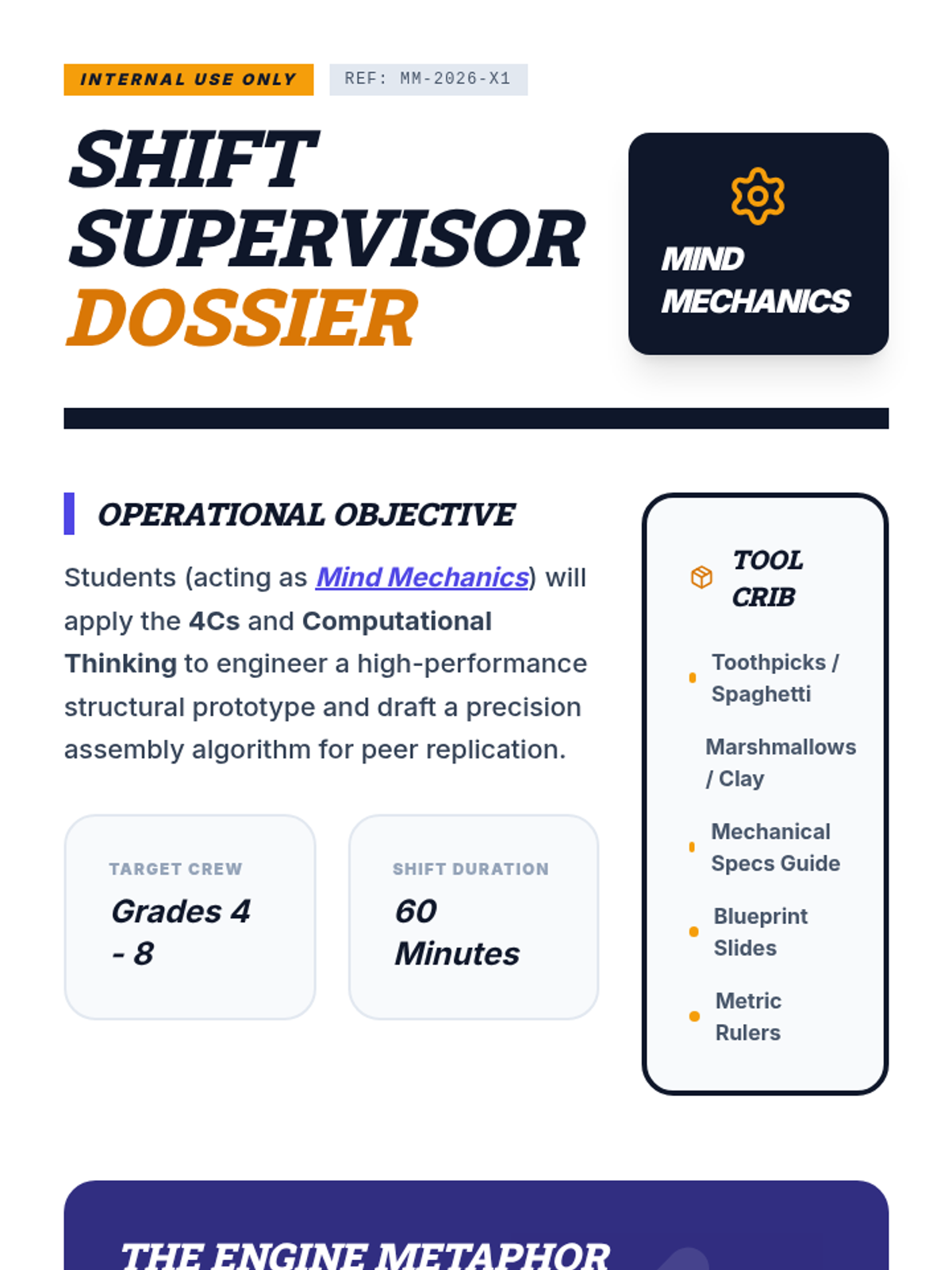 An industrial-themed teamwork lesson where students act as "Mind Mechanics" to apply the 4Cs and Computational Thinking to a complex engineering challenge.