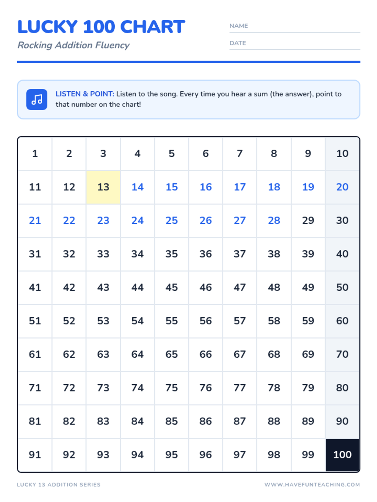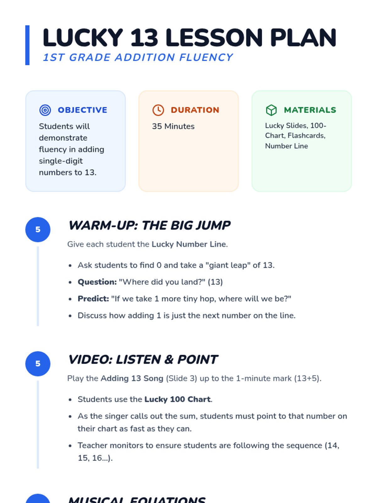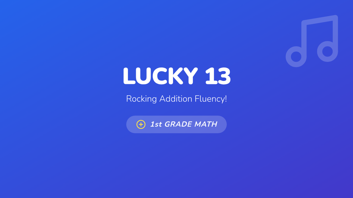 A high-energy 1st-grade math lesson focused on fluency when adding numbers to 13, featuring a musical activity and pattern recognition.