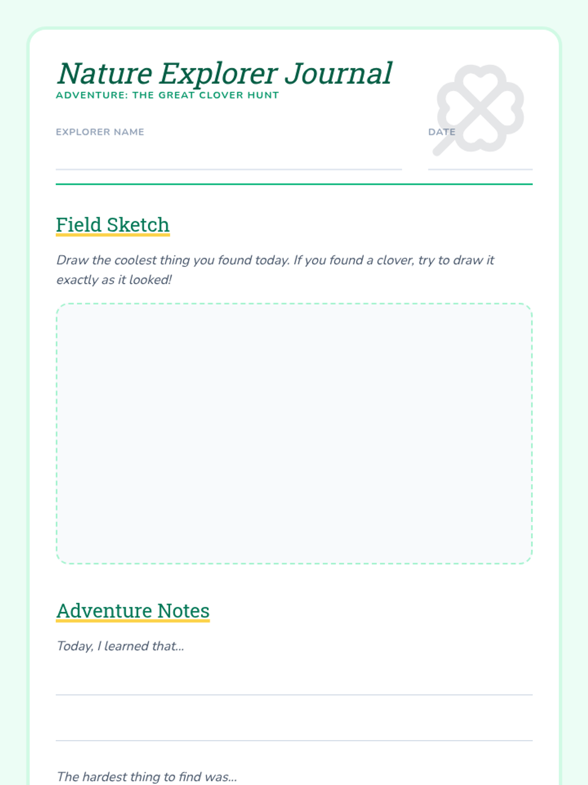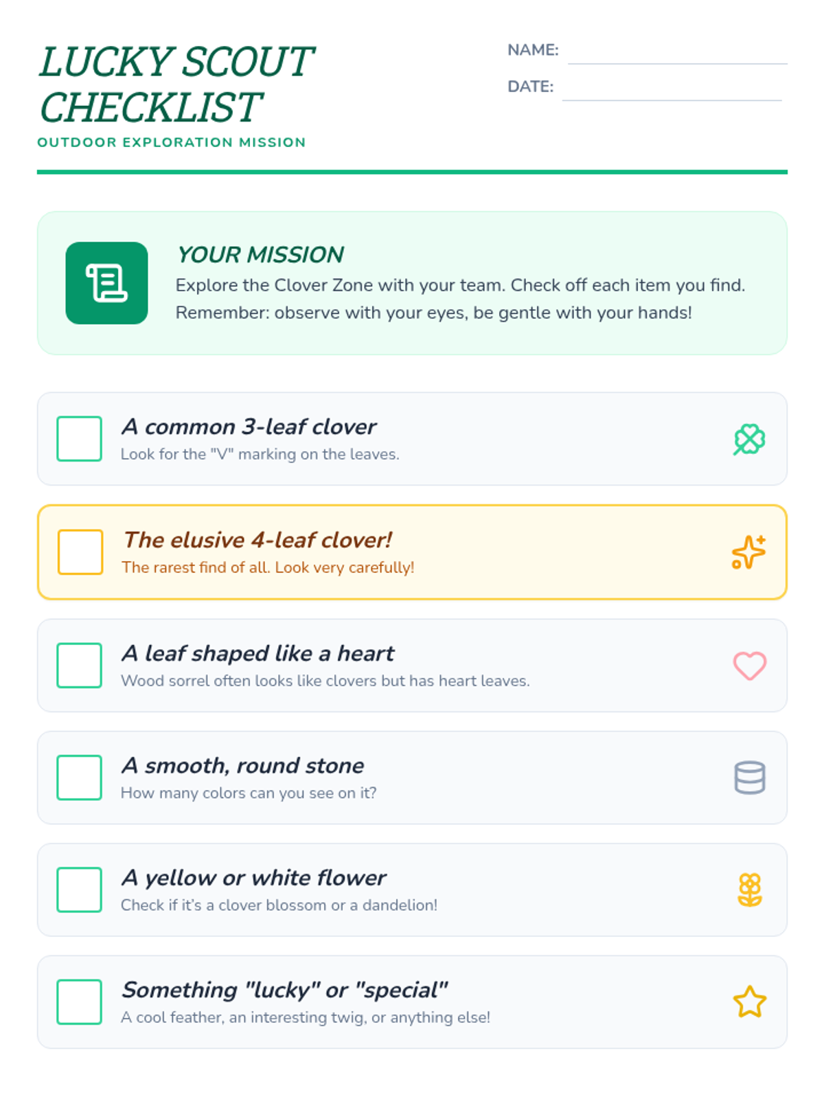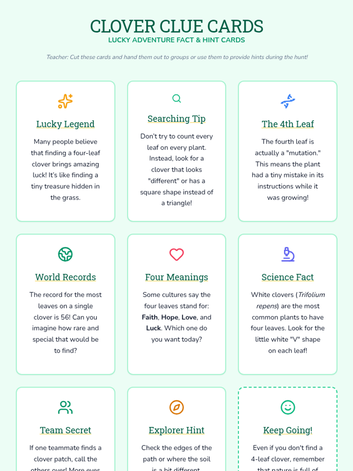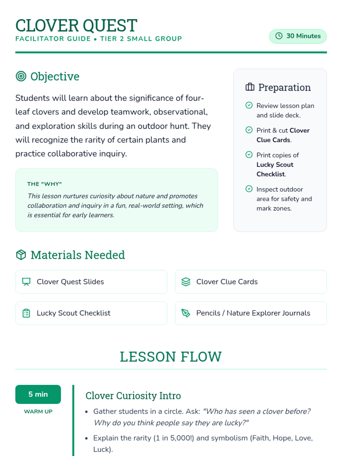 A 30-minute outdoor exploration for 2nd graders to discover the rarity and symbolism of four-leaf clovers while building teamwork and observation skills.