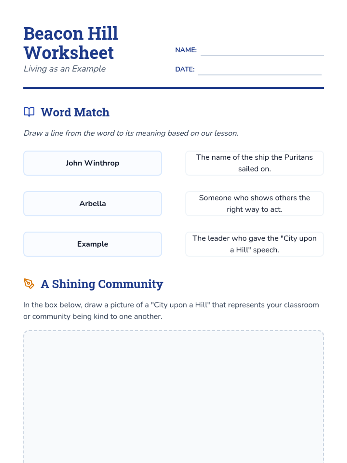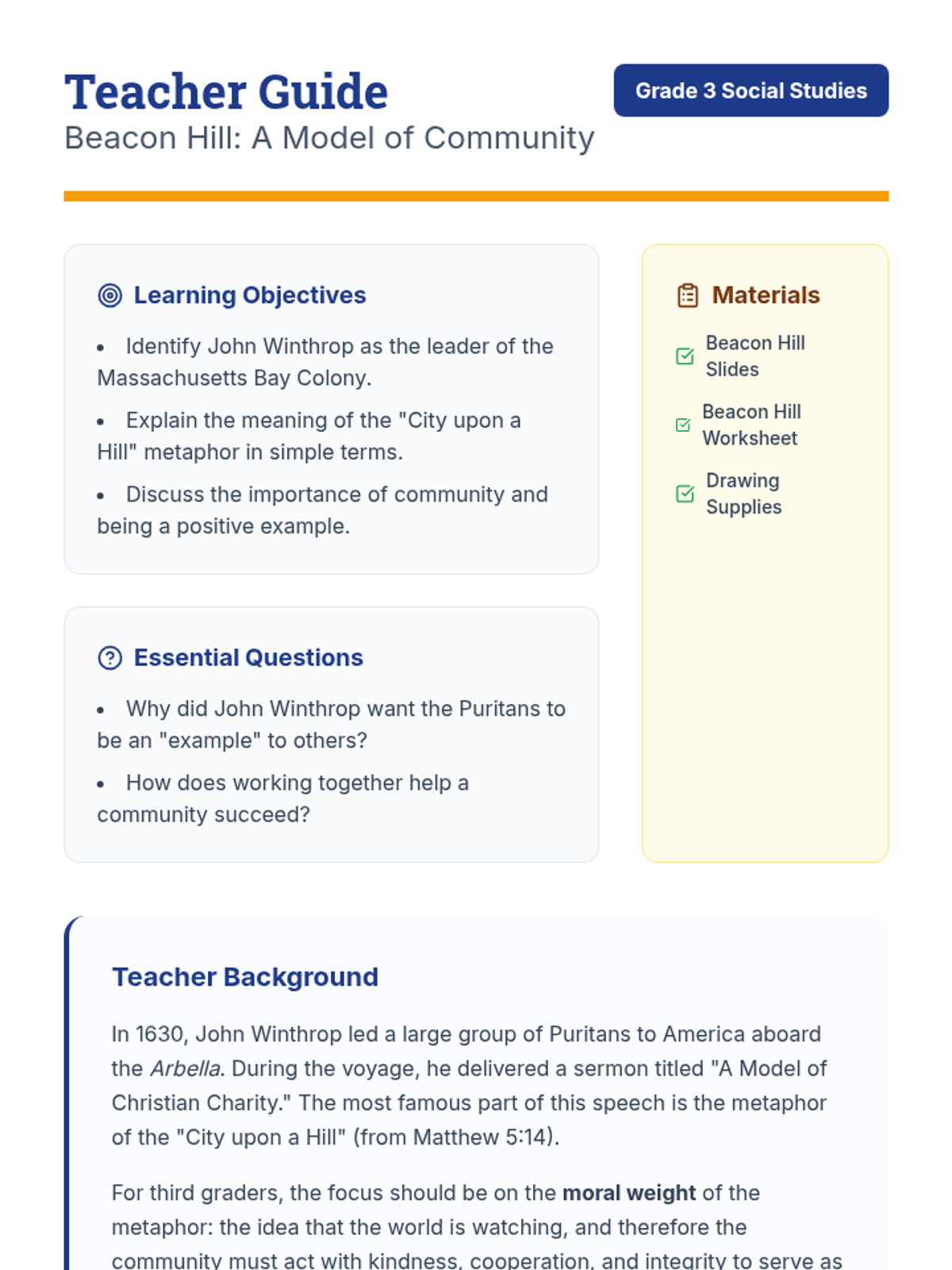 A social studies lesson for third graders exploring John Winthrop's 'City upon a Hill' sermon, focusing on the concepts of community, being a positive example, and the voyage of the Arbella.