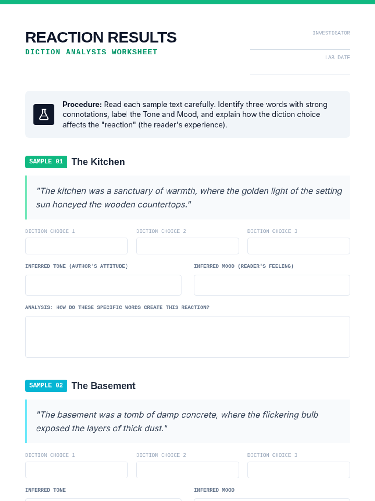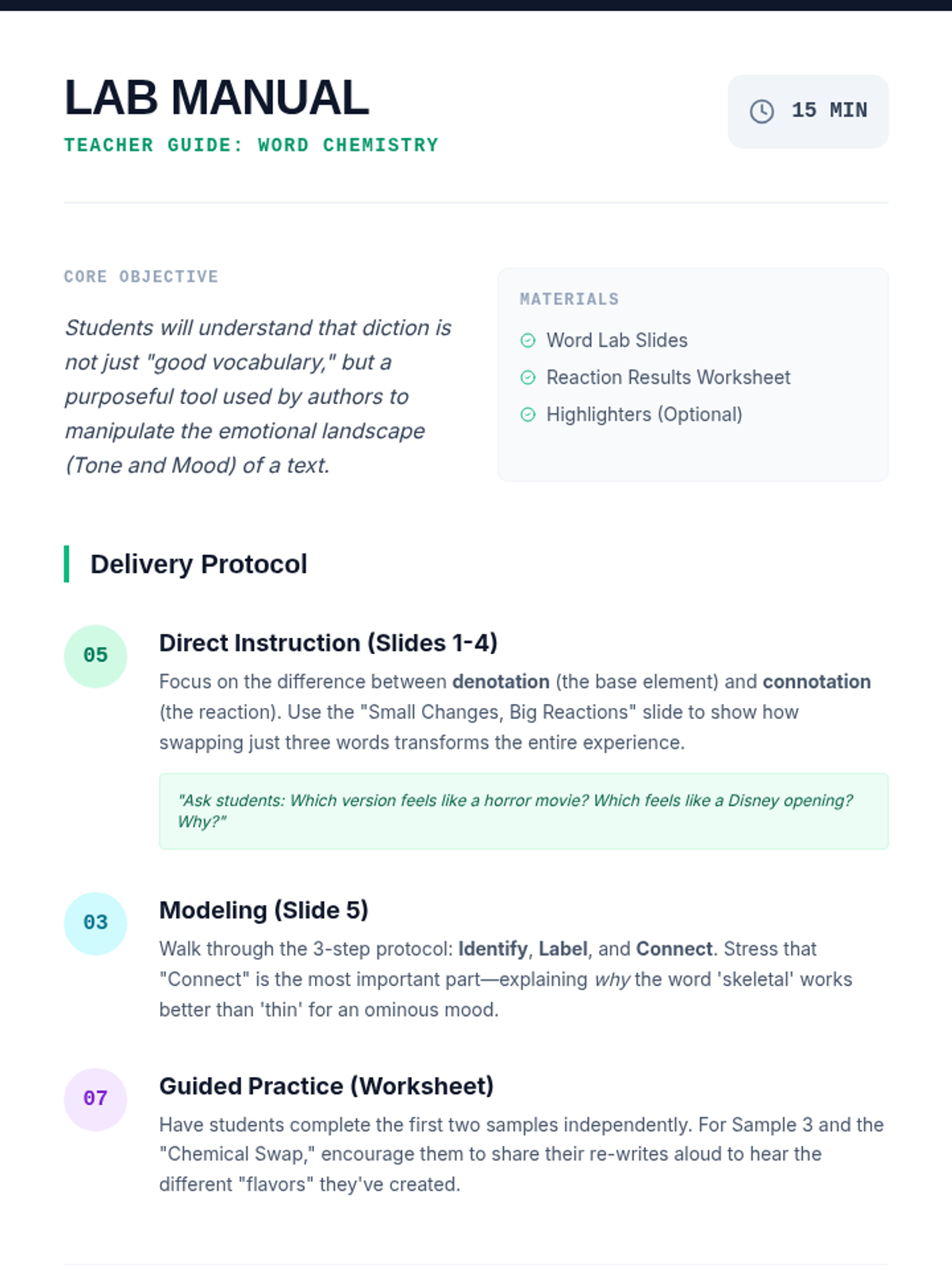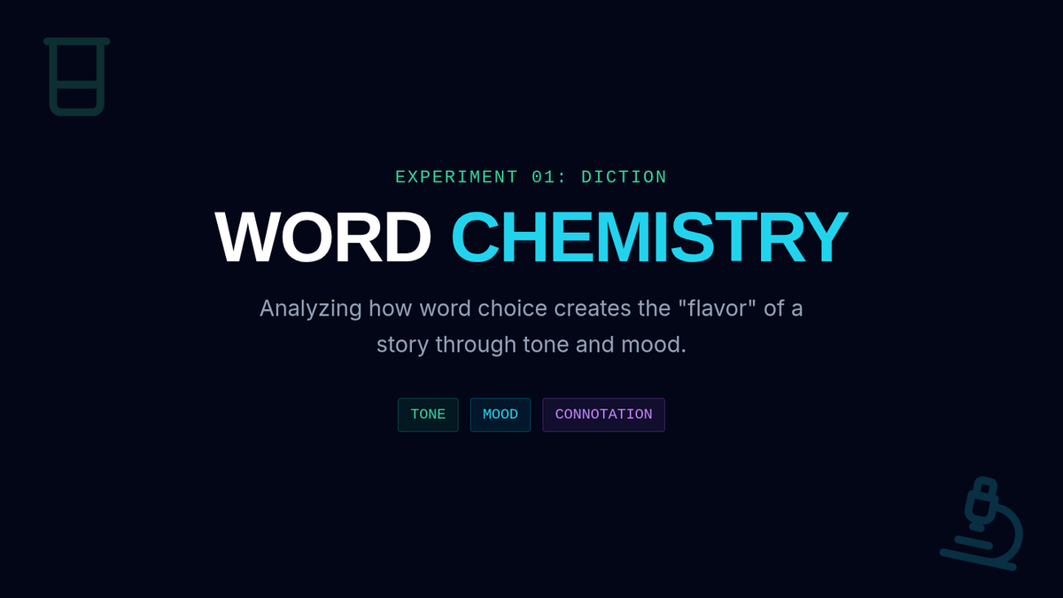 A 15-minute mini-lesson exploring how specific word choices (diction) create distinct tones and moods in literature, framed through a 'Word Lab' investigation.