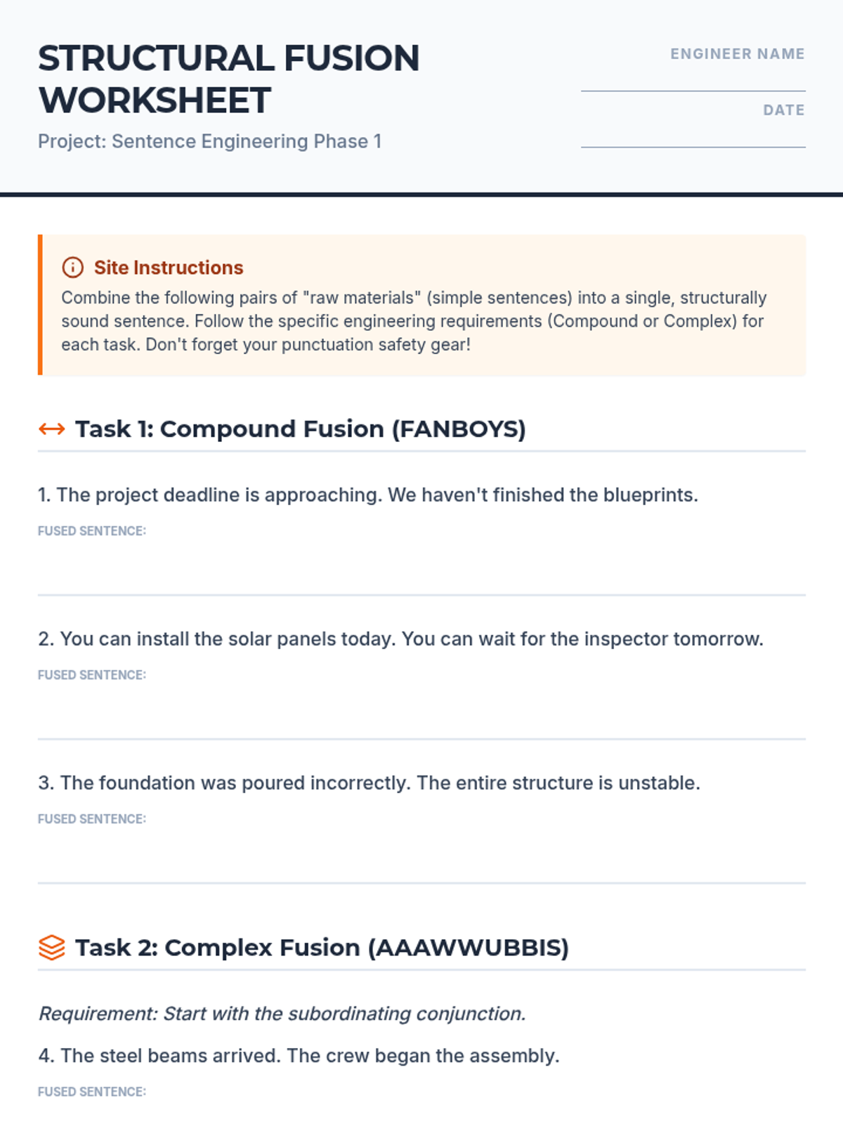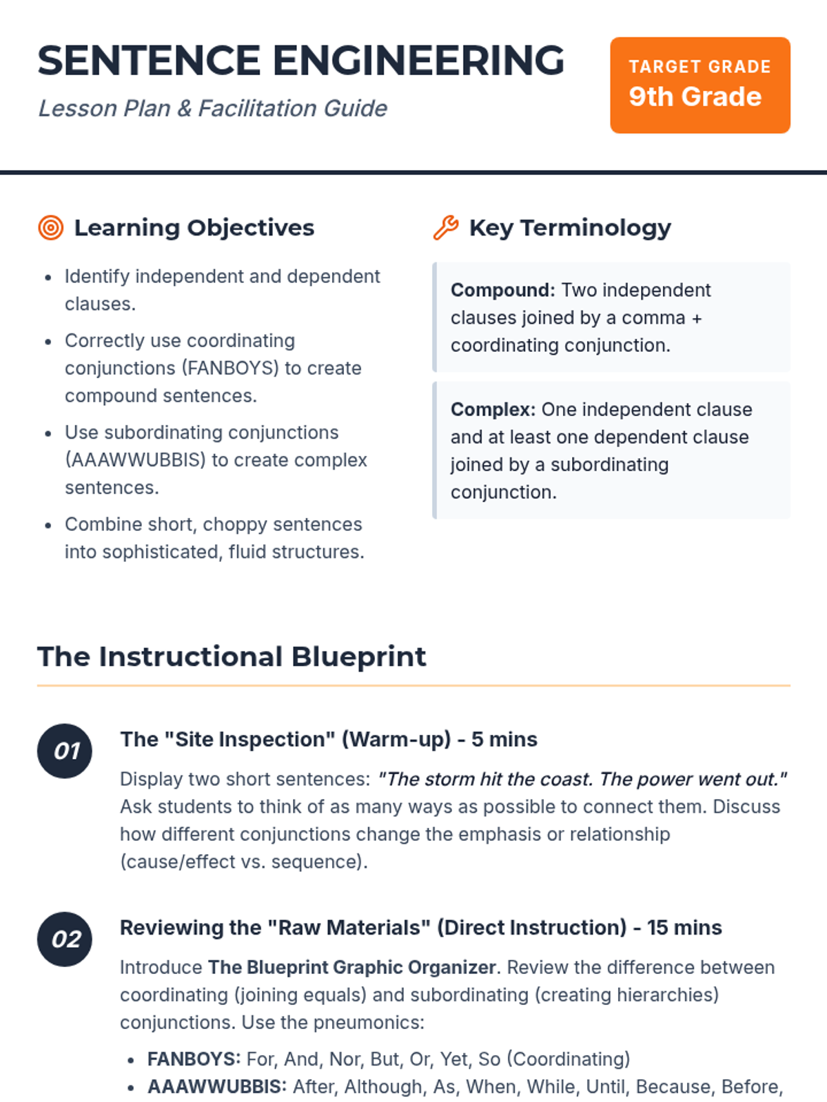 A comprehensive lesson focused on mastering compound and complex sentence structures using coordinating and subordinating conjunctions. Students will learn to 'engineer' more sophisticated writing by strategically combining ideas.