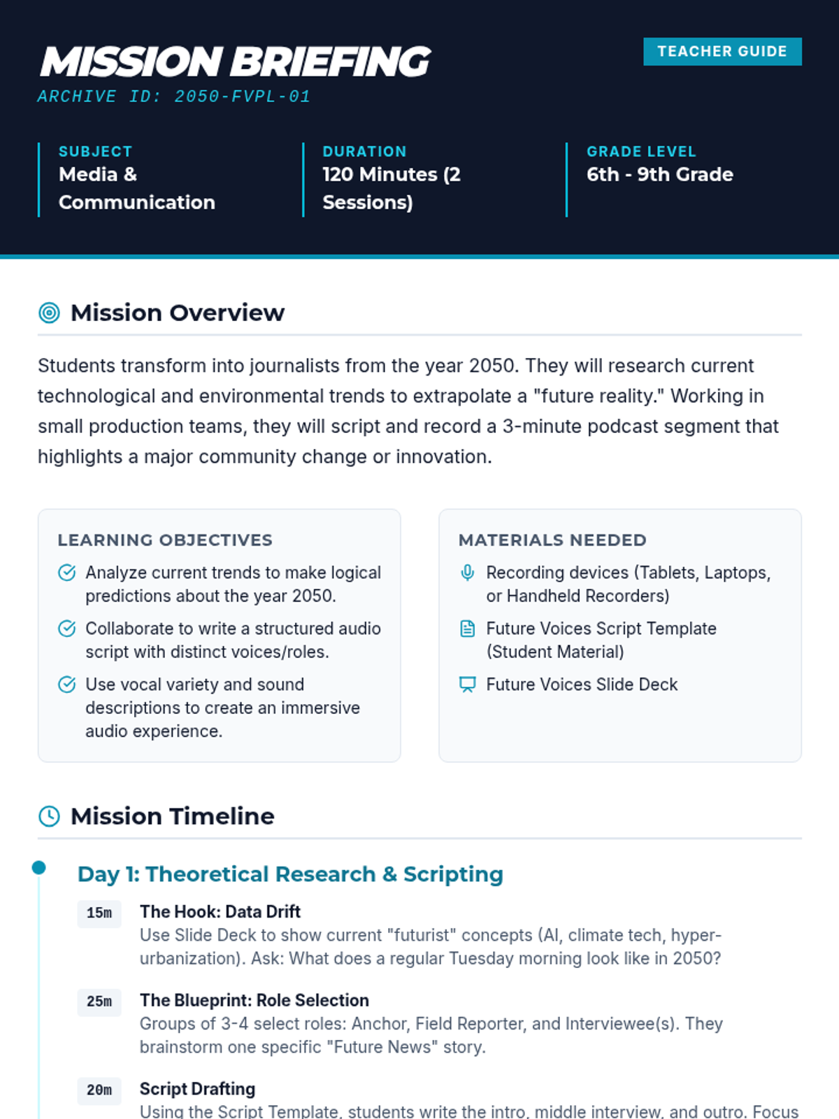 Students step into the shoes of future journalists to script and record a podcast broadcast from the year 2050, exploring community evolution and technological innovation.