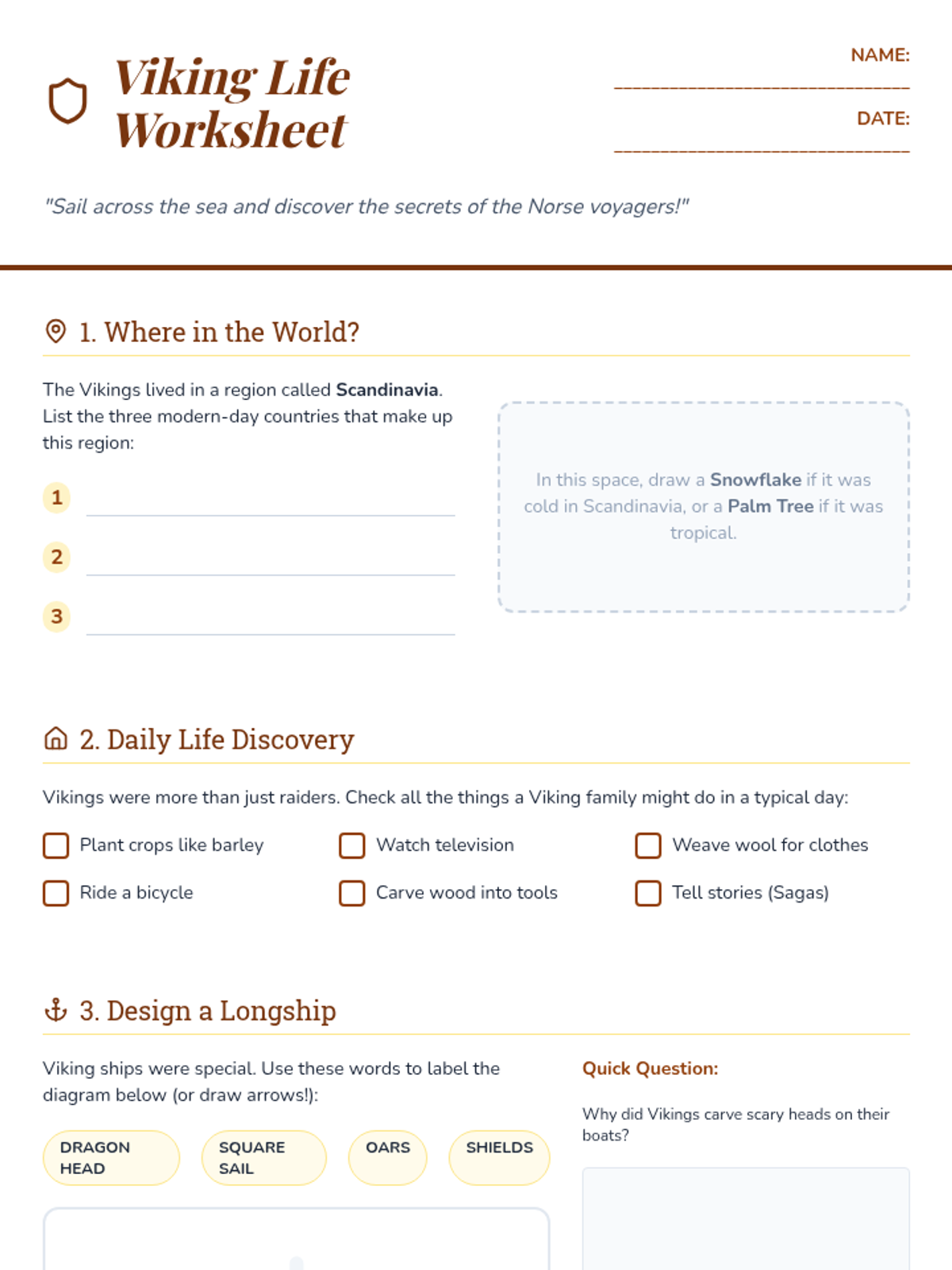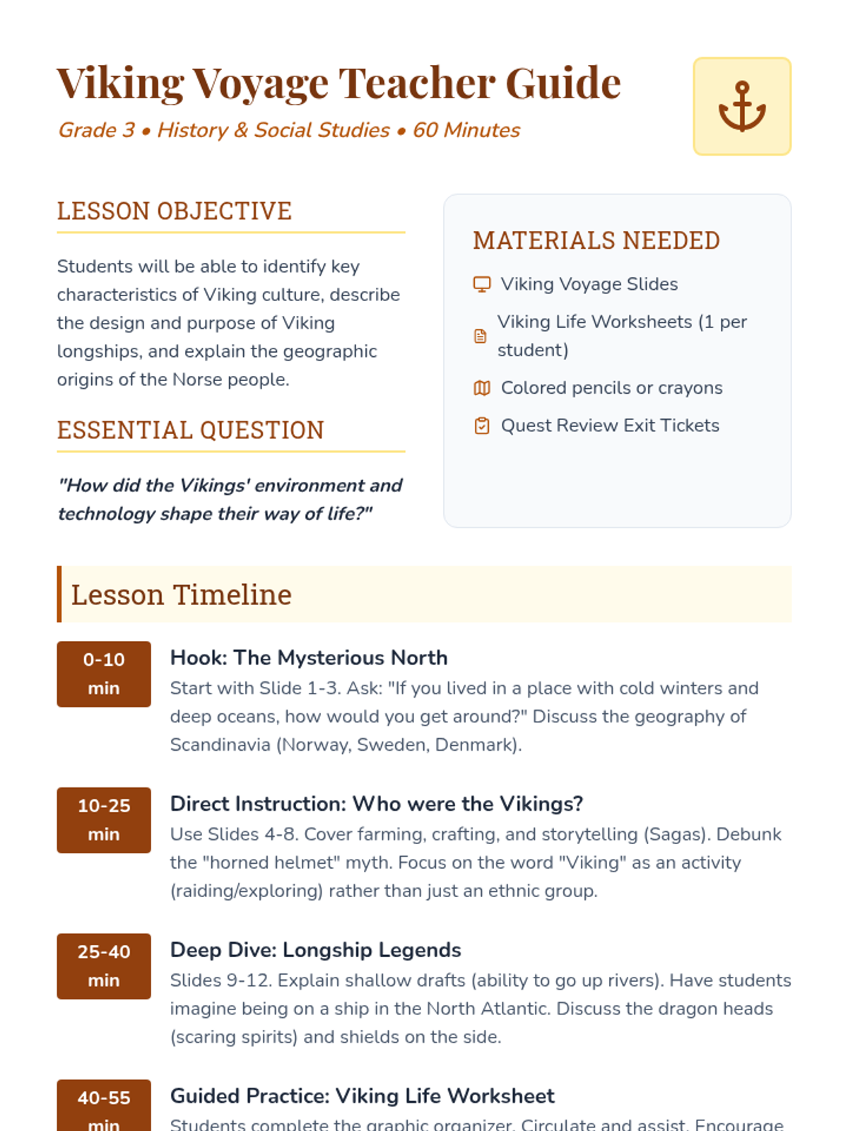 An introductory lesson on Viking history, culture, and exploration designed for 3rd-grade students. This 60-minute lesson covers who the Vikings were, their longships, and their daily lives.