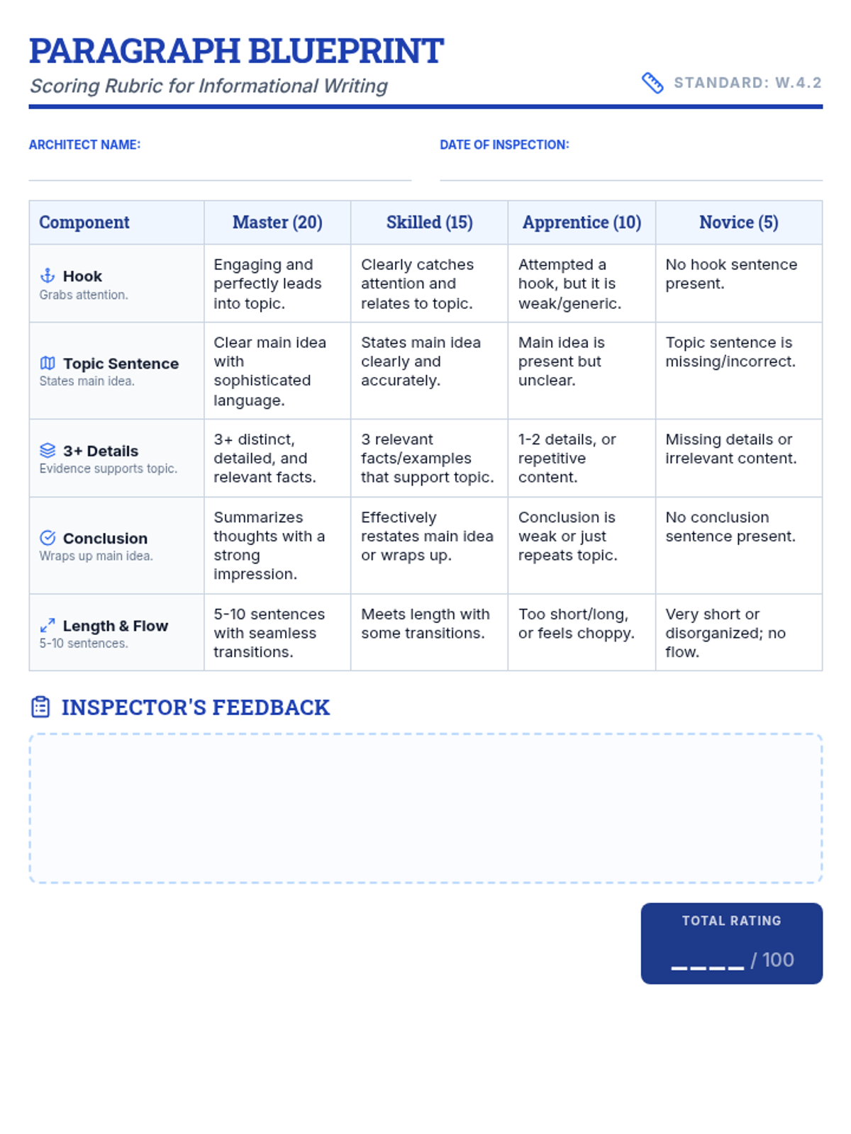 This lesson focuses on the structural components of a high-quality informational paragraph, guiding students through the 'blueprint' of writing from hook to conclusion. Students will learn to construct paragraphs that are logical, detailed, and complete.