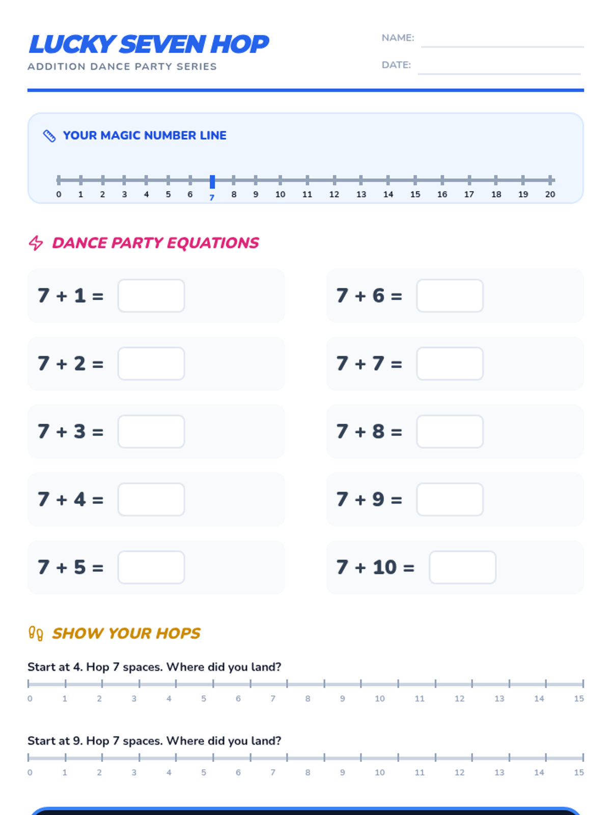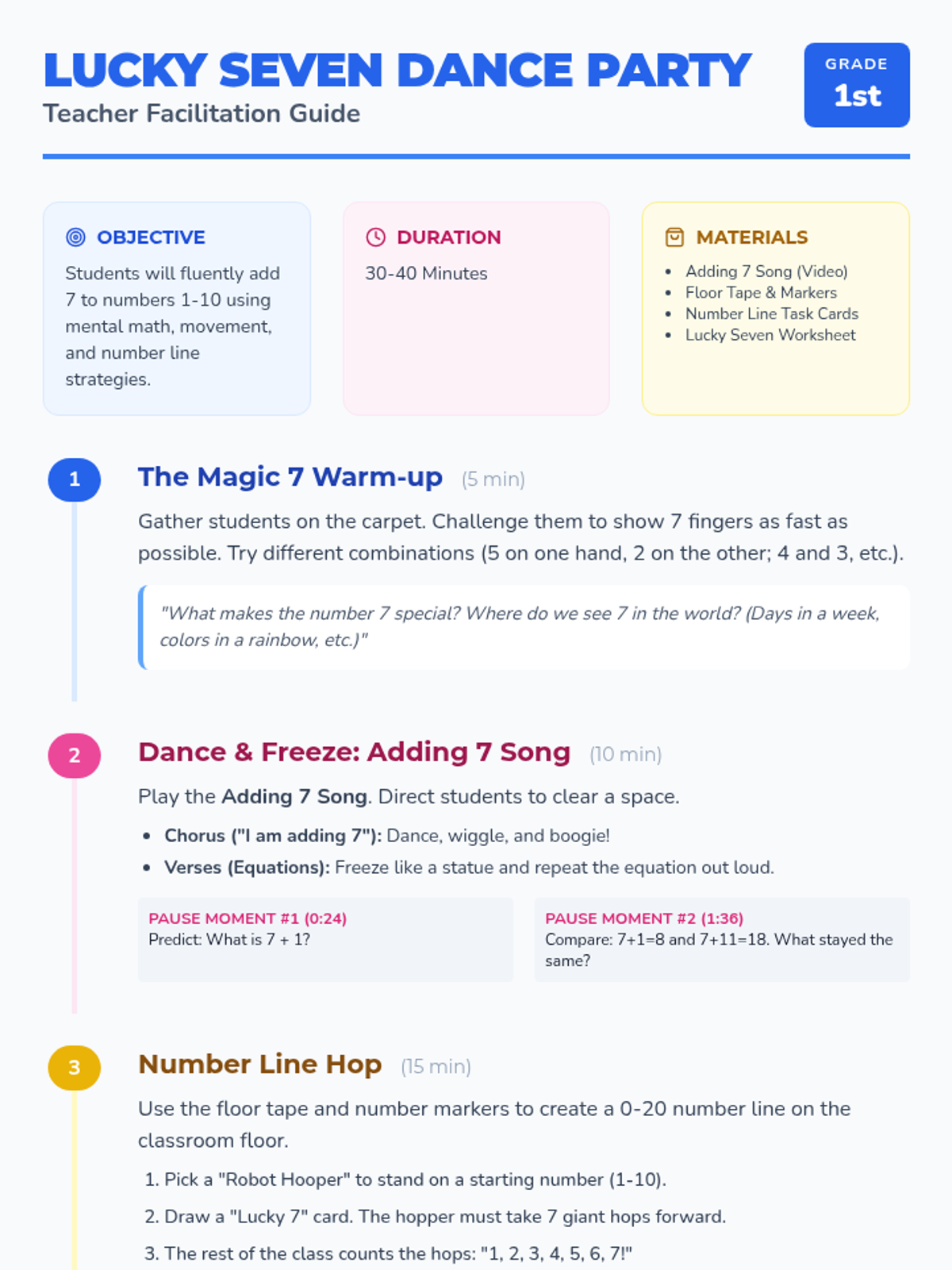 A high-energy 1st-grade lesson focused on adding 7 to numbers 1-10 through music, movement, and physical number line interaction. Students will dance to a robotic addition song and physically hop along a floor-sized number line to internalize addition facts.