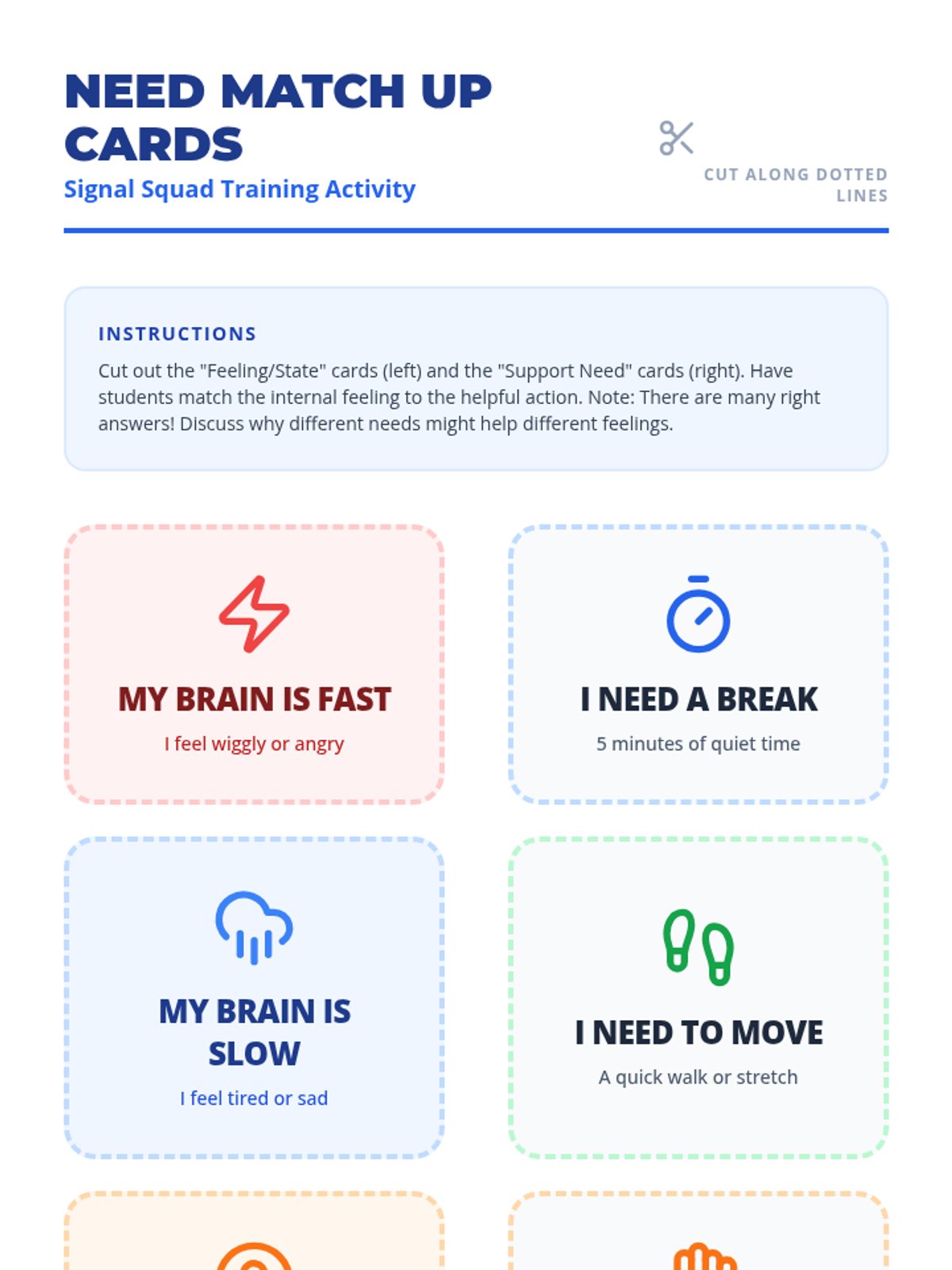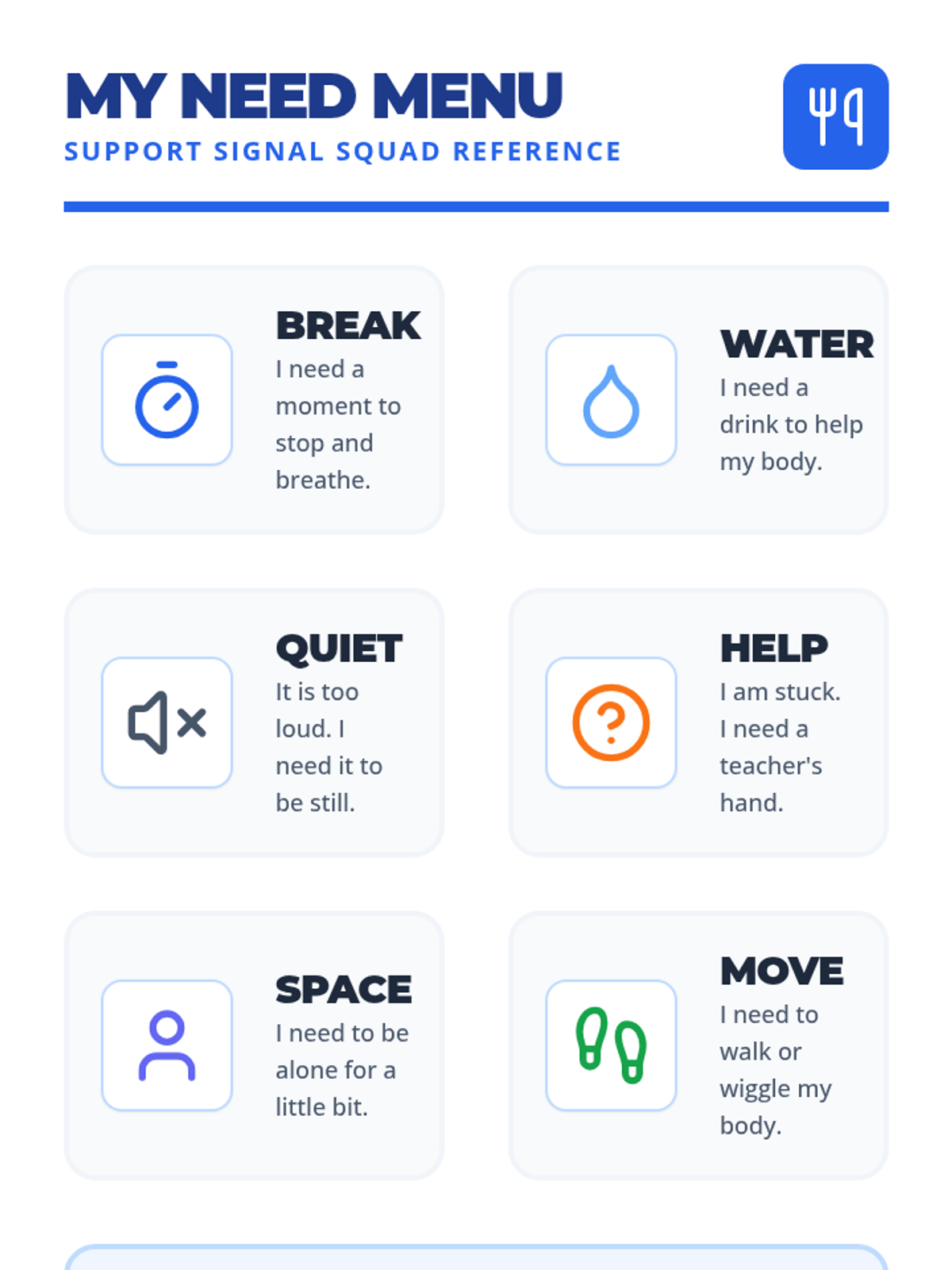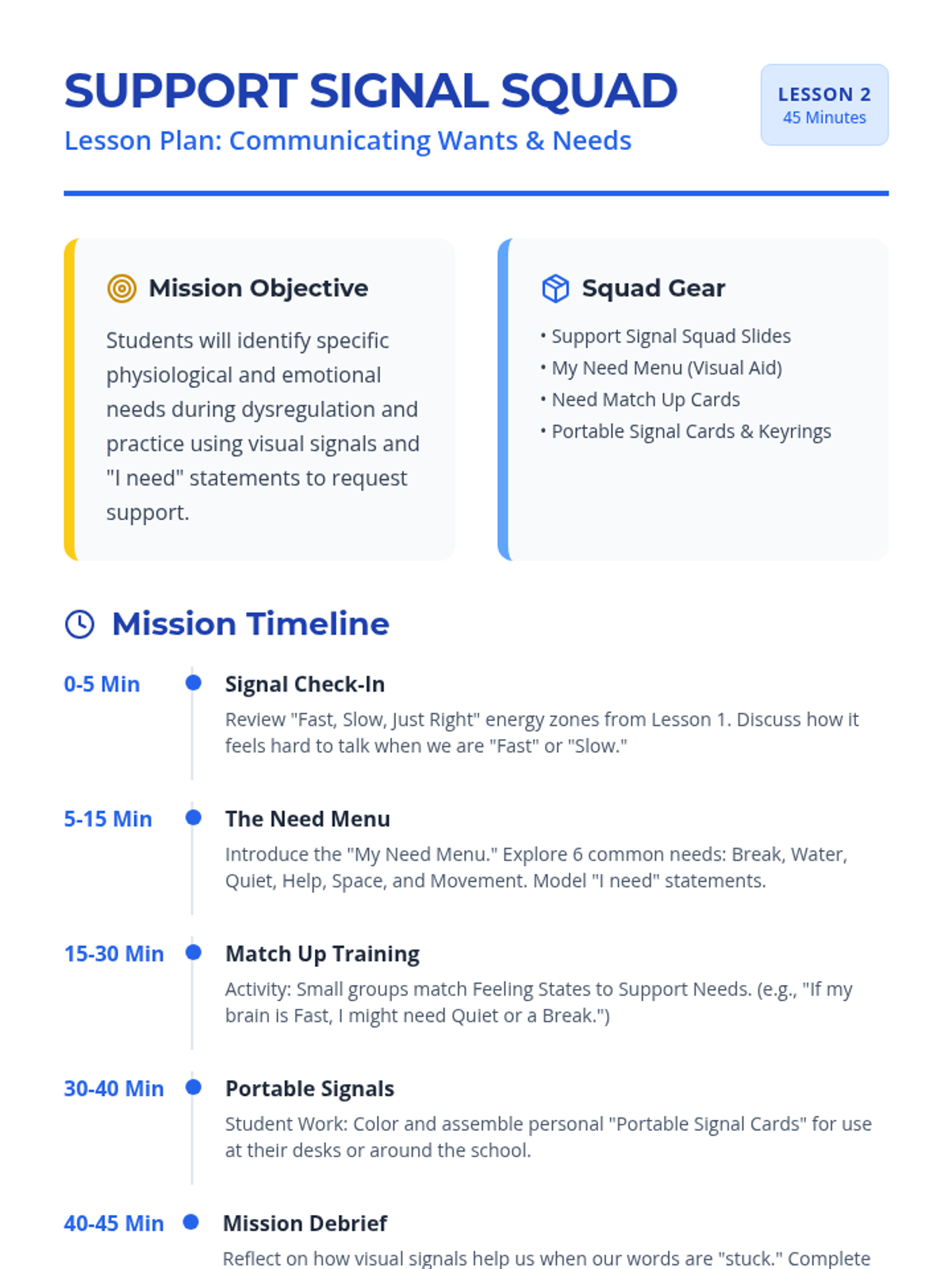 A 45-minute lesson focusing on identifying specific needs and practicing how to request support using visual signals and 'I need' statements, especially when feeling dysregulated.