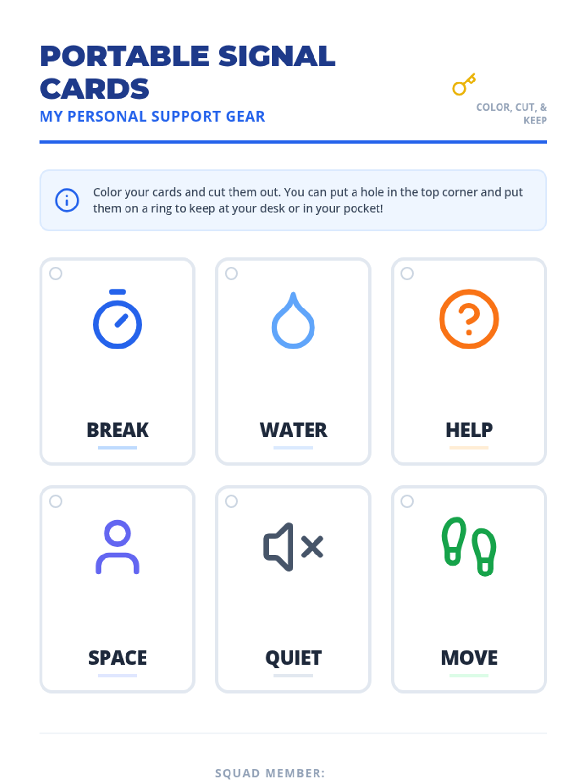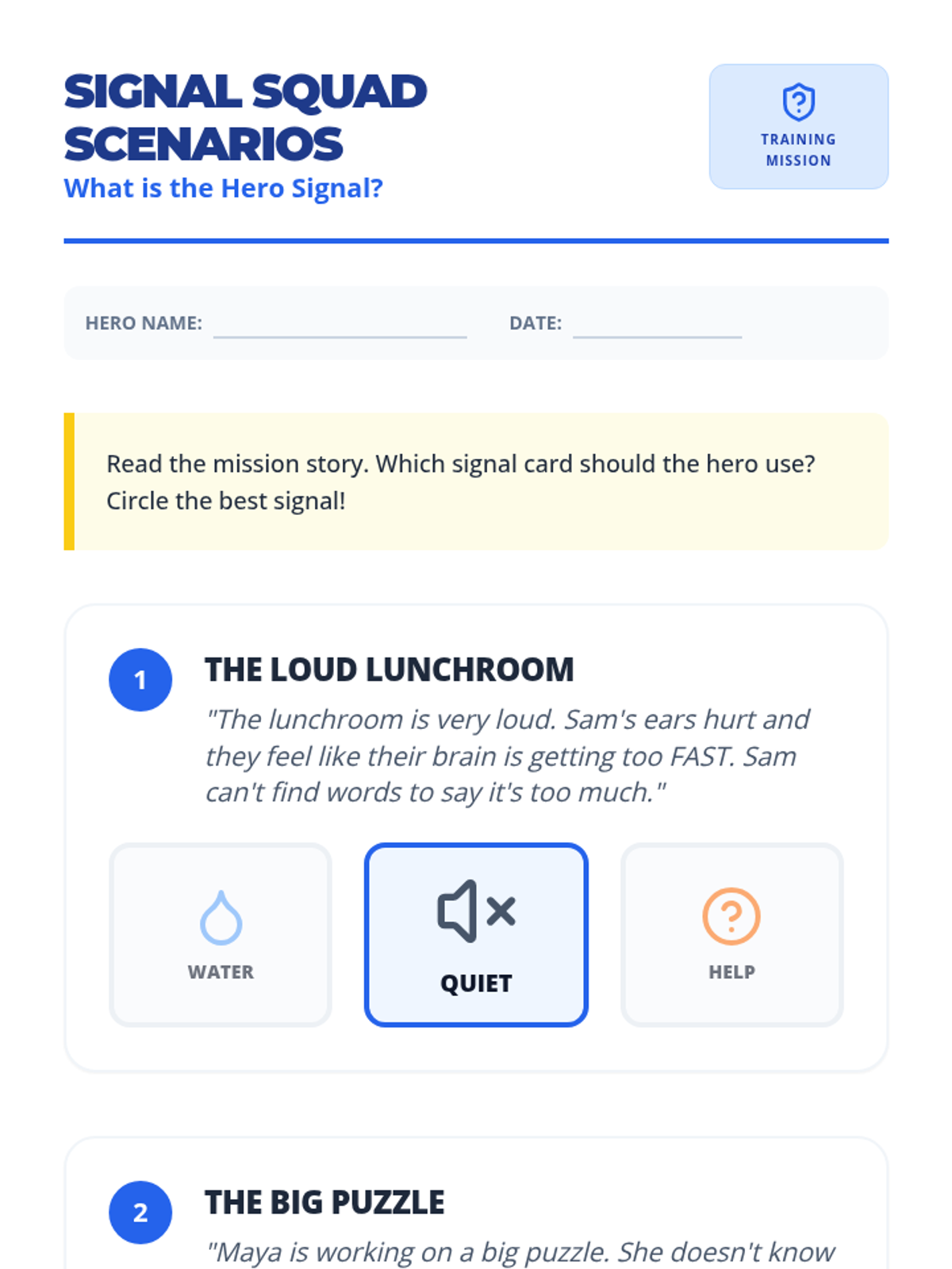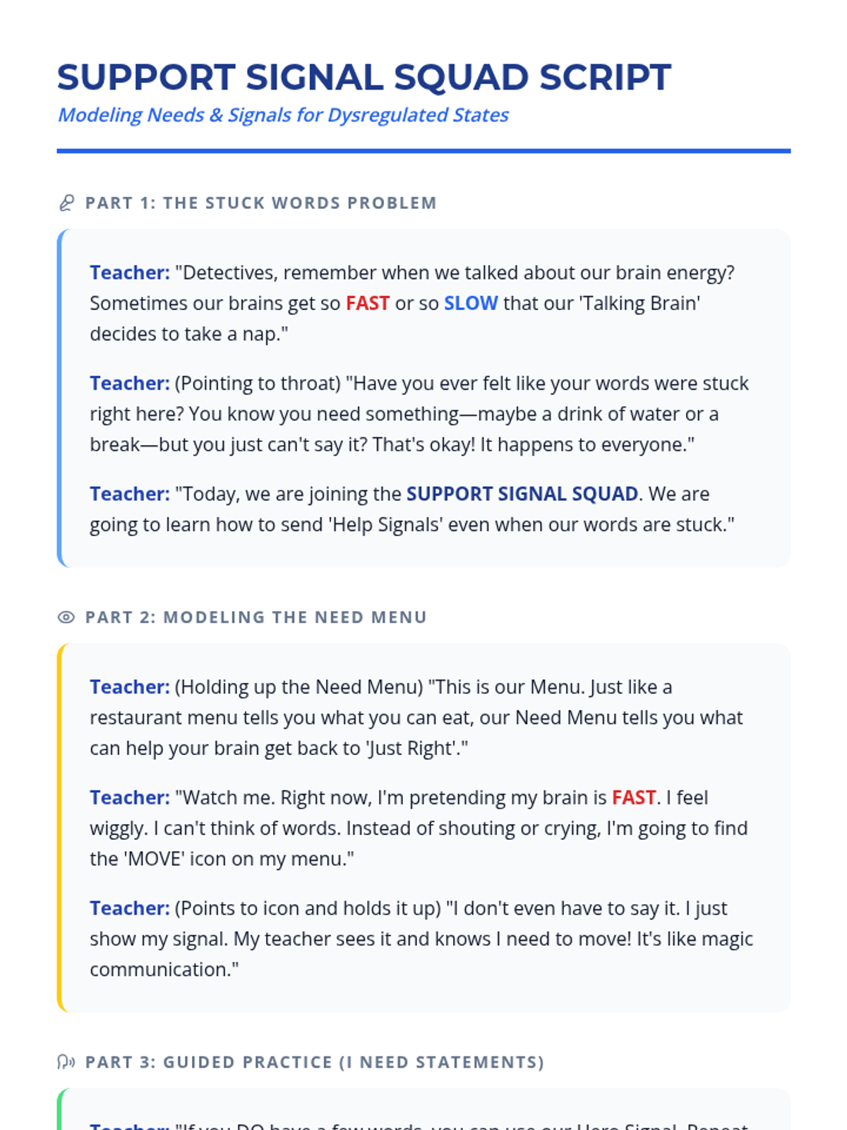 A 45-minute lesson focusing on identifying specific needs and practicing how to request support using visual signals and 'I need' statements, especially when feeling dysregulated.