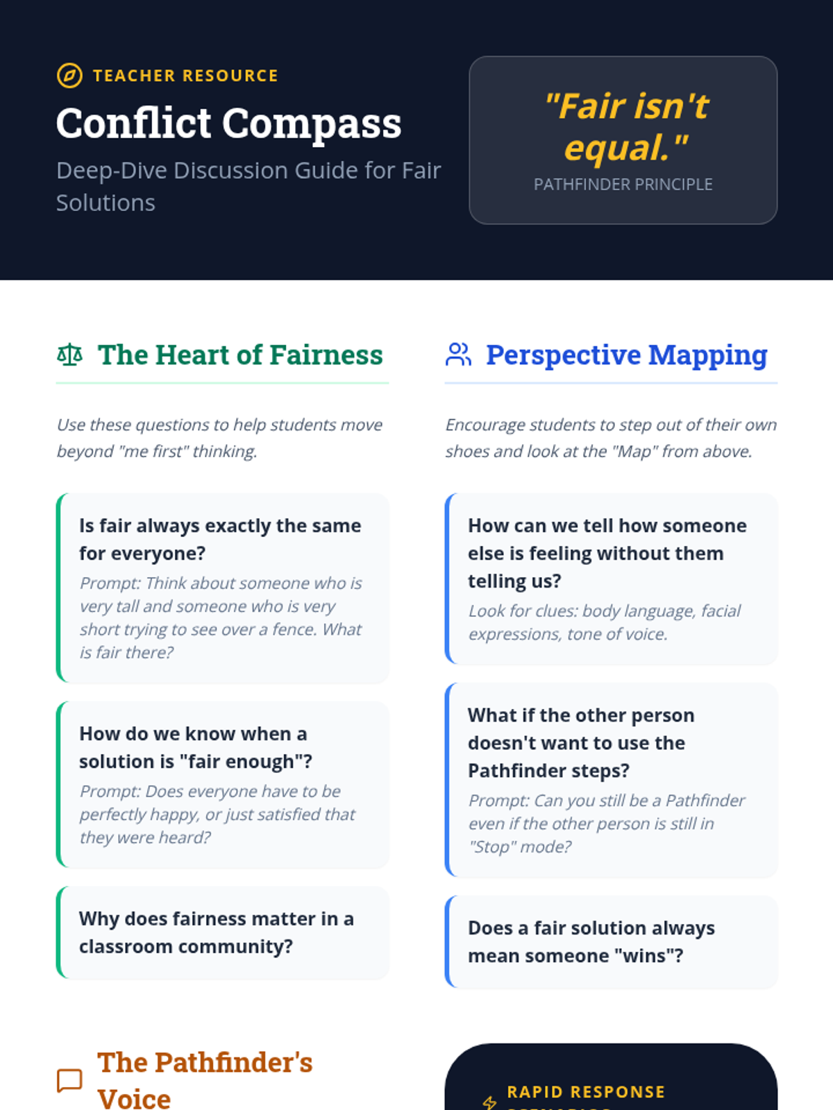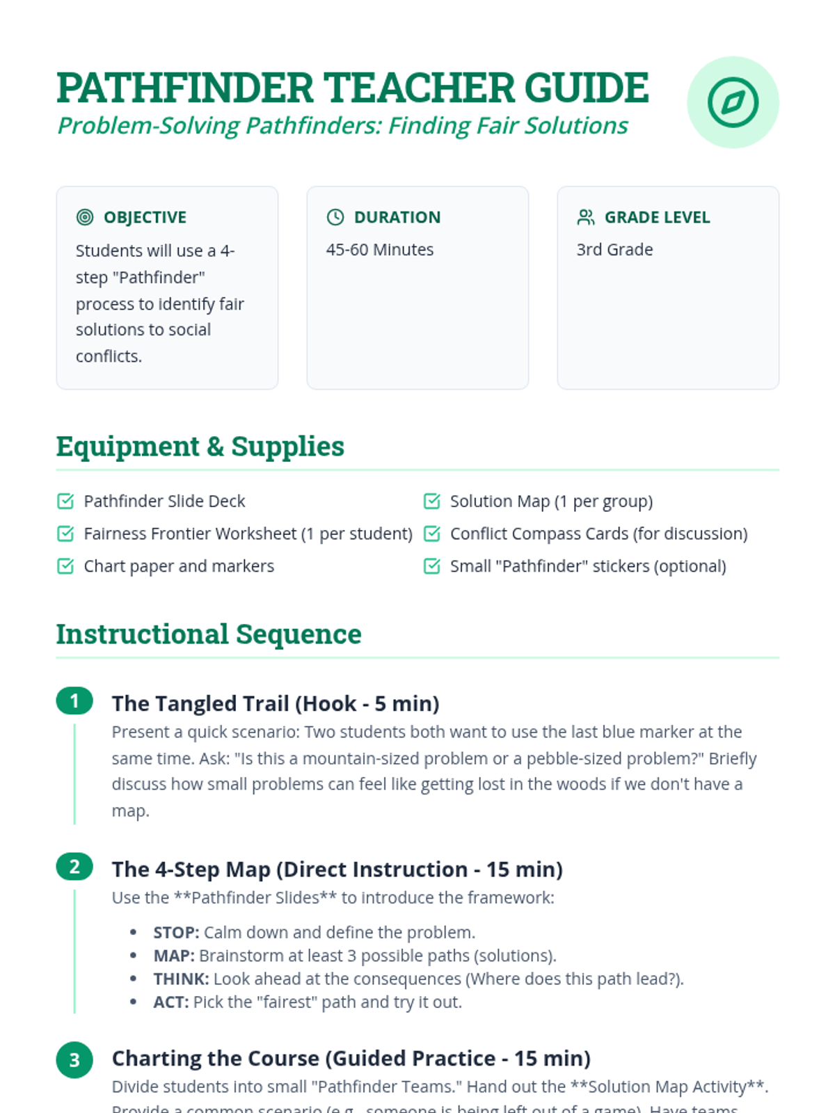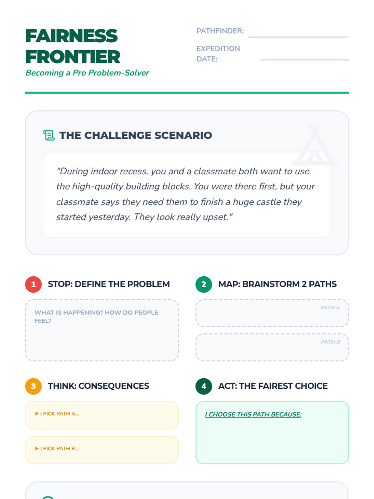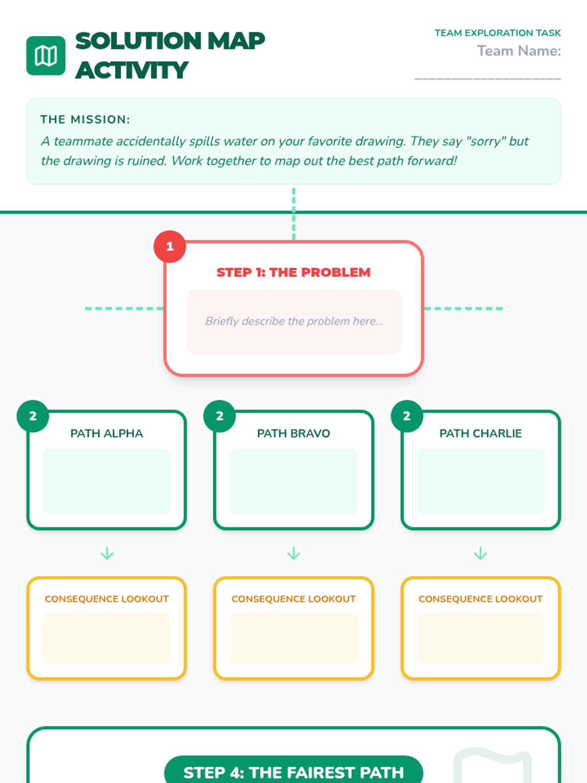 This lesson teaches 3rd graders a 4-step framework for resolving social conflicts and minor problems. Students learn to define problems, brainstorm fair solutions, and evaluate consequences through interactive mapping and scenario practice.
