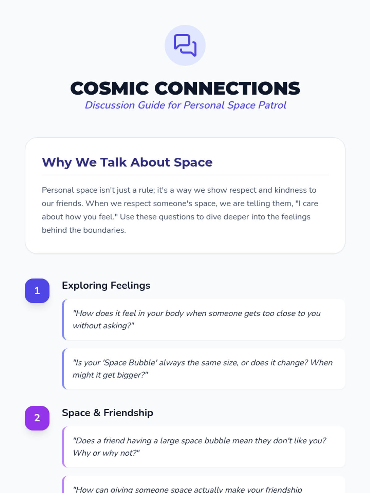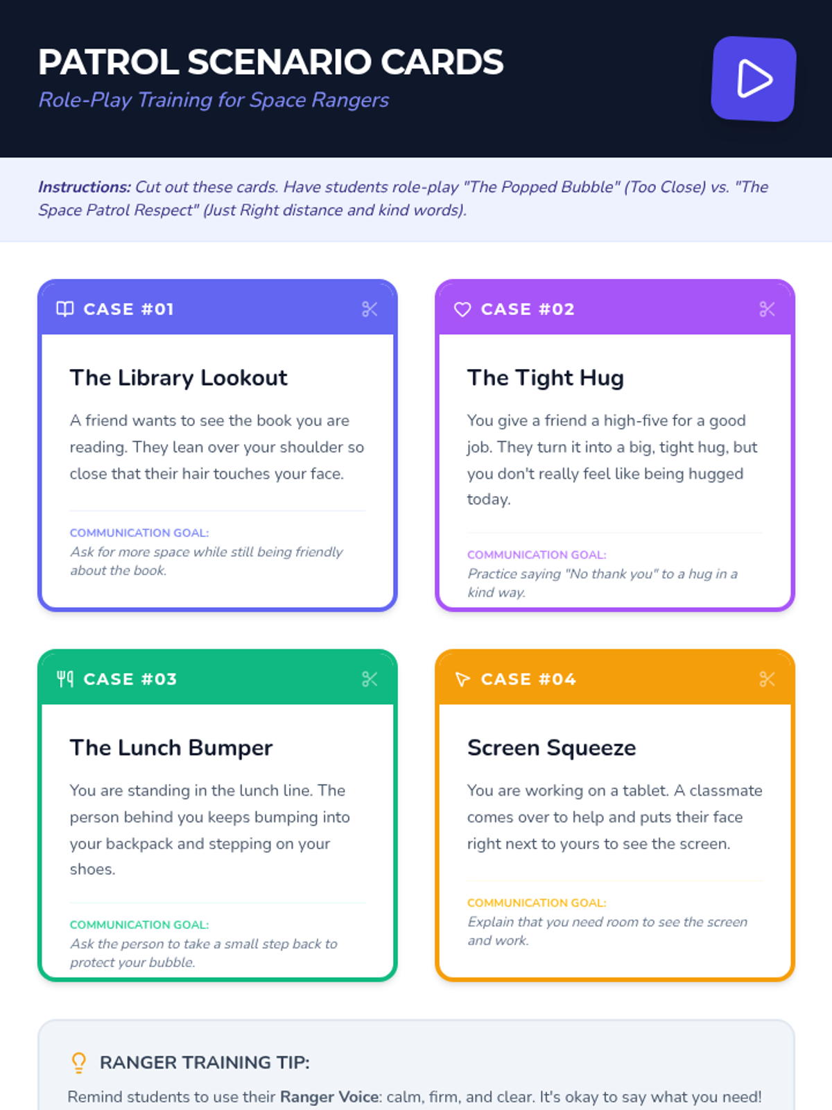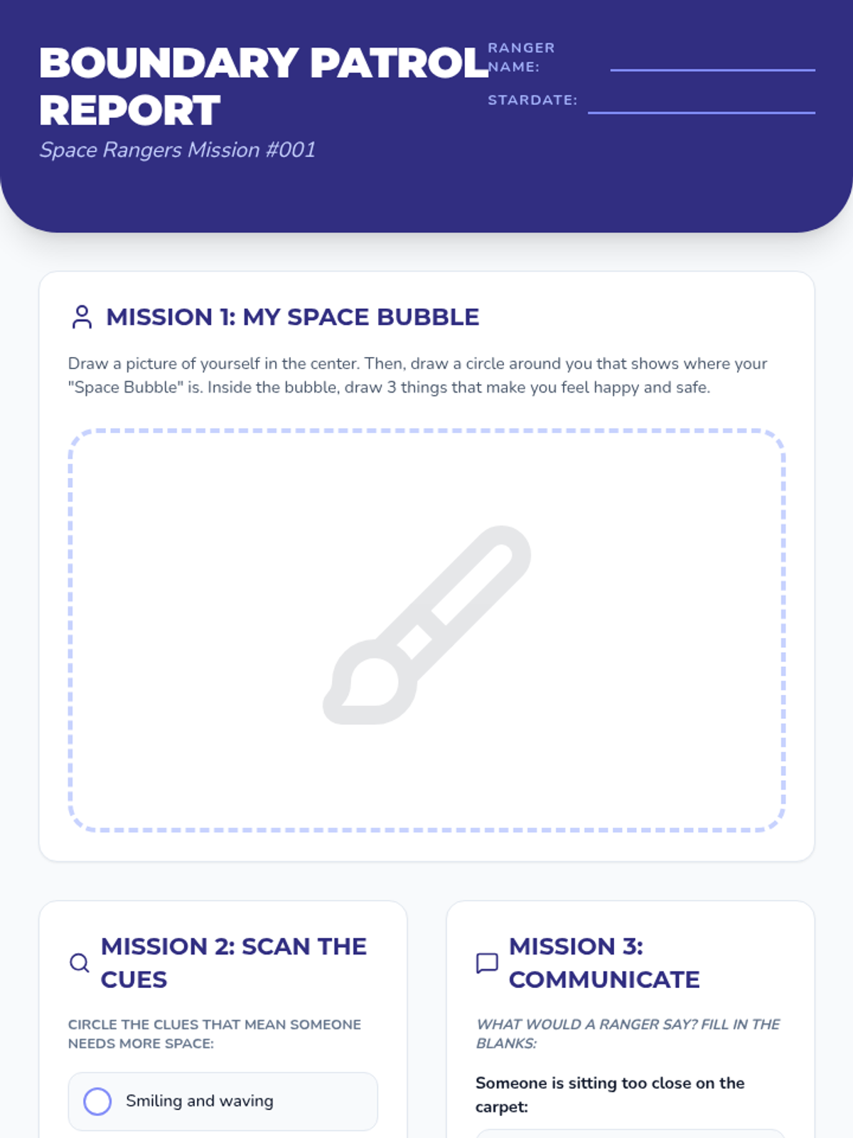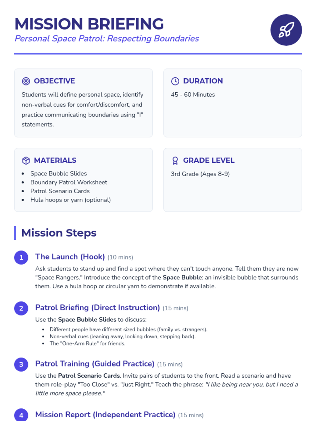 A social-emotional learning lesson for 3rd graders to understand, respect, and communicate personal space boundaries using a fun 'Space Patrol' theme. Students learn about 'space bubbles', non-verbal cues, and kind communication.