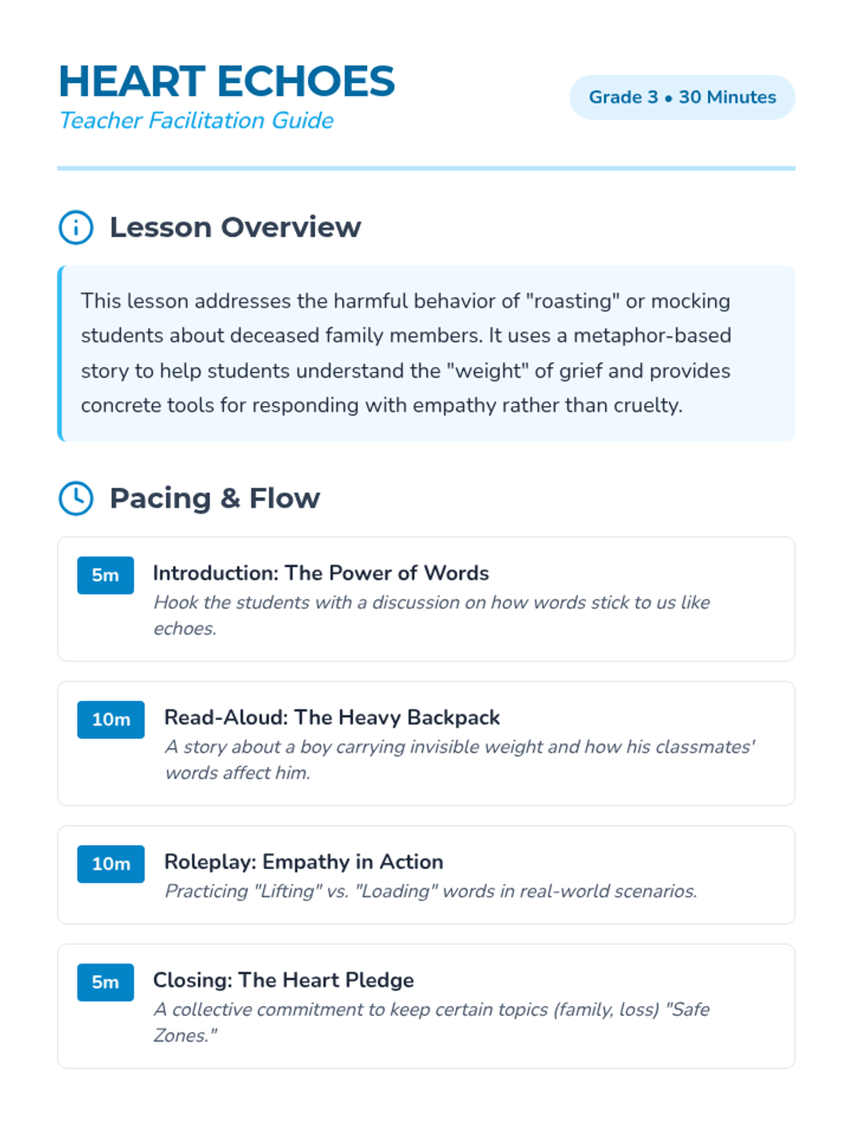 A 30-minute lesson designed to address insensitive behavior ('roasting') regarding deceased family members by building empathy and understanding of grief through storytelling and roleplay.