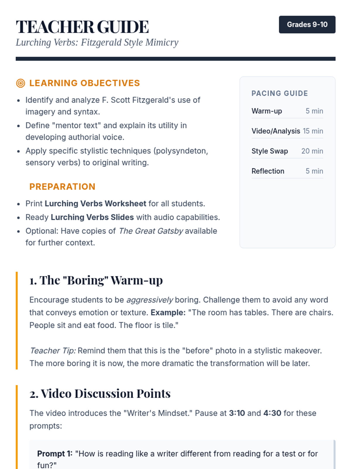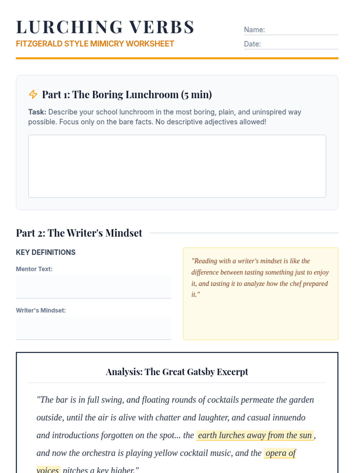 A high school English lesson focusing on stylistic mimicry using F. Scott Fitzgerald's 'The Great Gatsby' as a mentor text. Students analyze Fitzgerald's use of sensory language and complex sentence structures to transform mundane descriptions into vivid prose.
