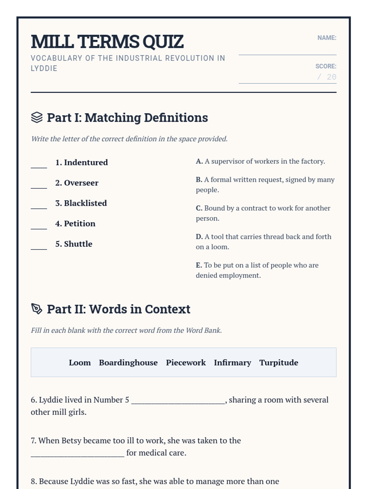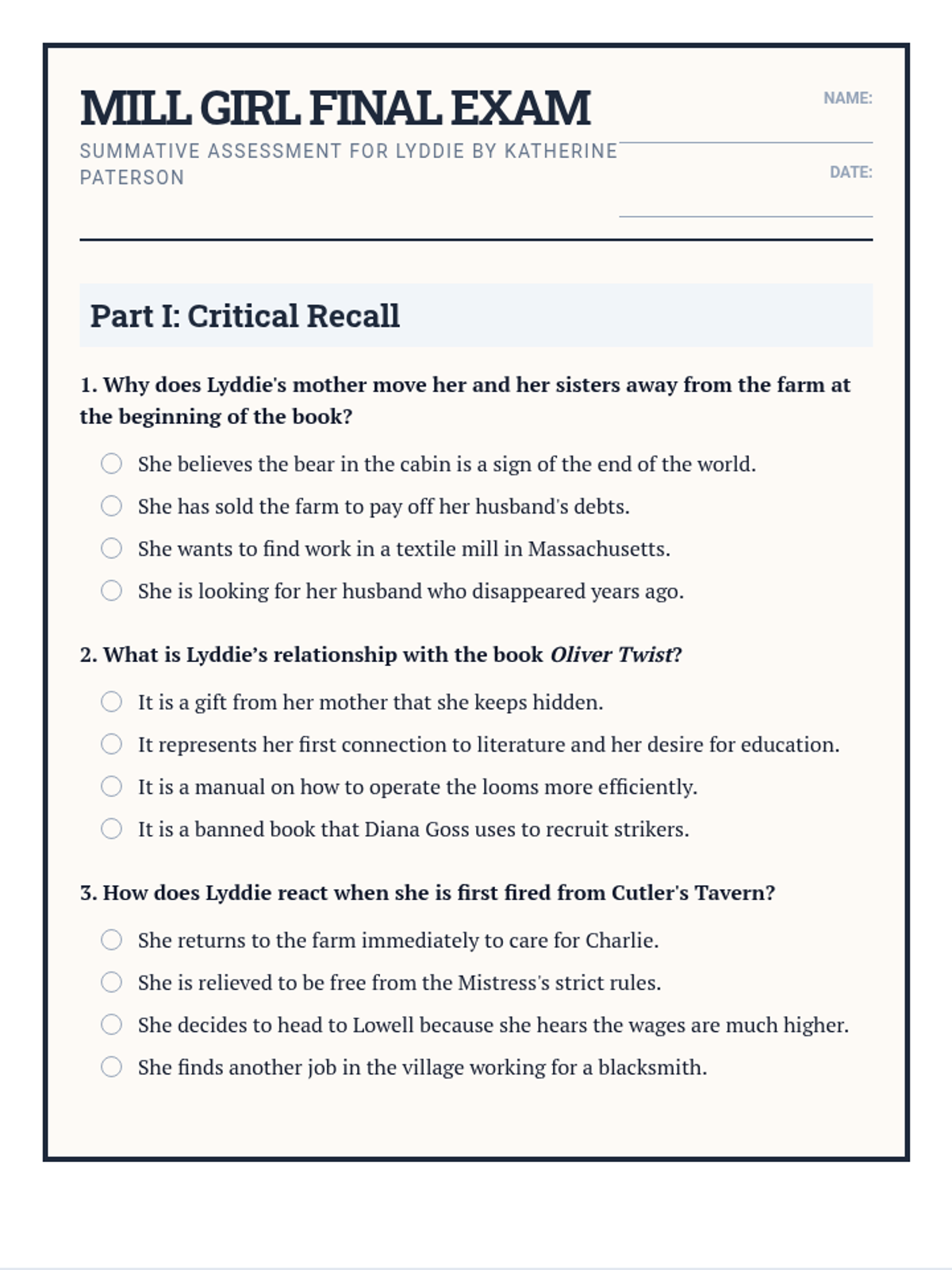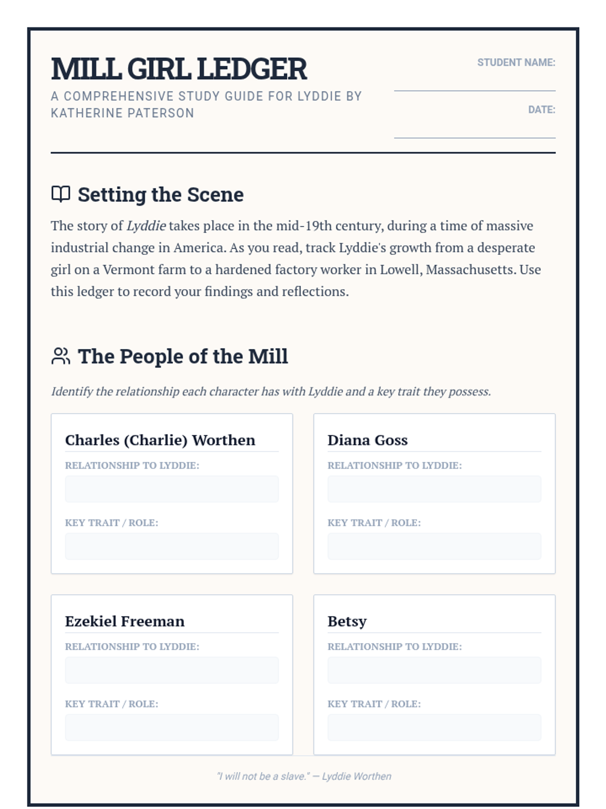 A comprehensive unit centered on Katherine Paterson's 'Lyddie', exploring the Industrial Revolution, labor rights, and the protagonist's journey from a Vermont farm to the Lowell mills.