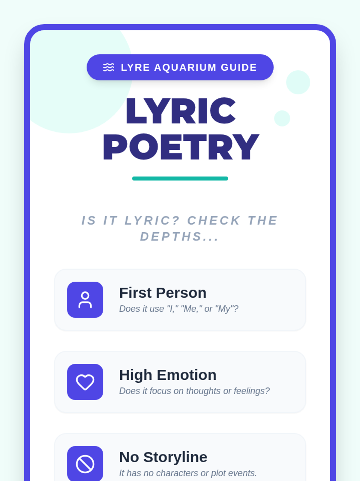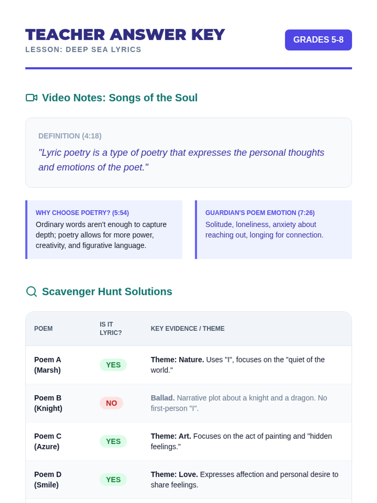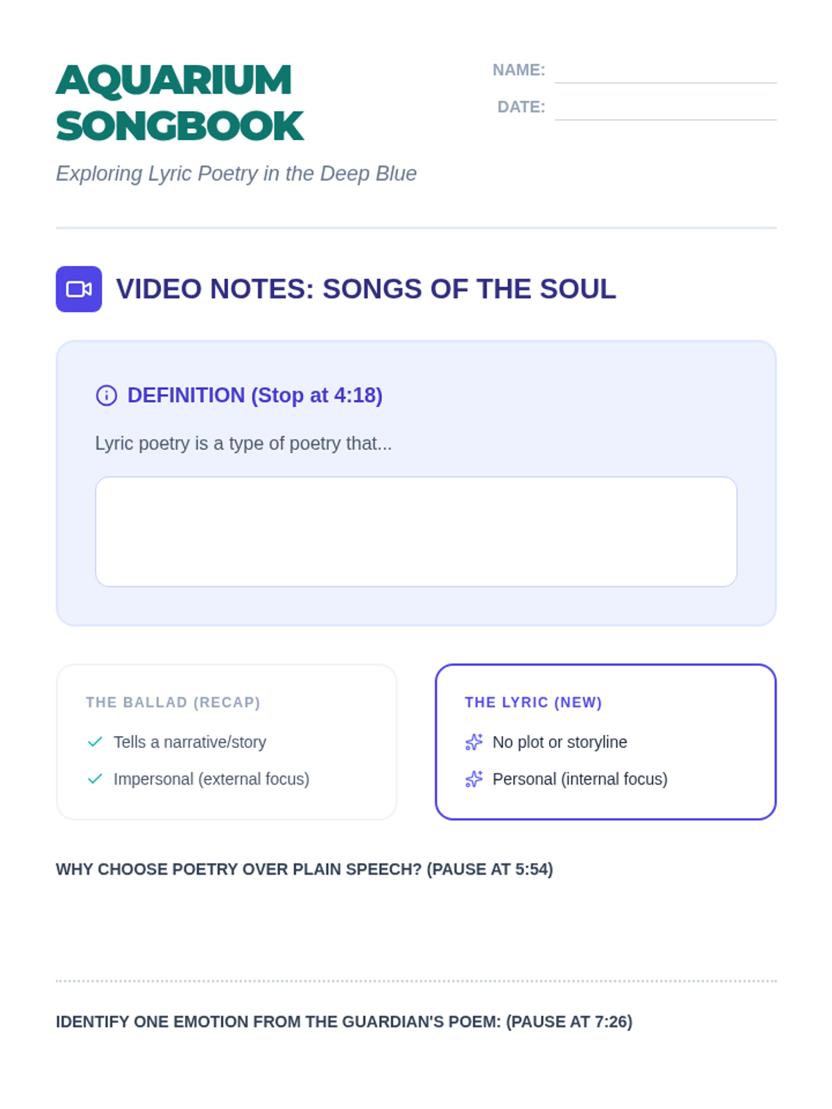 Students explore the depths of lyric poetry through a 'Lyre Aquarium' theme, defining characteristics like first-person perspective and emotional themes of nature, love, and art using a guided video and a scavenger hunt activity.