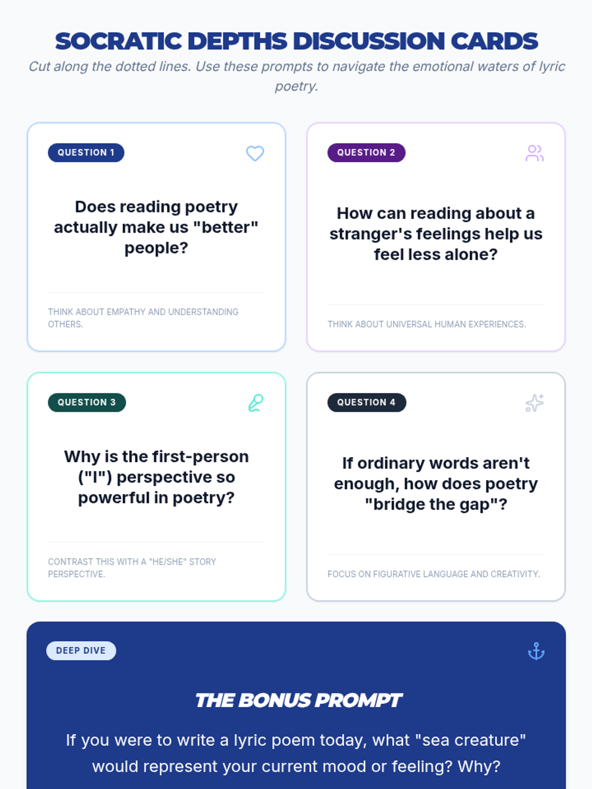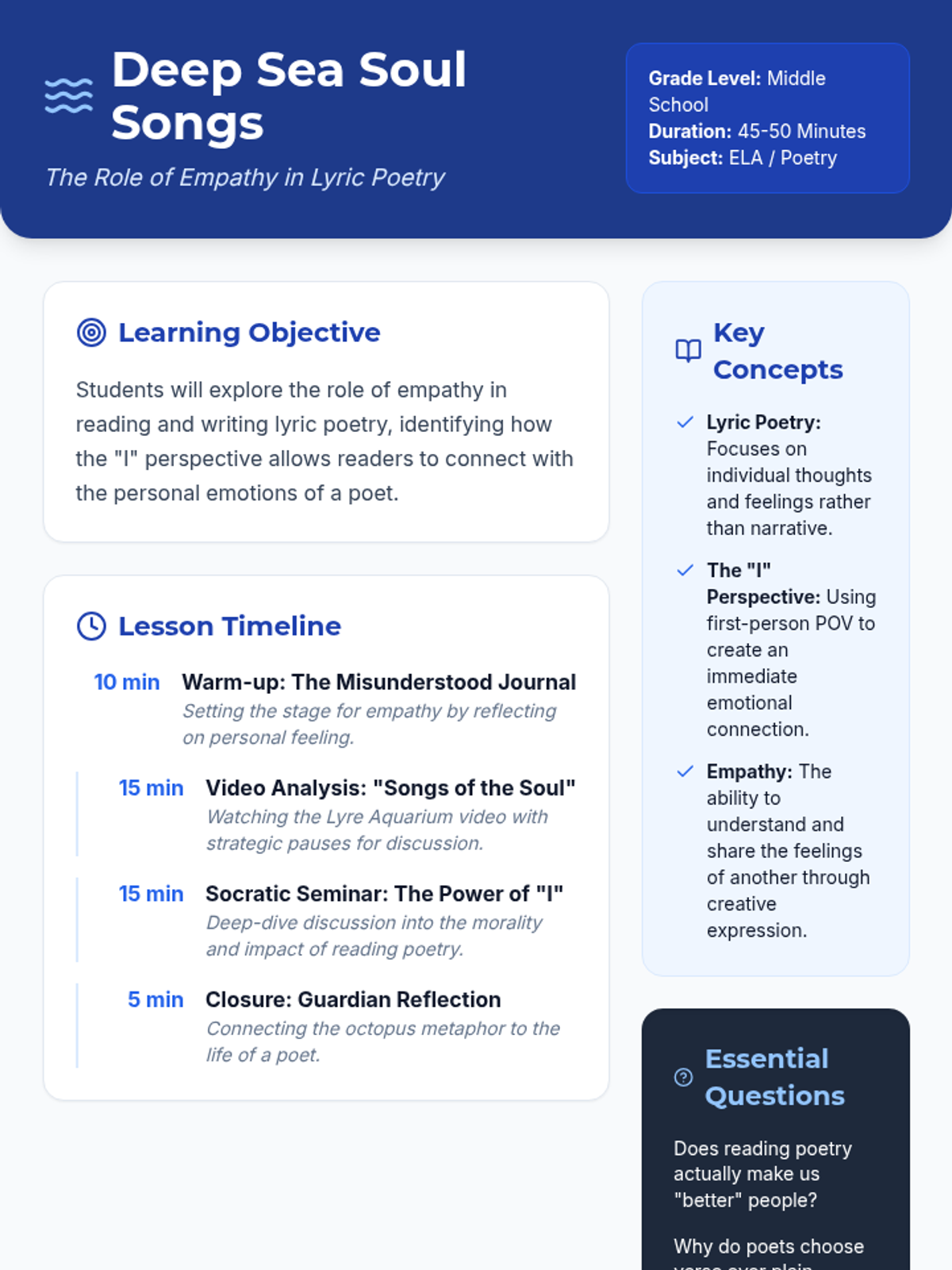 A lesson exploring the emotional depth of lyric poetry through the lens of empathy, using a narrative 'aquarium' theme to help students connect with personal expression and the 'I' perspective.
