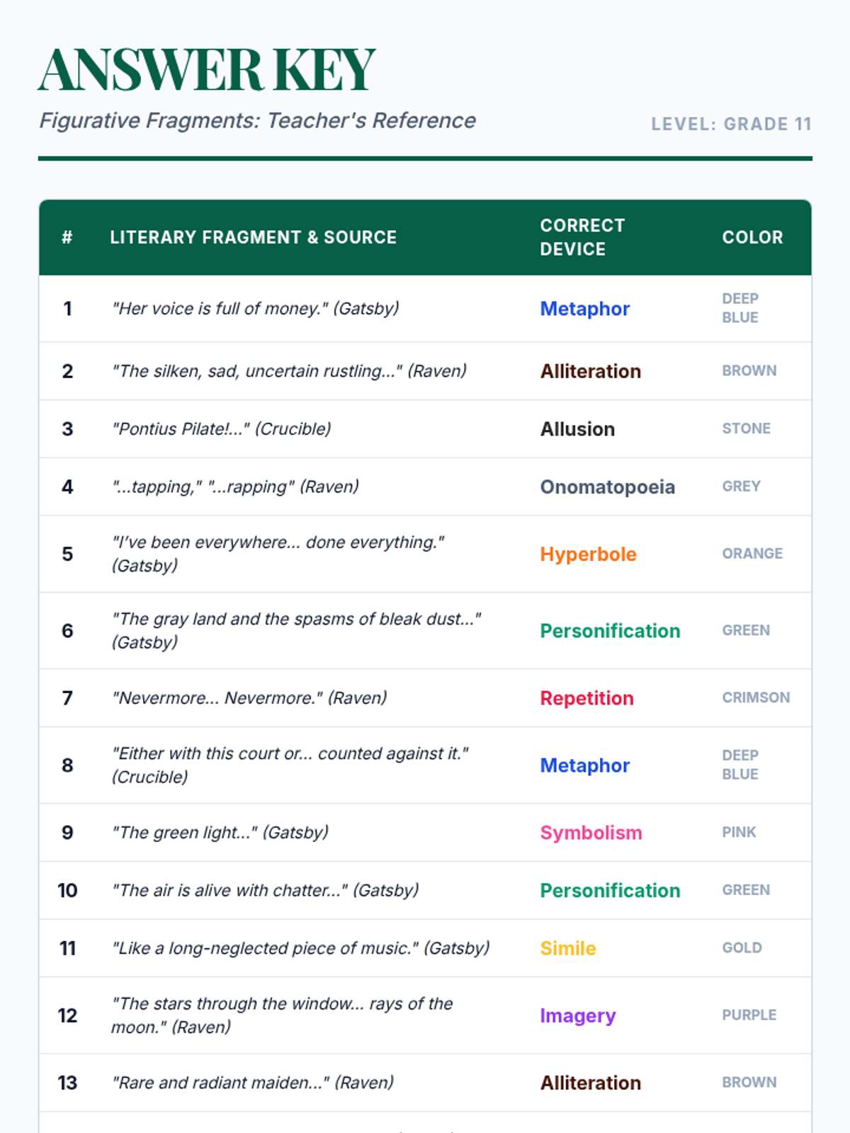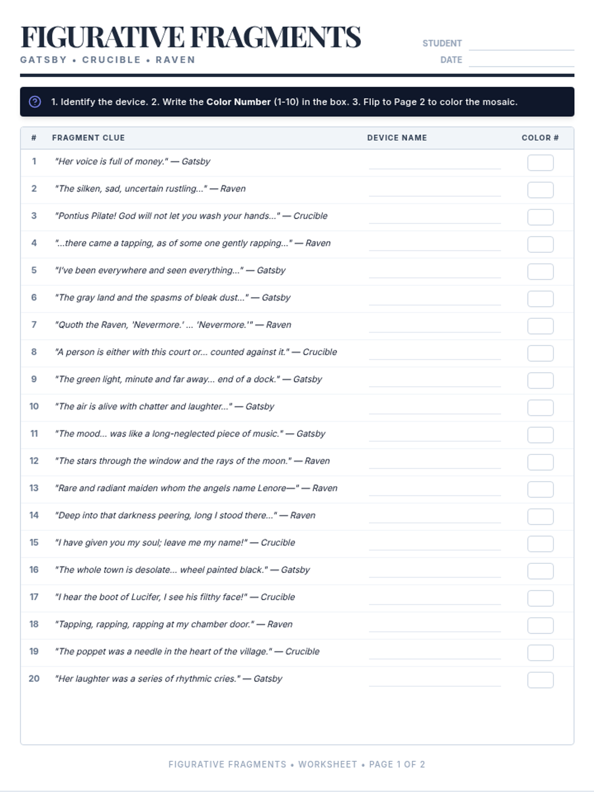 A sophisticated figurative language review for high school juniors featuring quotes from The Great Gatsby, The Crucible, and The Raven. Students identify literary devices to unlock a color-coded geometric mosaic.