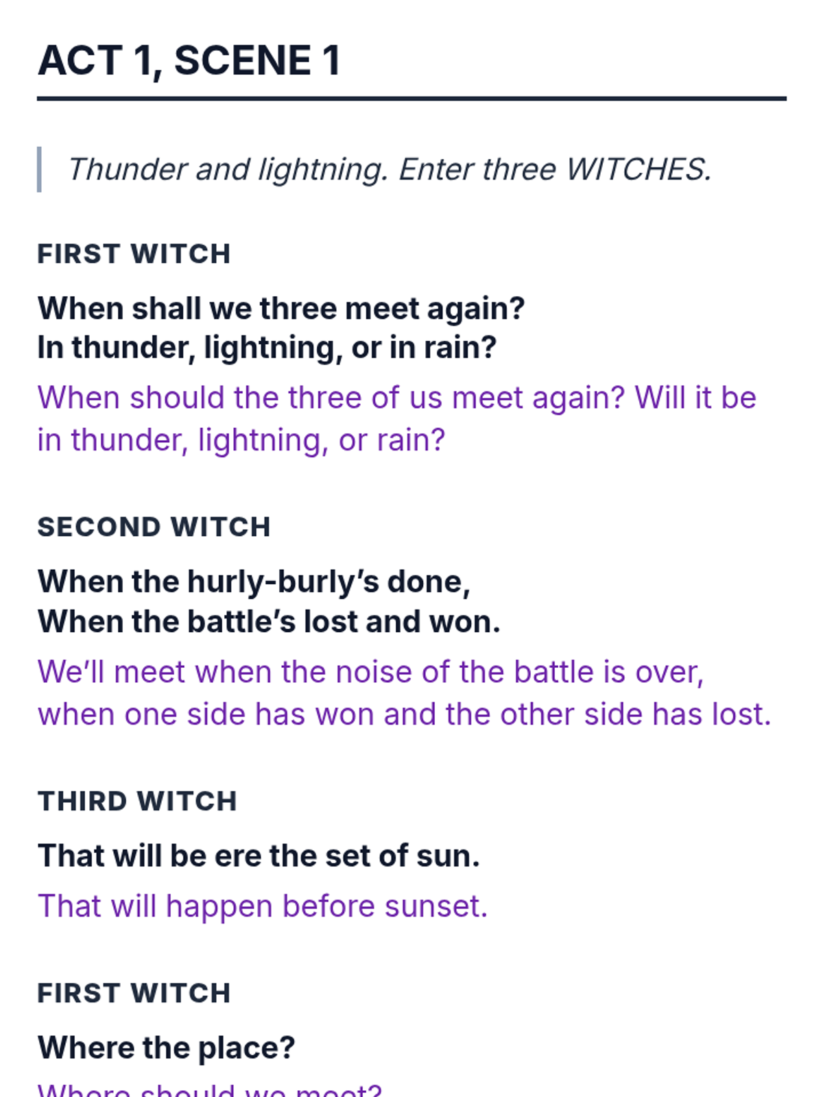 A full set of large-print, accessible script materials for Shakespeare's Macbeth, designed for students needing 20px font. Includes interleaved modern translations and original text with original page references.