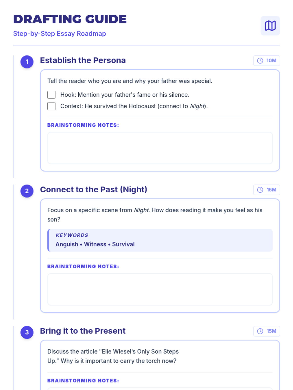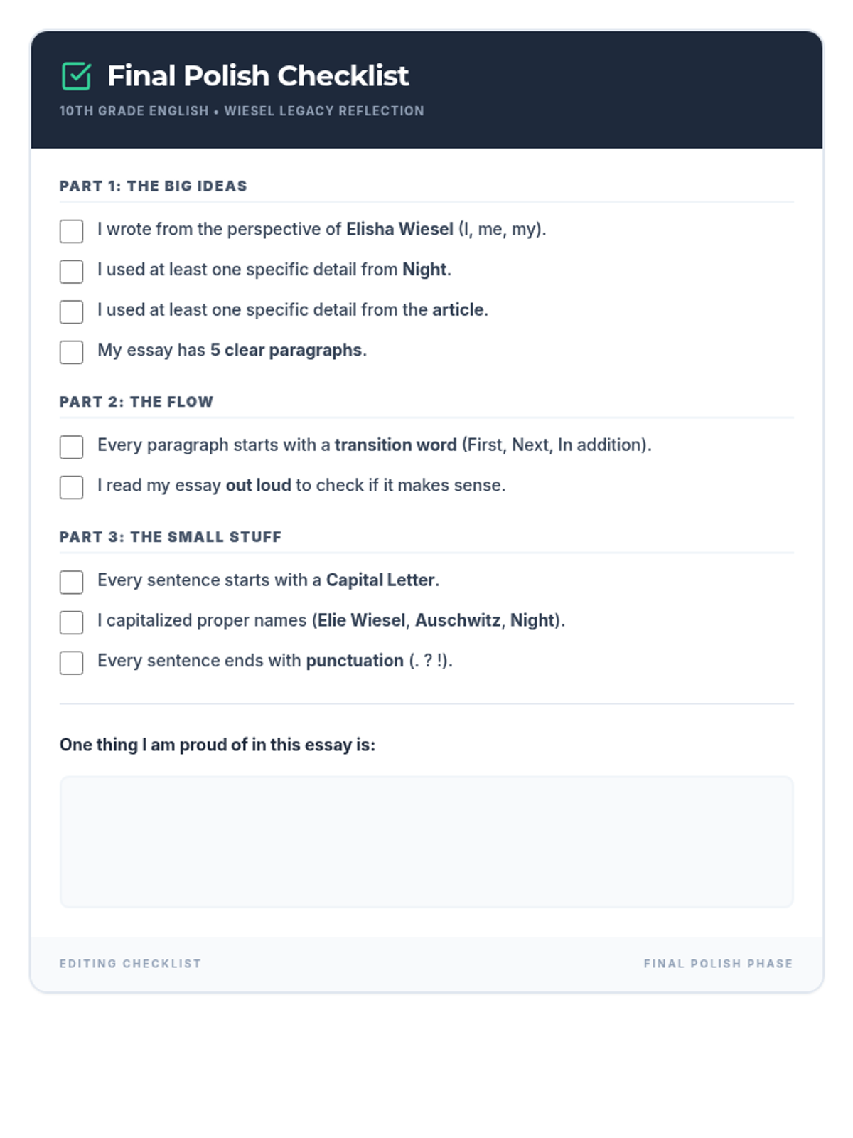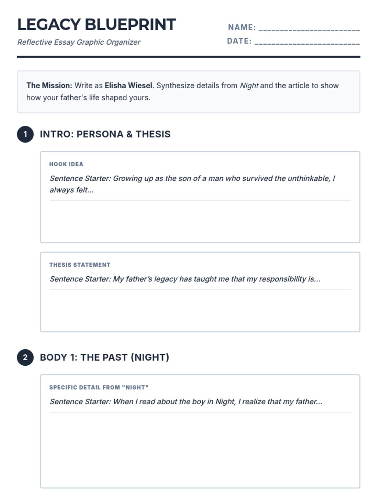 A set of scaffolded writing resources designed to help students with ADHD and SLD craft a 5-paragraph reflective essay from the perspective of Elisha Wiesel. The materials focus on synthesizing themes from 'Night' and a contemporary article about Wiesel's legacy.