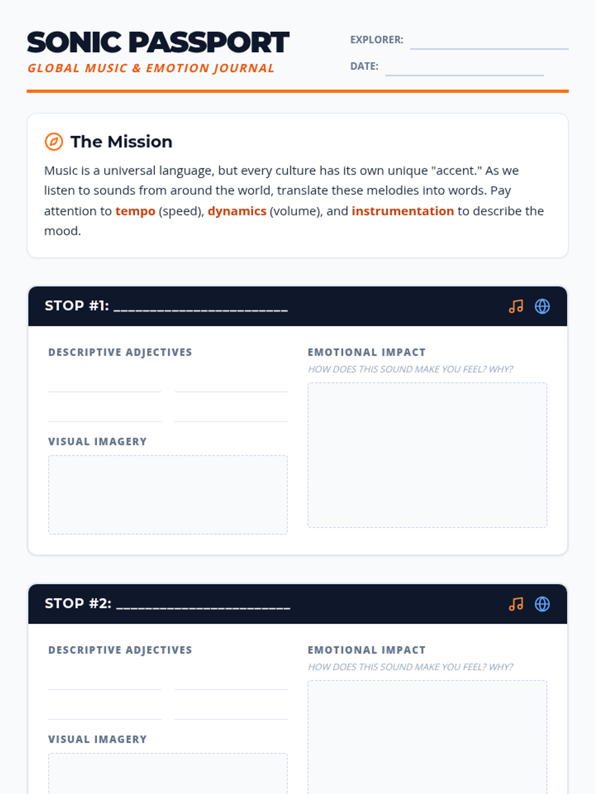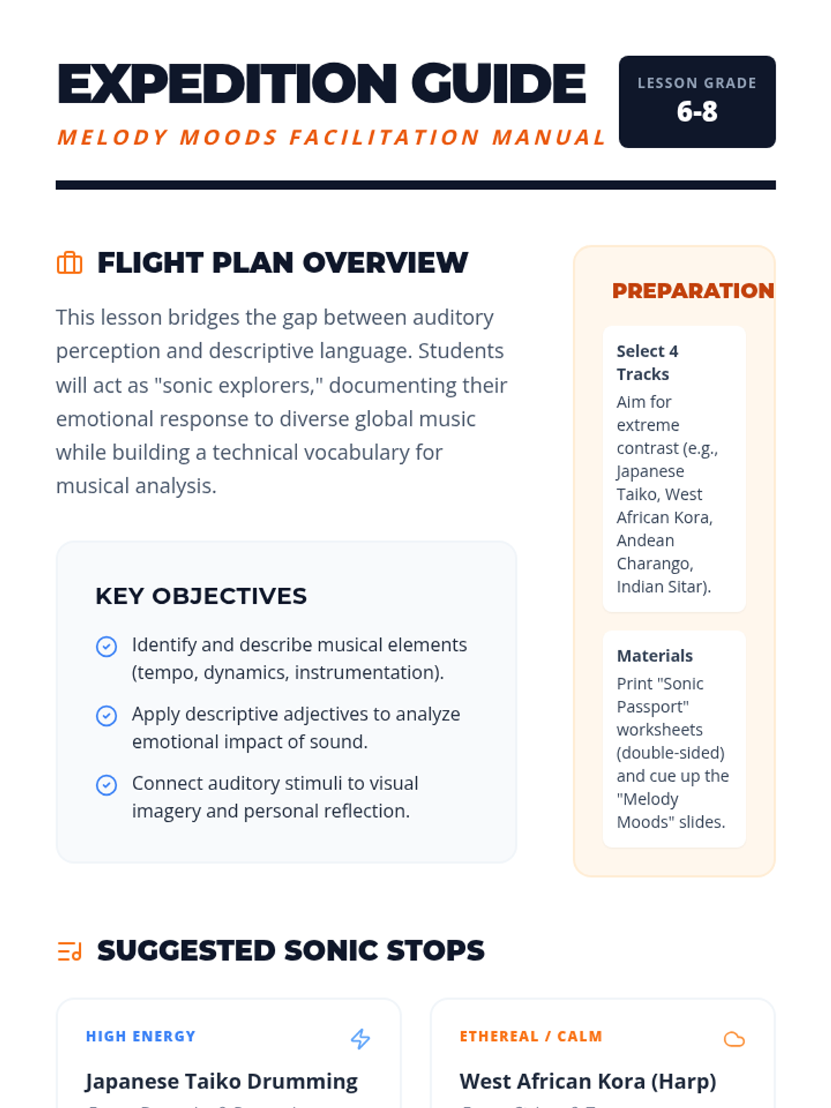 A lesson exploring the intersection of global music and emotional expression through descriptive writing and active listening. Students will journey through various musical landscapes, analyzing how different cultures use sound to convey mood.