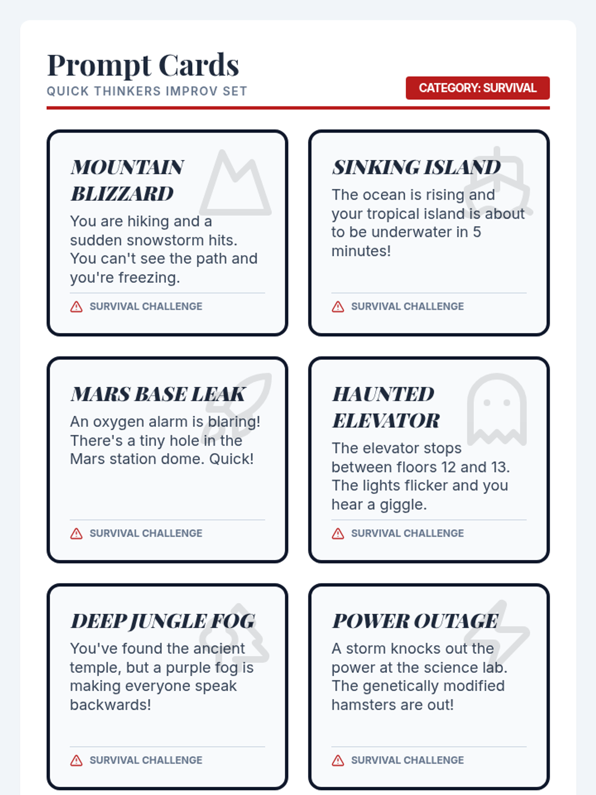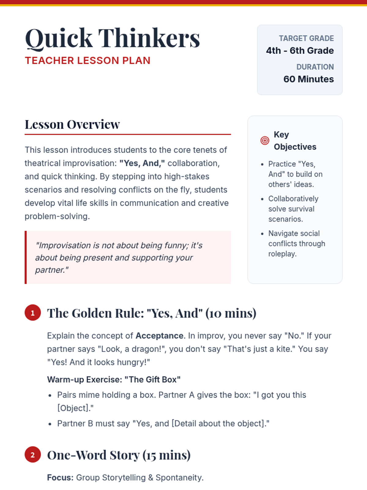 A high-energy theatre lesson for grades 4-6 that uses improvisation games to build spontaneity, teamwork, and creative problem-solving skills through storytelling and survival scenarios.