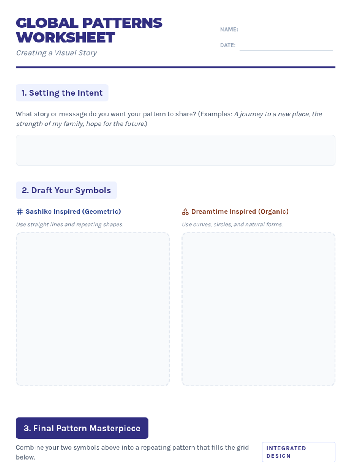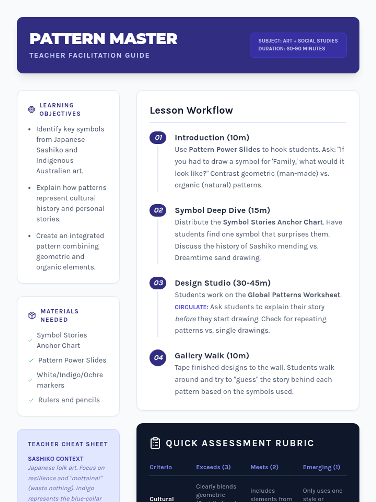 A cross-curricular art and social studies lesson where students explore the history and symbolism of Japanese Sashiko and Indigenous Australian Dreamtime art to create their own meaningful patterns.