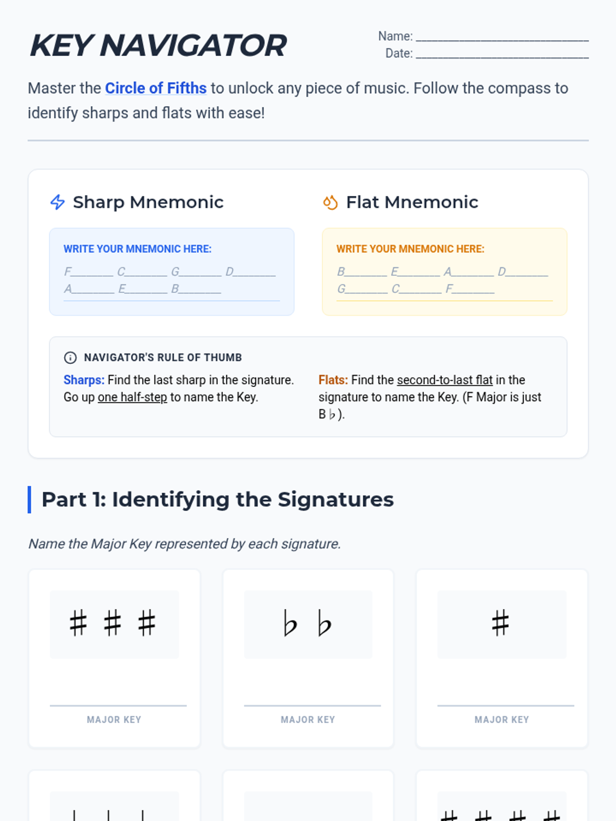 A foundational lesson on understanding the Circle of Fifths and identifying major key signatures for 7th-grade music students.