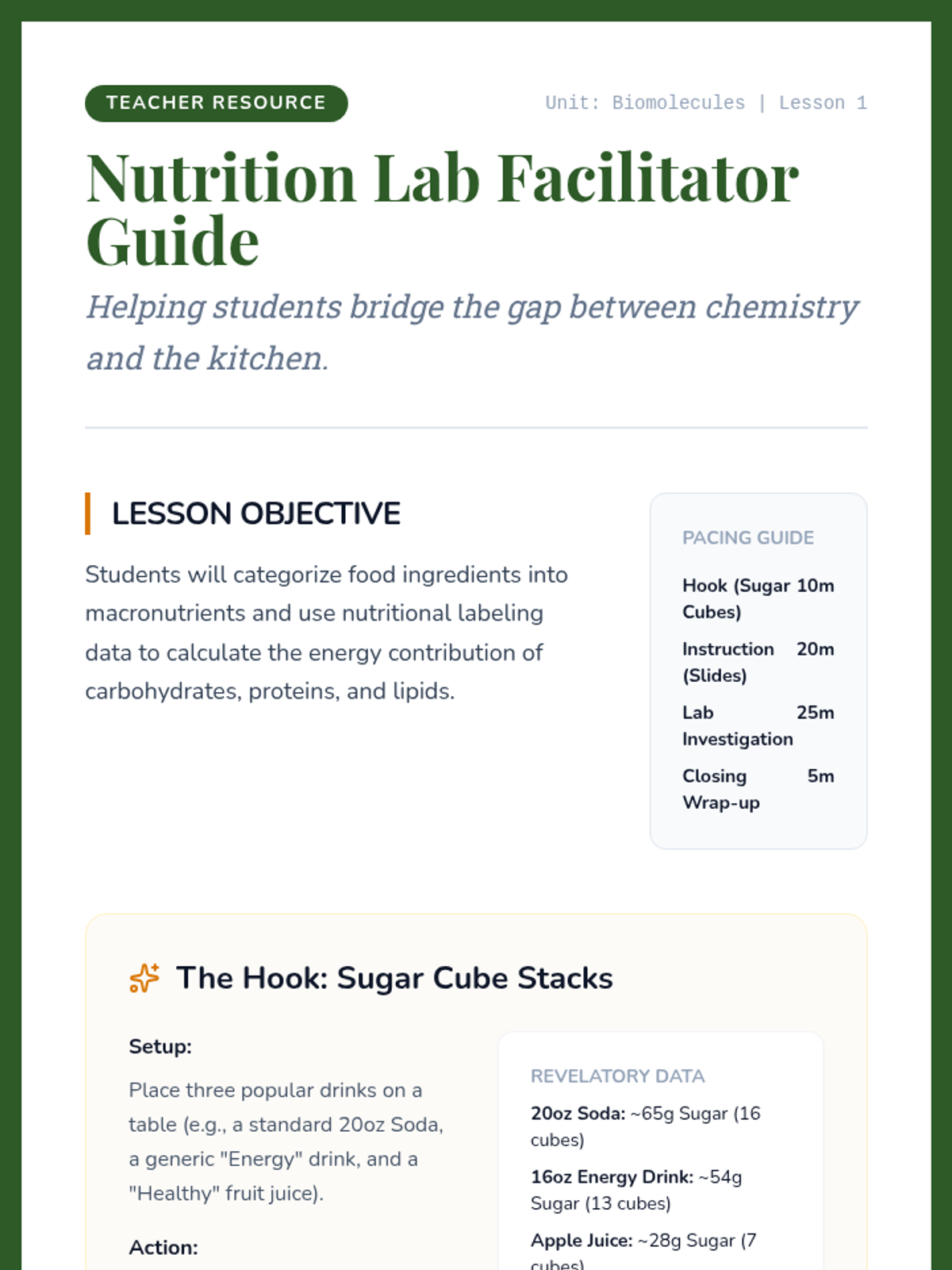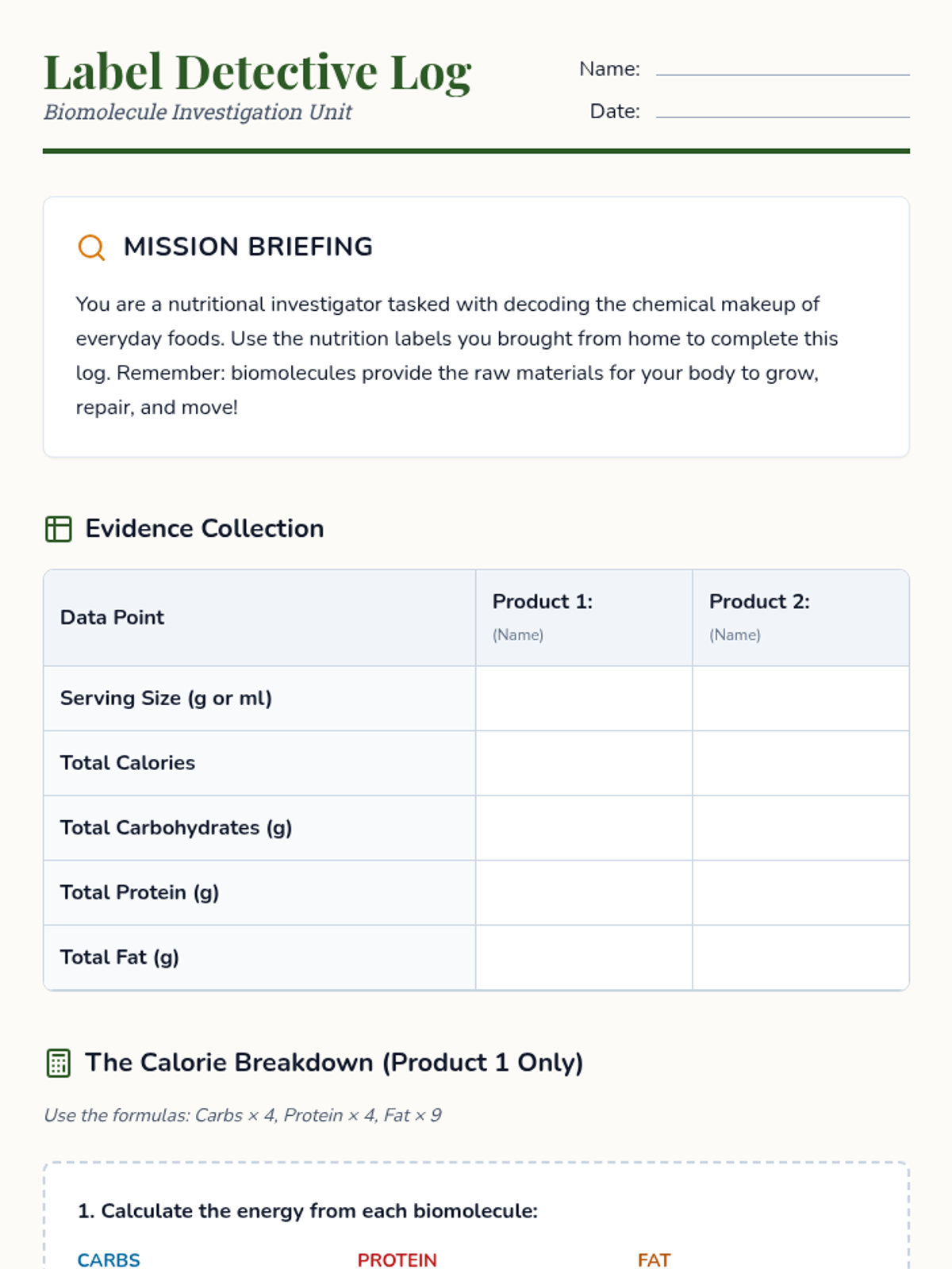 Students categorize ingredients into macronutrients and learn to decode nutritional labels to calculate energy sources.