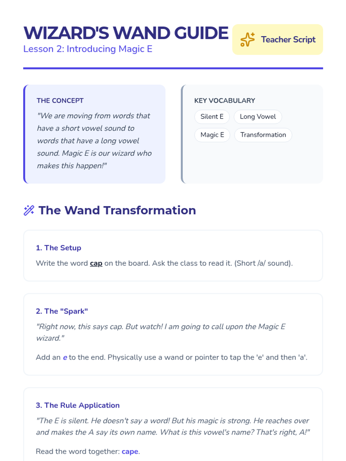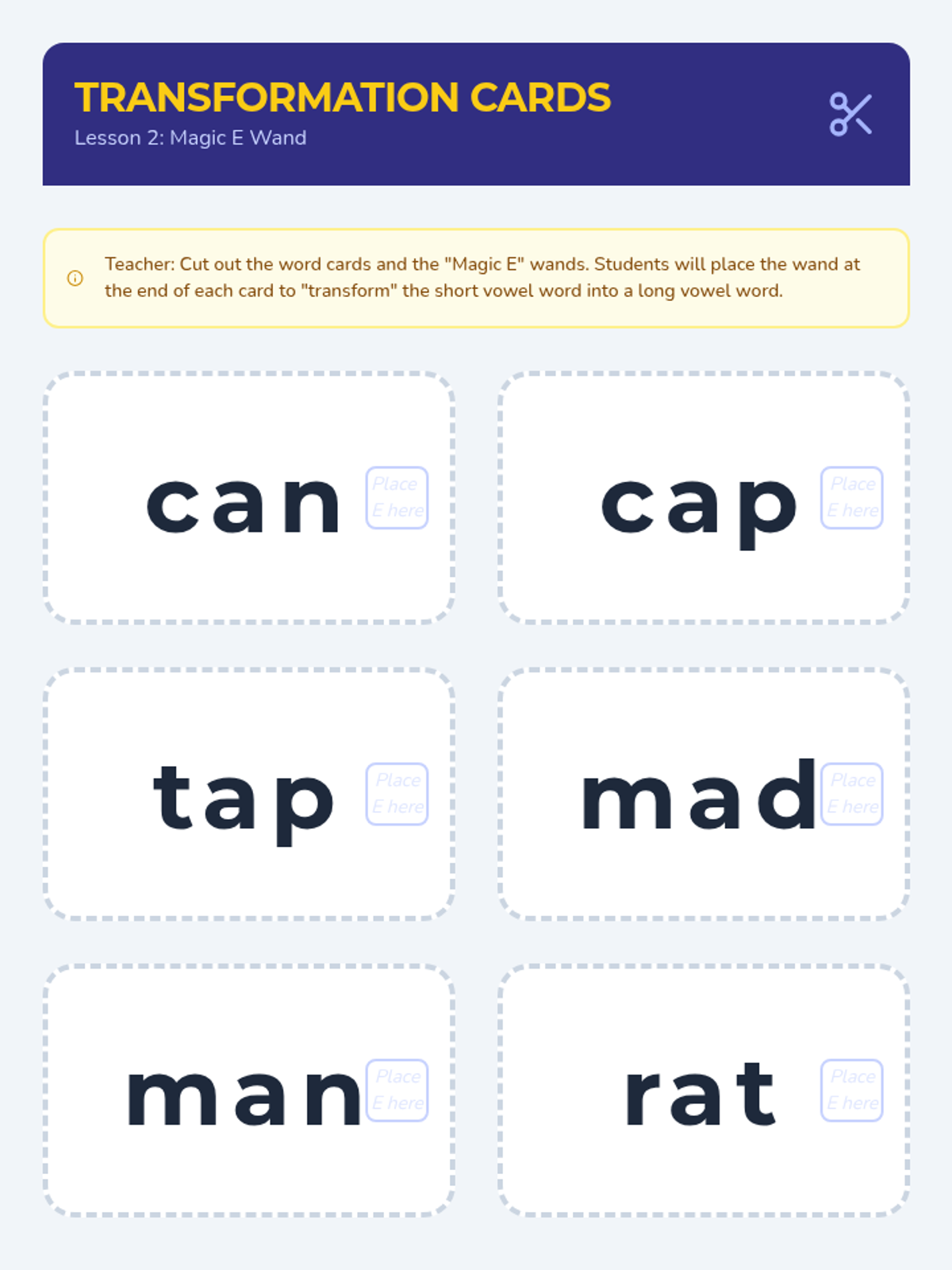 Introducing the 'Magic E' concept for the letter 'a', showing how a silent 'e' transforms short vowel words into long vowel words.