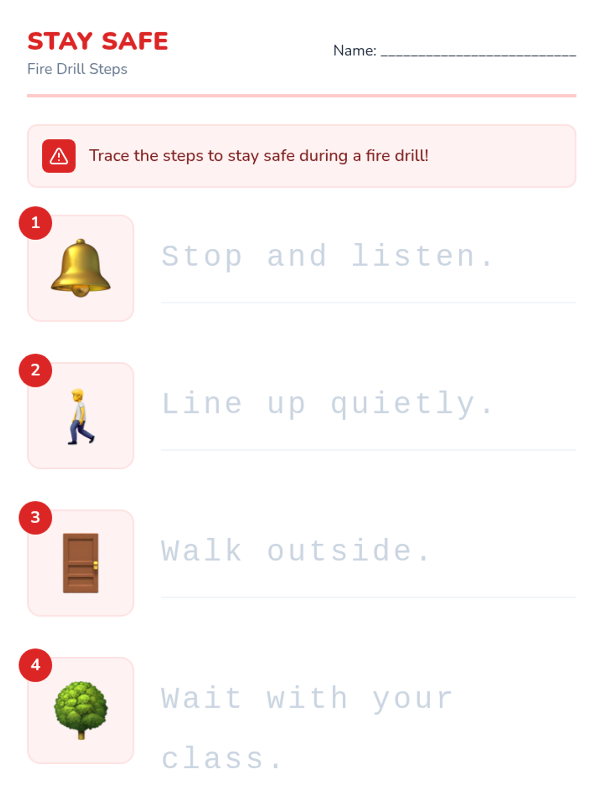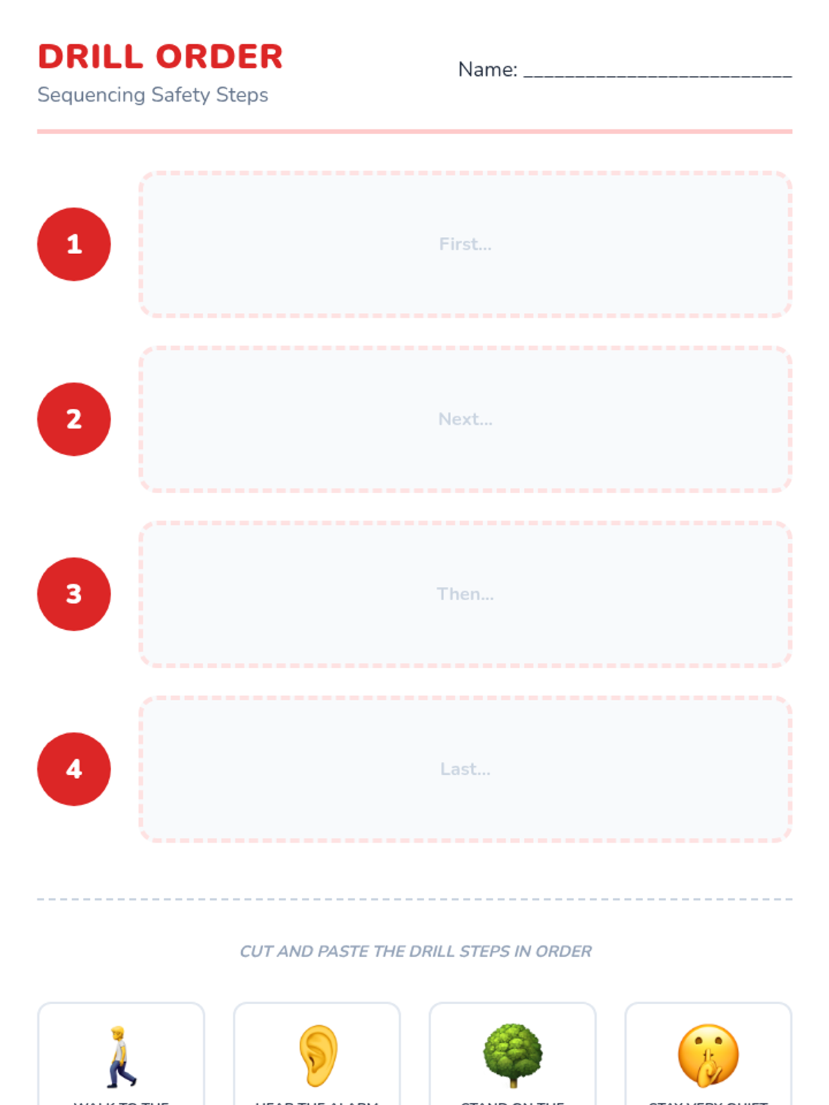 Students learn and sequence the steps of a school fire drill through tracing and cut-and-paste sorting.