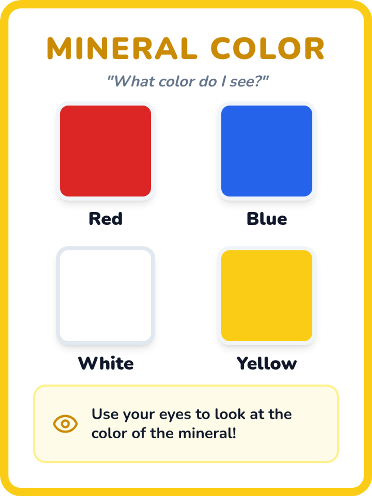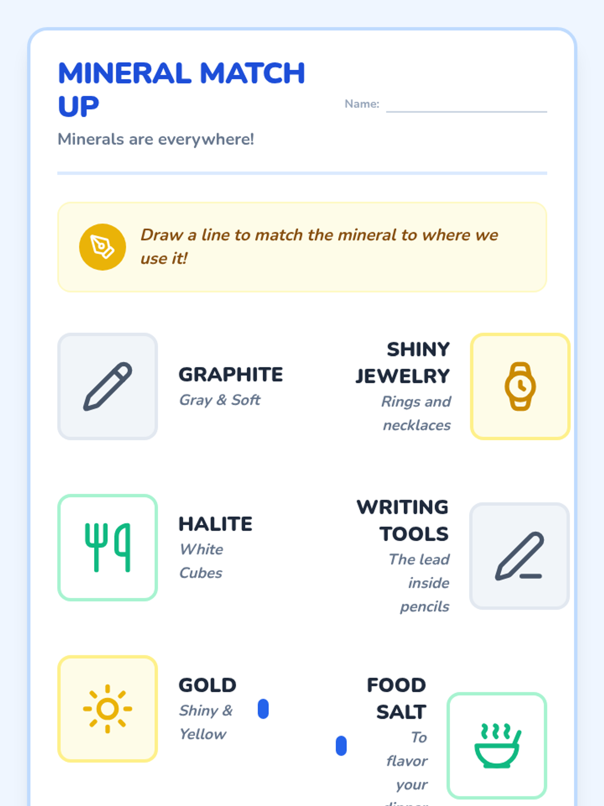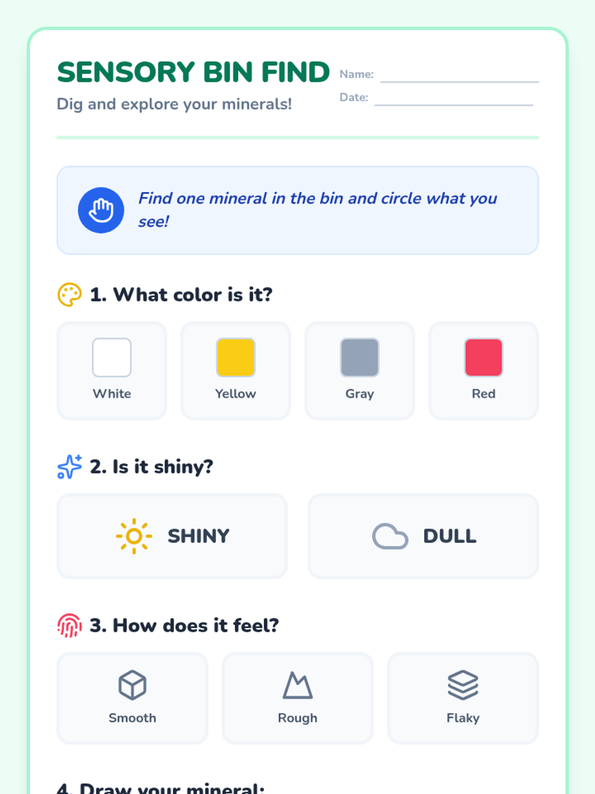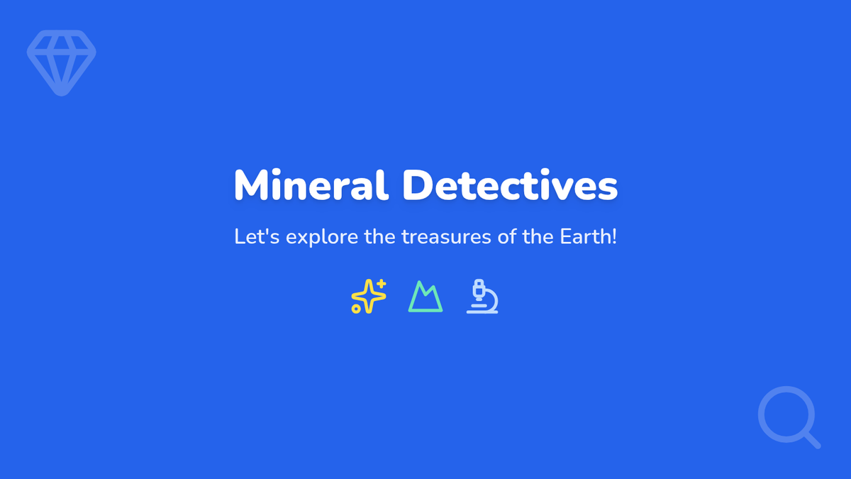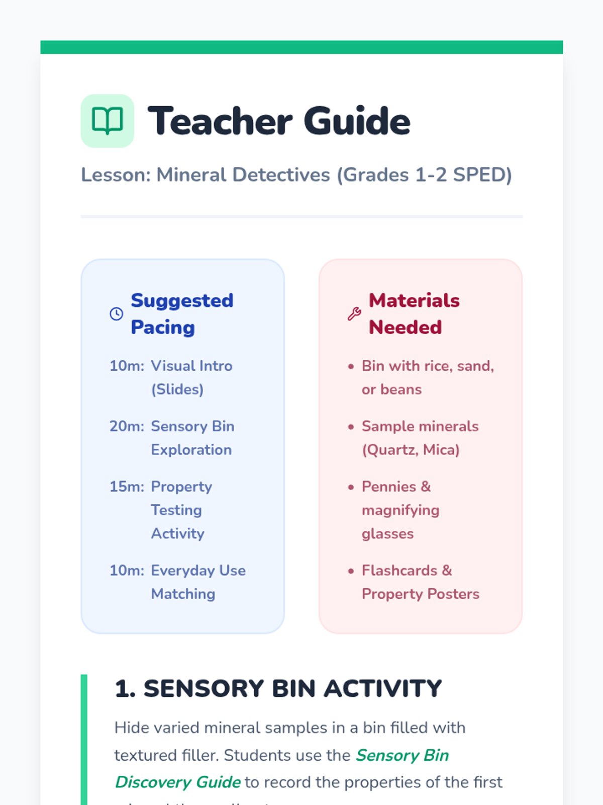 An introductory lesson on minerals focusing on sensory exploration, property identification, and everyday uses with heavy visual and tactile support.