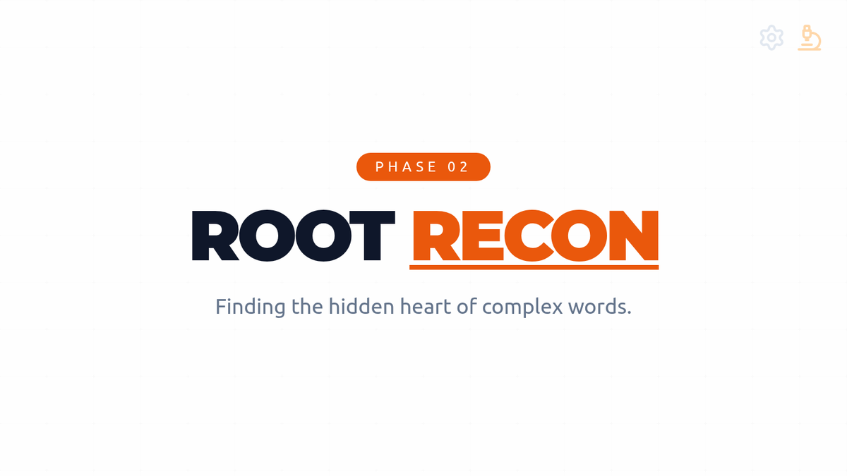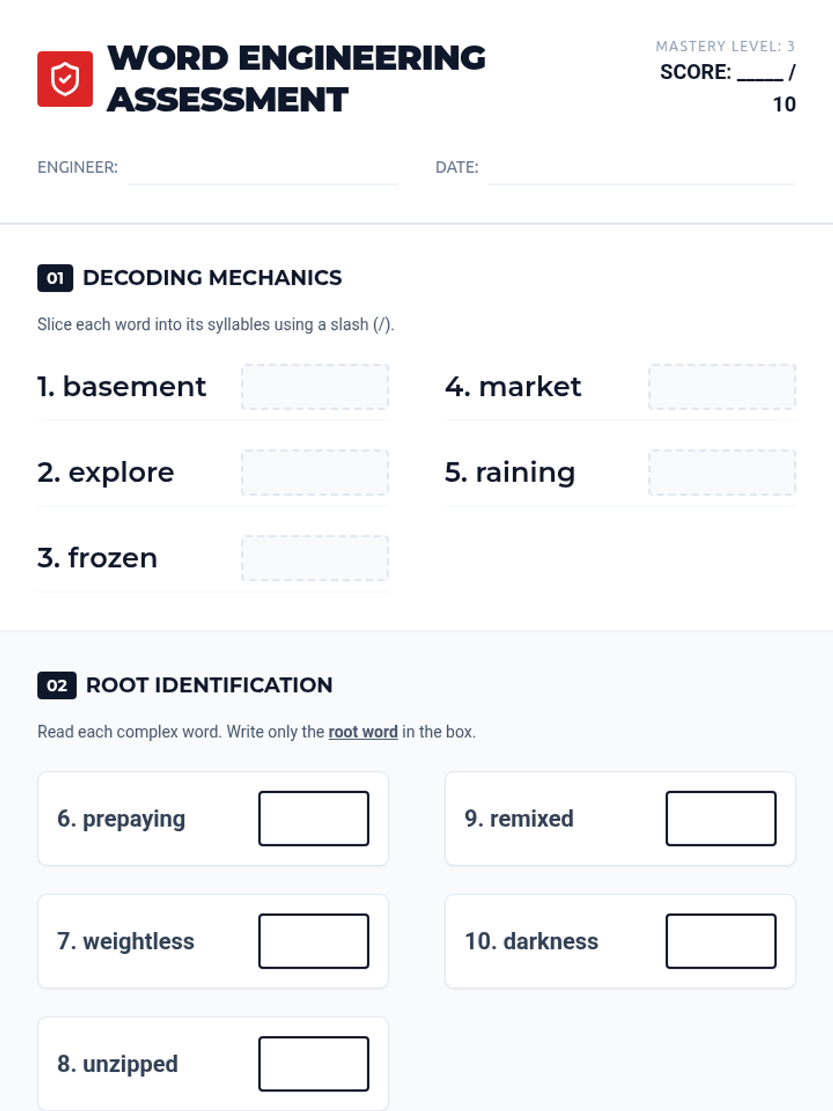 A cumulative review and assessment where students apply both slicing and root identification skills to complex, grade-appropriate vocabulary.
